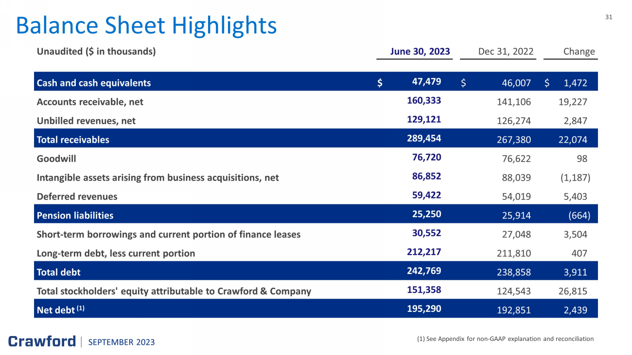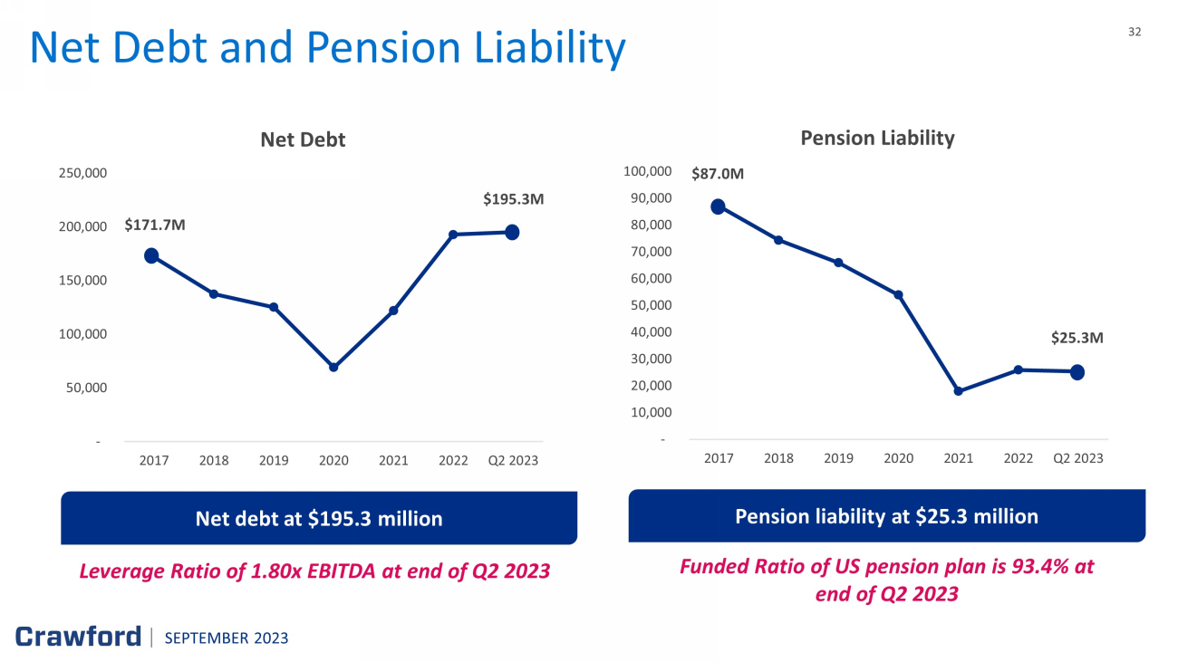 31 31 Balance Sheet Highlights (1) See Appendix for non - GAAP explanation and reconciliation Unaudited ($ in thousands) June 30, 2023 Dec 31, 20 22 Change Cash and cash equivalents $ 47,479 $ 46,007 $ 1,472 Accounts receivable, net 160,333 141,106 19,227 Unbilled revenues, net 129,121 126,274 2,847 Total receivables 289,454 267,380 22,074 Goodwill 76,720 76,622 98 Intangible assets arising from business acquisitions, net 86,852 88,039 (1,187 ) Deferred revenues 59,422 54,019 5,403 Pension liabilities 25,250 25,914 (664 ) Short - term borrowings and current portion of finance leases 30,552 27,048 3,504 Long - term debt, less current portion 212,217 211,810 407 Total debt 242,769 238,858 3,911 Total stockholders' equity attributable to Crawford & Company 151,358 124,543 26,815 Net debt (1) 195,290 192,851 2,439 SEPTEMBER 2023