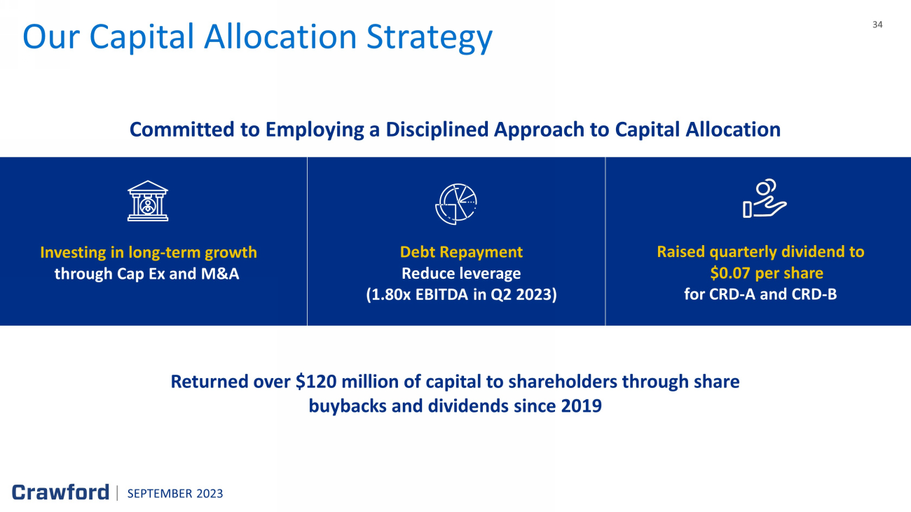 33 33 Operating and Free Cash Flow (1) See Appendix for non - GAAP explanation and reconciliation Unaudited ($ in thousands) 20 23 20 22 Change Net Income Attributable to Shareholders of Crawford & Company $ 19,108 $ 10,926 $ 8,182 Depreciation and Other Non - Cash Operating Items 20,817 21,932 (1,115 ) Loss (Gain) on Disposals of Property and Equipment, net 116 (1,544) 1,660 Contingent Earnout Adjustments 973 2,359 (1,386 ) Billed Receivables Change (15,107 ) 1,241 (16,348 ) Unbilled Receivables Change 1,828 (27,557 ) 29,385 Change in Accrued Compensation , 401K , and Other Payroll (5,563 ) (16,805 ) 11,242 Change in Accrued and Prepaid Income Taxes (1,217 ) (5,275 ) 4,058 Other Working Capital Changes 7,239 2,296 4,943 U.K. Pension Contributions ( 1,025 ) (325 ) (700 ) Cash Flows from Operating Activities 27,169 (12,752 ) 39,921 Property & Equipment Purchases, net (1,914 ) (3,123 ) 1,209 Capitalized Software (internal and external costs) ( 16,031 ) (12,561 ) (3,470 ) Free Cash Flow (1) $ 9,224 $ (28,436 ) $ 37,660 SEPTEMBER 2023