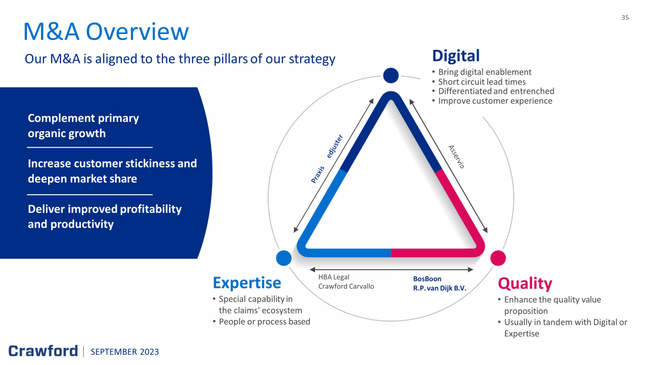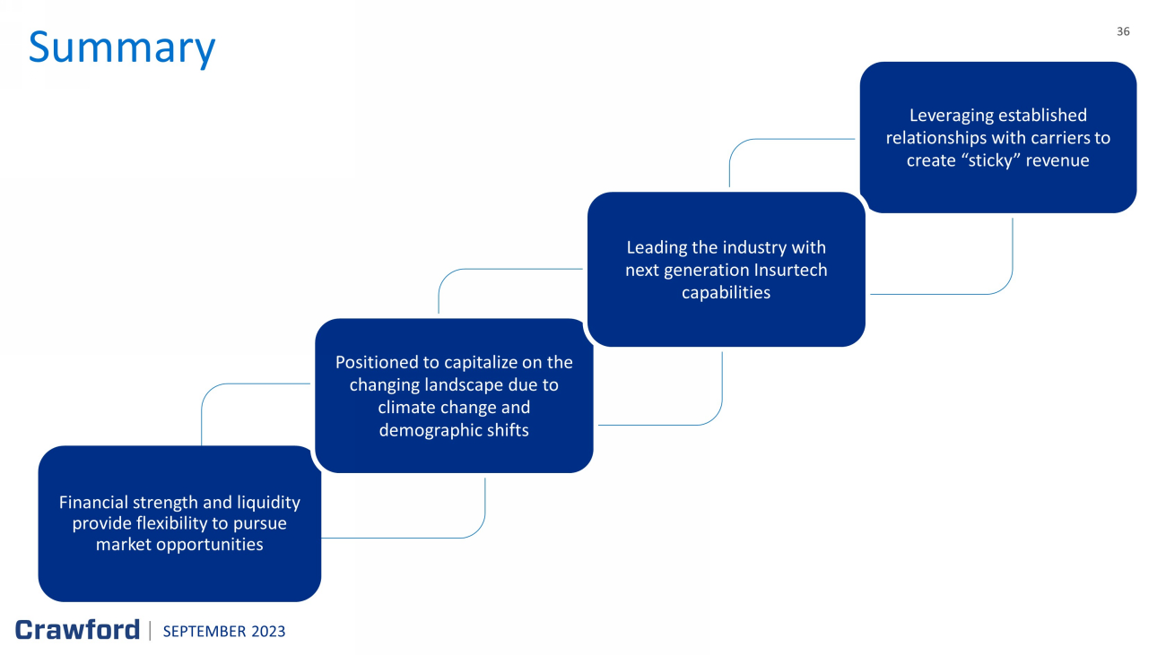 35 M&A Overview Our M&A is aligned to the three pillars of our strategy Digital • Bring digital enablement • Short circuit lead times • Differentiated and entrenched • Improve customer experience Quality • Enhance the quality value proposition • Usually in tandem with Digital or Expertise Expertise • Special capability in the claims ' ecosystem • People or process based HBA Legal Crawford Carvallo BosBoon R.P. van Dijk B.V. Complement primary organic growth Increase customer stickiness and deepen market share Deliver improved profitability and productivity SEPTEMBER 2023