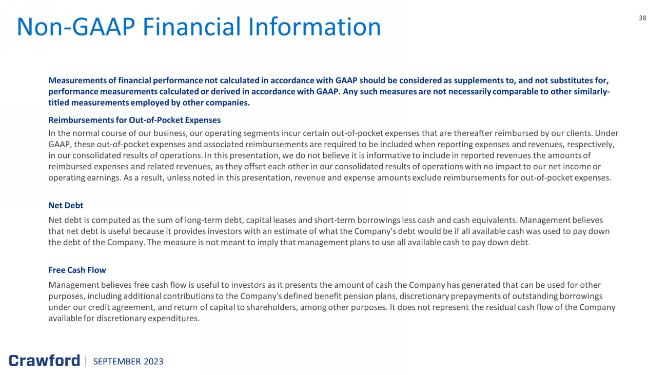38 38 Non - GAAP Financial Information Measurements of financial performance not calculated in accordance with GAAP should be considered as supplements to, and not sub stitutes for, performance measurements calculated or derived in accordance with GAAP. Any such measures are not necessarily comparable to o the r similarly - titled measurements employed by other companies. Reimbursements for Out - of - Pocket Expenses In the normal course of our business, our operating segments incur certain out - of - pocket expenses that are thereafter reimbursed by our clients. Under GAAP, these out - of - pocket expenses and associated reimbursements are required to be included when reporting expenses and revenue s, respectively, in our consolidated results of operations. In this presentation, we do not believe it is informative to include in reported r eve nues the amounts of reimbursed expenses and related revenues, as they offset each other in our consolidated results of operations with no impact to our net income or operating earnings. As a result, unless noted in this presentation, revenue and expense amounts exclude reimbursements for ou t - o f - pocket expenses. Net Debt Net debt is computed as the sum of long - term debt, capital leases and short - term borrowings less cash and cash equivalents. Mana gement believes that net debt is useful because it provides investors with an estimate of what the Company's debt would be if all available c ash was used to pay down the debt of the Company. The measure is not meant to imply that management plans to use all available cash to pay down debt . Free Cash Flow Management believes free cash flow is useful to investors as it presents the amount of cash the Company has generated that ca n b e used for other purposes, including additional contributions to the Company's defined benefit pension plans, discretionary prepayments of out sta nding borrowings under our credit agreement, and return of capital to shareholders, among other purposes. It does not represent the residual c ash flow of the Company available for discretionary expenditures. SEPTEMBER 2023