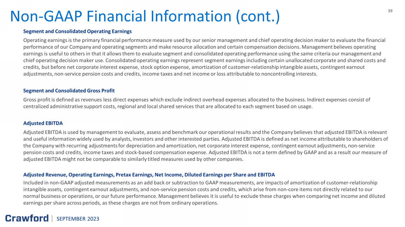 39 39 Non - GAAP Financial Information (cont.) Segment and Consolidated Operating Earnings Operating earnings is the primary financial performance measure used by our senior management and chief operating decision ma ker to evaluate the financial performance of our Company and operating segments and make resource allocation and certain compensation decisions. Management be lieves operating earnings is useful to others in that it allows them to evaluate segment and consolidated operating performance using the same cr iteria our management and chief operating decision maker use. Consolidated operating earnings represent segment earnings including certain unallocated cor porate and shared costs and credits, but before net corporate interest expense, stock option expense, amortization of customer - relationship intangible asset s, contingent earnout adjustments, non - service pension costs and credits, income taxes and net income or loss attributable to noncontrolling interests . Segment and Consolidated Gross Profit Gross profit is defined as revenues less direct expenses which exclude indirect overhead expenses allocated to the business. Ind irect expenses consist of centralized administrative support costs, regional and local shared services that are allocated to each segment based on usag e. Adjusted EBITDA Adjusted EBITDA is used by management to evaluate, assess and benchmark our operational results and the Company believes that ad justed EBITDA is relevant and useful information widely used by analysts, investors and other interested parties. Adjusted EBITDA is defined as net inc ome attributable to shareholders of the Company with recurring adjustments for depreciation and amortization, net corporate interest expense, contingent earnout adj ustments, non - service pension costs and credits, income taxes and stock - based compensation expense. Adjusted EBITDA is not a term defined by GAAP and as a result our measure of adjusted EBITDA might not be comparable to similarly titled measures used by other companies. Adjusted Revenue, Operating Earnings, Pretax Earnings, Net Income, Diluted Earnings per Share and EBITDA Included in non - GAAP adjusted measurements as an add back or subtraction to GAAP measurements, are impacts of amortization of cu stomer - relationship intangible assets, contingent earnout adjustments, and non - service pension costs and credits, which arise from non - core items no t directly related to our normal business or operations, or our future performance. Management believes it is useful to exclude these charges when comp ari ng net income and diluted earnings per share across periods, as these charges are not from ordinary operations. SEPTEMBER 2023