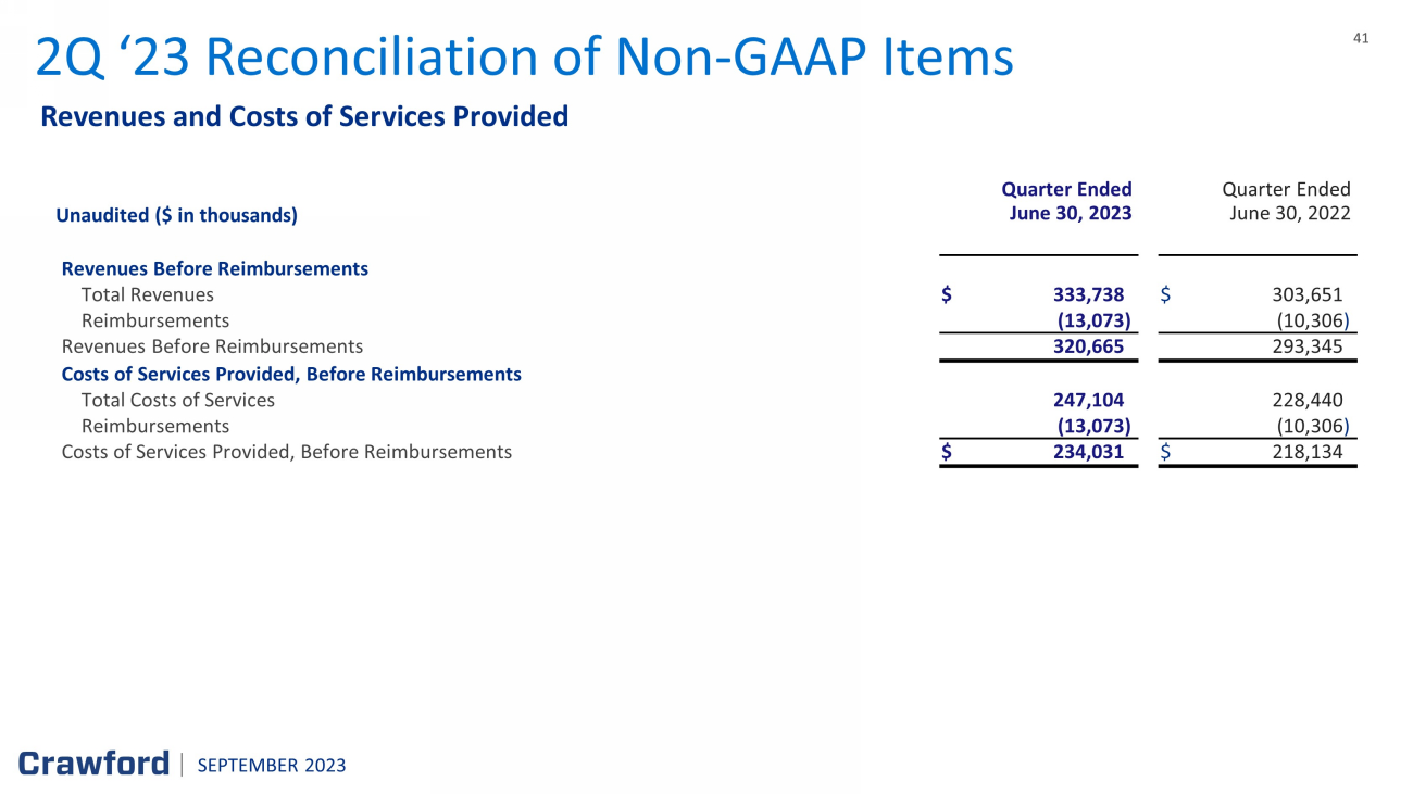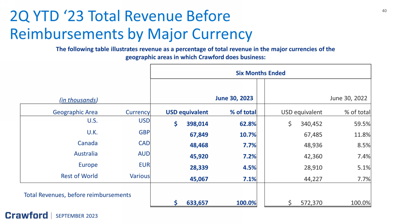 40 40 The following table illustrates revenue as a percentage of total revenue in the major currencies of the geographic areas in which Crawford does business: 2Q YTD ‘23 Total Revenue Before Reimbursements by Major Currency Six Months Ended ( in thousands ) June 30, 2023 June 30, 2022 Geographic Area Currency USD equivalent % of total USD equivalent % of total U.S. USD $ 398,014 62.8% $ 340,452 59.5% U.K. GBP 67,849 10.7% 67,485 11.8% Canada CAD 48,468 7.7% 48,936 8.5% Australia AUD 45,920 7.2 % 42,360 7.4% Europe EUR 28,339 4.5% 28,910 5.1% Rest of World Various 45,067 7.1% 44,227 7.7% Total Revenues, before reimbursements $ 633,657 100.0% $ 572,370 100.0% SEPTEMBER 2023