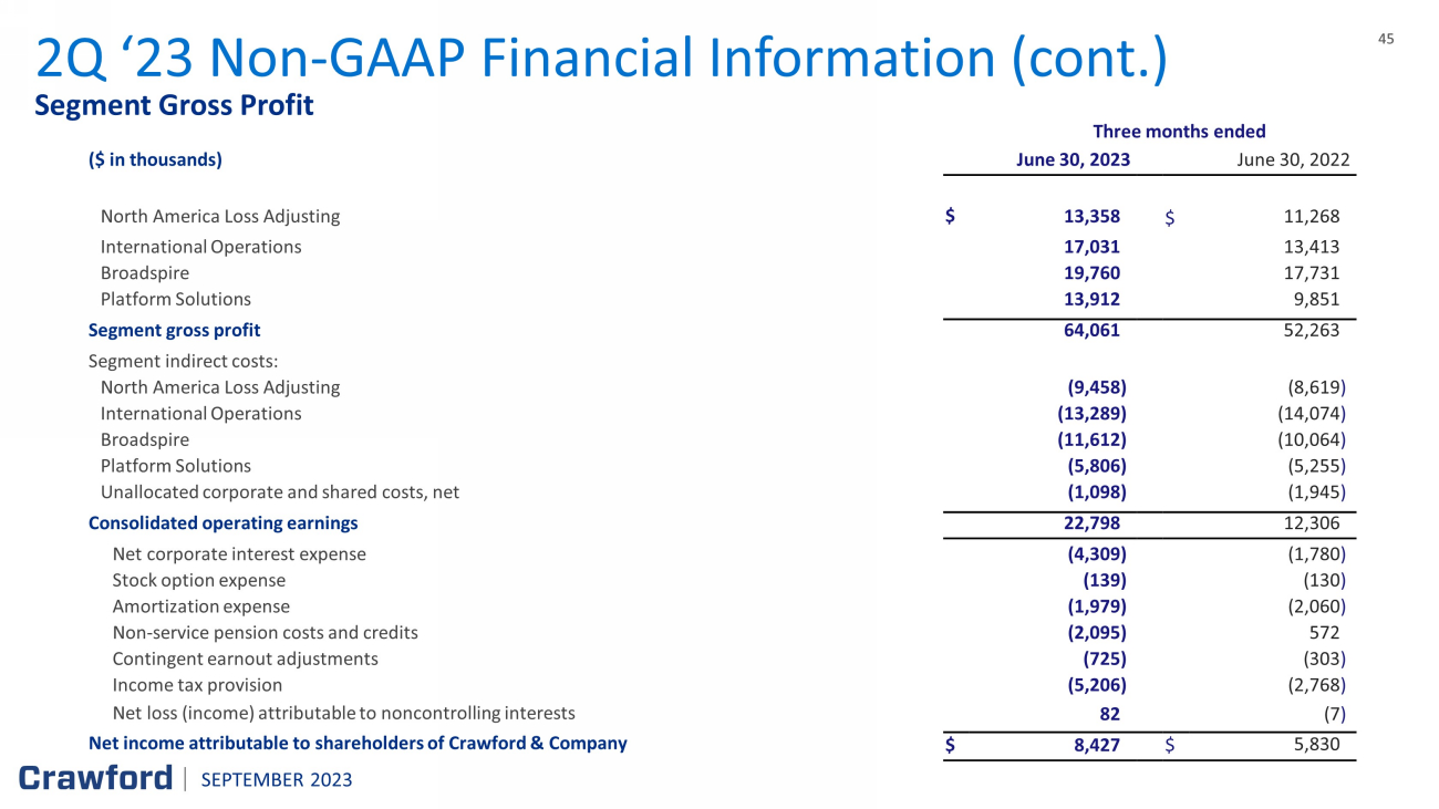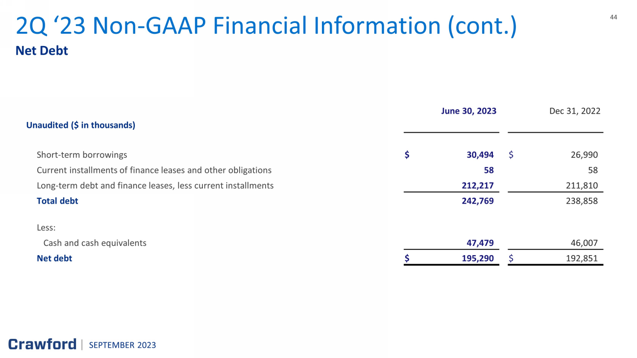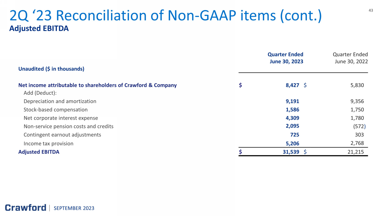 43 43 Adjusted EBITDA 2Q ‘23 Reconciliation of Non - GAAP items (cont.) Quarter Ended Quarter Ended June 30 , 2023 June 30 , 2022 Unaudited ($ in thousands) Net income attributable to shareholders of Crawford & Company $ 8,427 $ 5,830 Add (Deduct) : Depreciation and amortization 9,191 9,356 Stock - based compensation 1,586 1,750 Net corporate interest expense 4,309 1,780 Non - service pension costs and credits 2,095 (572 ) Contingent earnout adjustments 725 303 Income tax provision 5,206 2,768 Adjusted EBITDA $ 31,539 $ 21,215 SEPTEMBER 2023