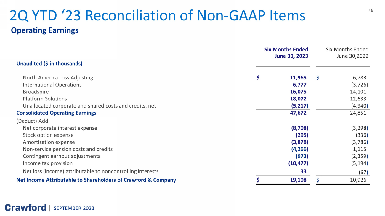 45 45 Segment Gross Profit 2Q ‘23 Non - GAAP Financial Information (cont.) Three months ended ( $ in thousands) June 30, 2023 June 30, 2022 North America Loss Adjusting $ 13,358 $ 11,268 International Operations 17,031 13,413 Broadspire 19,760 17,731 Platform Solutions 13,912 9,851 Segment gross profit 64,061 52,263 Segment indirect costs: North America Loss Adjusting ( 9,458 ) ( 8,619 ) International Operations ( 13,289 ) ( 14,074 ) Broadspire (11,612 ) ( 10,064 ) Platform Solutions (5,806 ) (5,255 ) Unallocated corporate and shared costs, net (1,098 ) (1,945 ) Consolidated operating earnings 22,798 12,306 Net corporate interest expense ( 4,309 ) ( 1,780 ) Stock option expense ( 139 ) ( 130 ) Amortization expense (1,979 ) ( 2,060 ) Non - service pension costs and credits (2,095 ) 572 Contingent earnout adjustments (725 ) (303 ) Income tax provision (5,206 ) (2,768 ) Net loss (income) attributable to noncontrolling interests 82 (7 ) Net income attributable to shareholders of Crawford & Company $ 8,427 $ 5,830 SEPTEMBER 2023