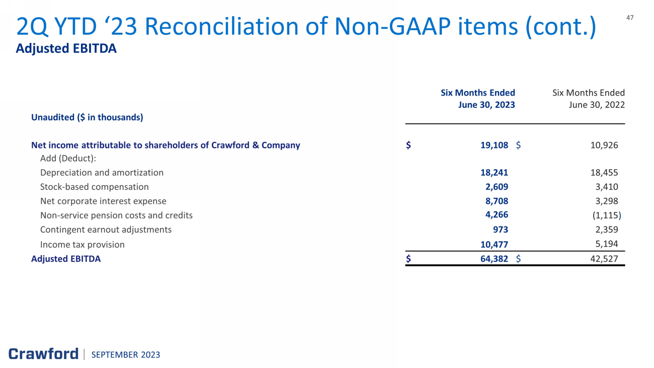 46 46 Operating Earnings 2Q YTD ‘23 Reconciliation of Non - GAAP Items Six Months Ended Six Months Ended June 30 , 2023 June 30,2022 Unaudited ($ in thousands) North America Loss Adjusting $ 11,965 $ 6,783 International Operations 6,777 (3,726 ) Broadspire 16,075 14,101 Platform Solutions 18,072 12,633 Unallocated corporate and shared costs and credits, net (5,217 ) (4,940 ) Consolidated Operating Earnings 47,672 24,851 (Deduct) Add: Net corporate interest expense ( 8,708 ) (3,298 ) Stock option expense ( 295 ) ( 336 ) Amortization expense (3,878 ) ( 3,786 ) Non - service pension costs and credits (4,266 ) 1,115 Contingent earnout adjustments (973 ) (2,359 ) Income ta x provision (10,477 ) (5,194 ) Net loss (income) attributable to noncontrolling interests 33 (67 ) Net Inc ome Attributable to Shareholders of Crawford & Company $ 19,108 $ 10,926 SEPTEMBER 2023