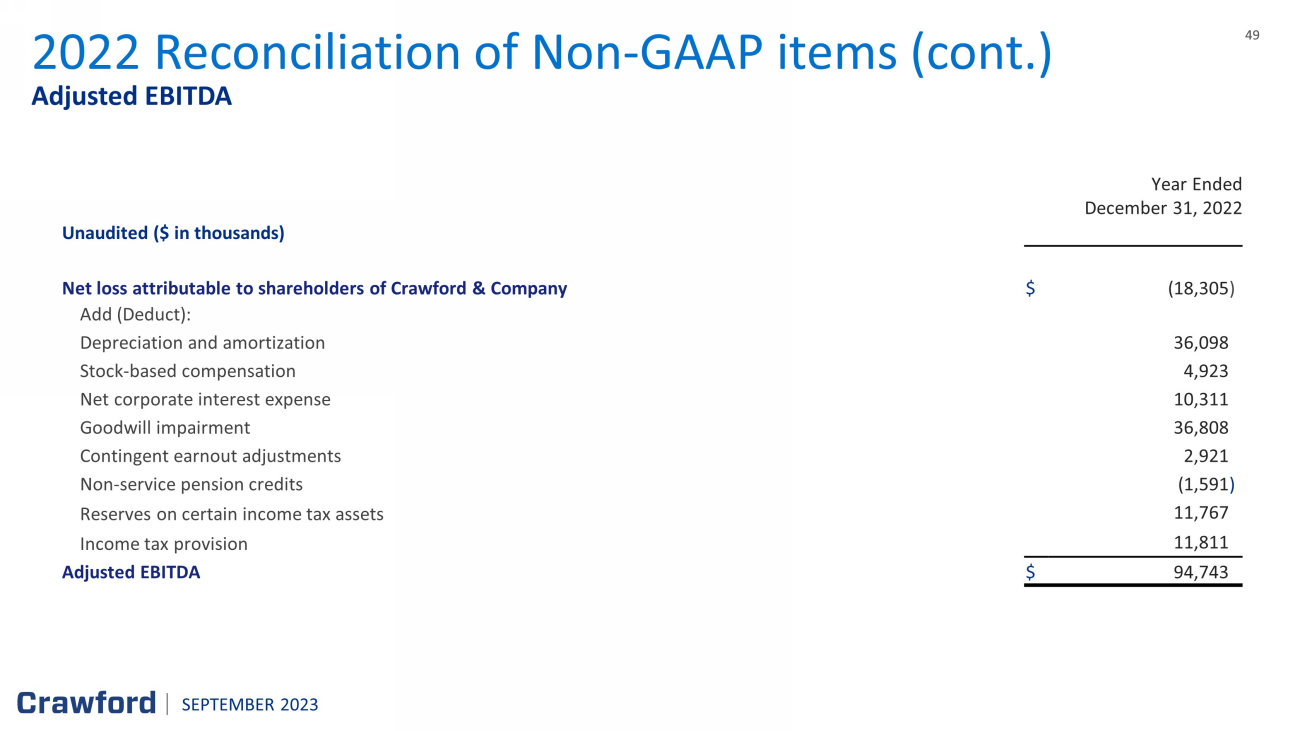 49 49 Adjusted EBITDA 2022 Reconciliation of Non - GAAP items (cont.) Year Ended December 31 , 2022 Unaudited ($ in thousands) Net loss attributable to shareholders of Crawford & Company $ (18,305 ) Add (Deduct) : Depreciation and amortization 36,098 Stock - based compensation 4,923 Net corporate interest expense 10,311 Goodwill impairment 36,808 Contingent earnout adjustments 2,921 Non - service pension credits (1,591 ) Reserves on certain income tax assets 11,767 Income tax provision 11,811 Adjusted EBITDA $ 94,743 SEPTEMBER 2023