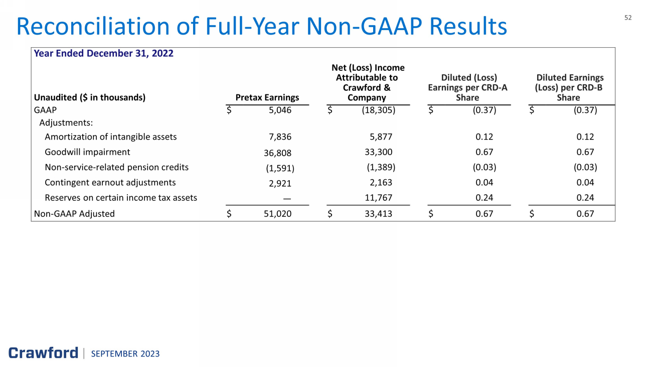 51 51 Reconciliation of Year - to - Date Non - GAAP Results Six Months Ended June 30, 2023 Unaudited ($ in thousands) Pretax Earnings Net Income Attributable to Crawford & Company Diluted Earnings per CRD - A Share (1) Diluted Earnings per CRD - B Share GAAP $ 29,552 $ 19,108 $ 0.39 $ 0.39 Adjustments: Amortization of intangible assets 3,878 2,909 0. 06 0. 06 Non - service - related pension costs 4,266 3,170 0.06 0.06 Contingent earnout adjustments 973 720 0.02 0.02 Non - GAAP Adjusted $ 38,669 $ 25,907 $ 0. 52 $ 0. 53 Six Months Ended June 30, 2022 Unaudited ($ in thousands) Pretax Earnings Net Income Attributable to Crawford & Company Diluted Earnings per CRD - A Share Diluted Earnings per CRD - B Share GAAP $ 16,187 $ 10,926 $ 0.22 $ 0.22 Adjustments: Amortization of intangible assets 3,786 2,840 0.06 0.06 Non - service - related pension credits (1,115 ) (865 ) (0.02 ) (0.02 ) Contingent earnout adjustments 2,359 1,747 0.03 0.03 Non - GAAP Adjusted $ 21,217 $ 14,648 $ 0. 29 $ 0.29 (1) Sum of reconciling items may differ from total due to rounding of individual components SEPTEMBER 2023
