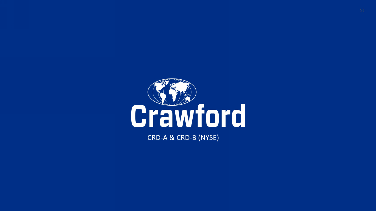 52 52 Reconciliation of Full - Year Non - GAAP Results Year Ended December 31, 2022 Unaudited ($ in thousands) Pretax Earnings Net (Loss) Income Attributable to Crawford & Company Diluted (Loss) Earnings per CRD - A Share Diluted Earnings (Loss) per CRD - B Share GAAP $ 5,046 $ (18,305 ) $ (0.37 ) $ (0.37 ) Adjustments: Amortization of intangible assets 7,836 5,877 0. 12 0. 12 Goodwill impairment 36,808 33,300 0.67 0.67 Non - service - related pension credits (1,591 ) (1,389 ) (0.03 ) (0.03 ) Contingent earnout adjustments 2,921 2,163 0.04 0.04 Reserves on certain income tax assets — 11,767 0.24 0.24 Non - GAAP Adjusted $ 51,020 $ 33,413 $ 0. 67 $ 0. 67 SEPTEMBER 2023