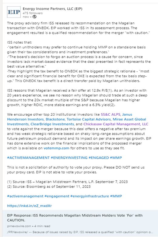 The proxy advisory firm ISS released its recommendation on the Magellan transaction with ONEOK. EIP worked with ISS in its assessment process. The engagement resulted is a qualified recommendation for the merger “with caution.”