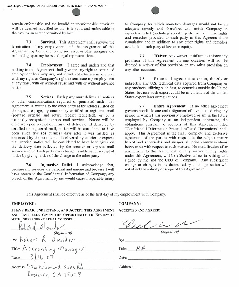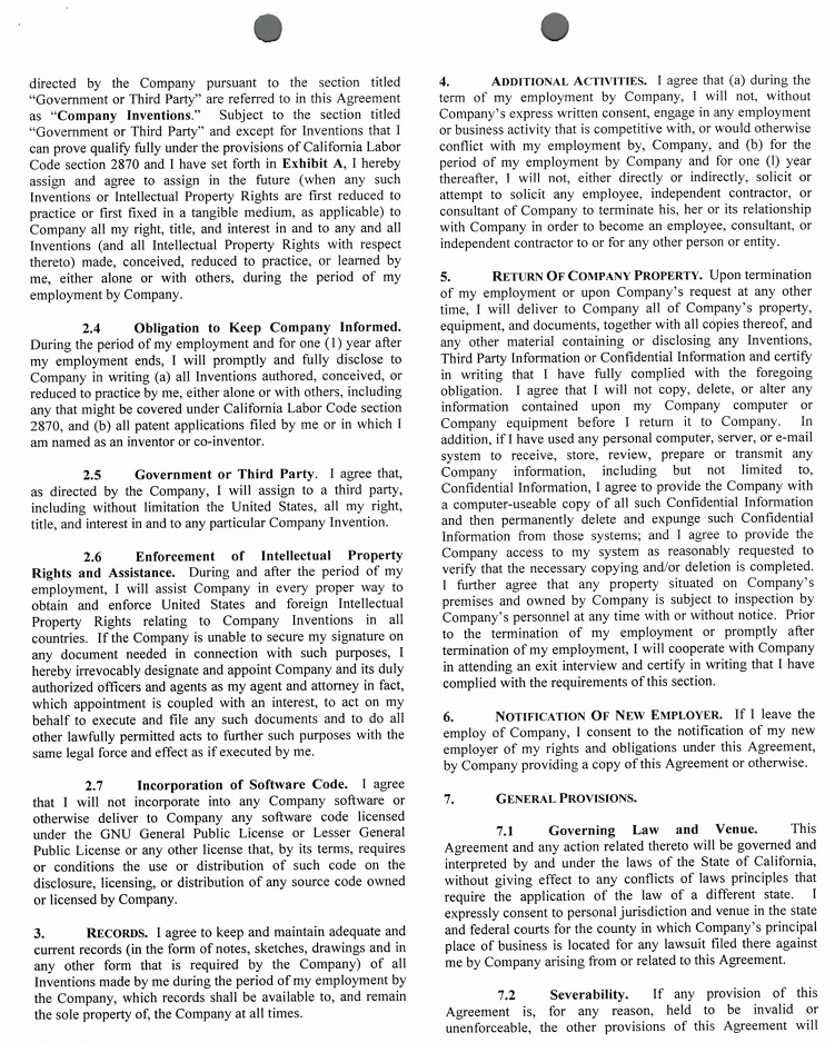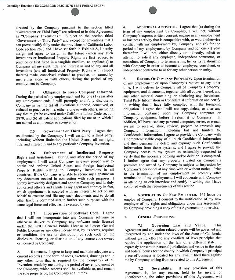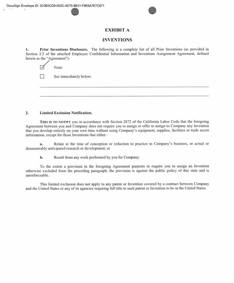 3.1 Confidential Information Agreement. As a condition of employment, Executive agrees to execute and abide by the Executive Confidential Information and Inventions Agreement attached hereto as Exhibit A.