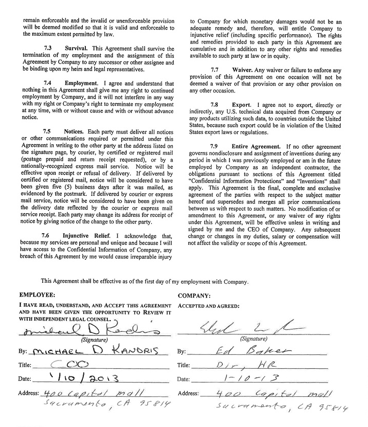 To ensure the timely and economical resolution of disputes that may arise in connection with Executive’s employment with the Company, Executive and the Company agree that any and all disputes, claims, or causes of action arising from or relating to the enforcement, breach, performance, negotiation, execution, or interpretation of this Agreement, Executive’s employment, or the termination of Executive’s employment, shall be resolved to the fullest extent permitted by law by final, binding and confidential arbitration, by a single arbitrator, in Sacramento, California, conducted by JAMS under the then applicable JAMS rules. By agreeing to this arbitration procedure, both Executive and the Company waive the right to resolve any such dispute through a trial by jury or judge or administrative proceeding. The arbitrator shall: (a) have the authority to compel adequate discovery for the resolution of the dispute and to award such relief as would otherwise be permitted by law; and (b) issue a written arbitration decision, to include the arbitrator’s essential findings and conclusions and a statement of the award. The arbitrator shall be authorized to award any or all remedies that Executive or the Company would be entitled to seek in a court of law. The Company shall pay all JAMS’ arbitration fees in excess of the amount of court fees that would be required if the dispute were decided in a court of law. Nothing in this Agreement is intended to prevent either Executive or the Company from obtaining injunctive relief in court to prevent irreparable harm pending the conclusion of any such arbitration.