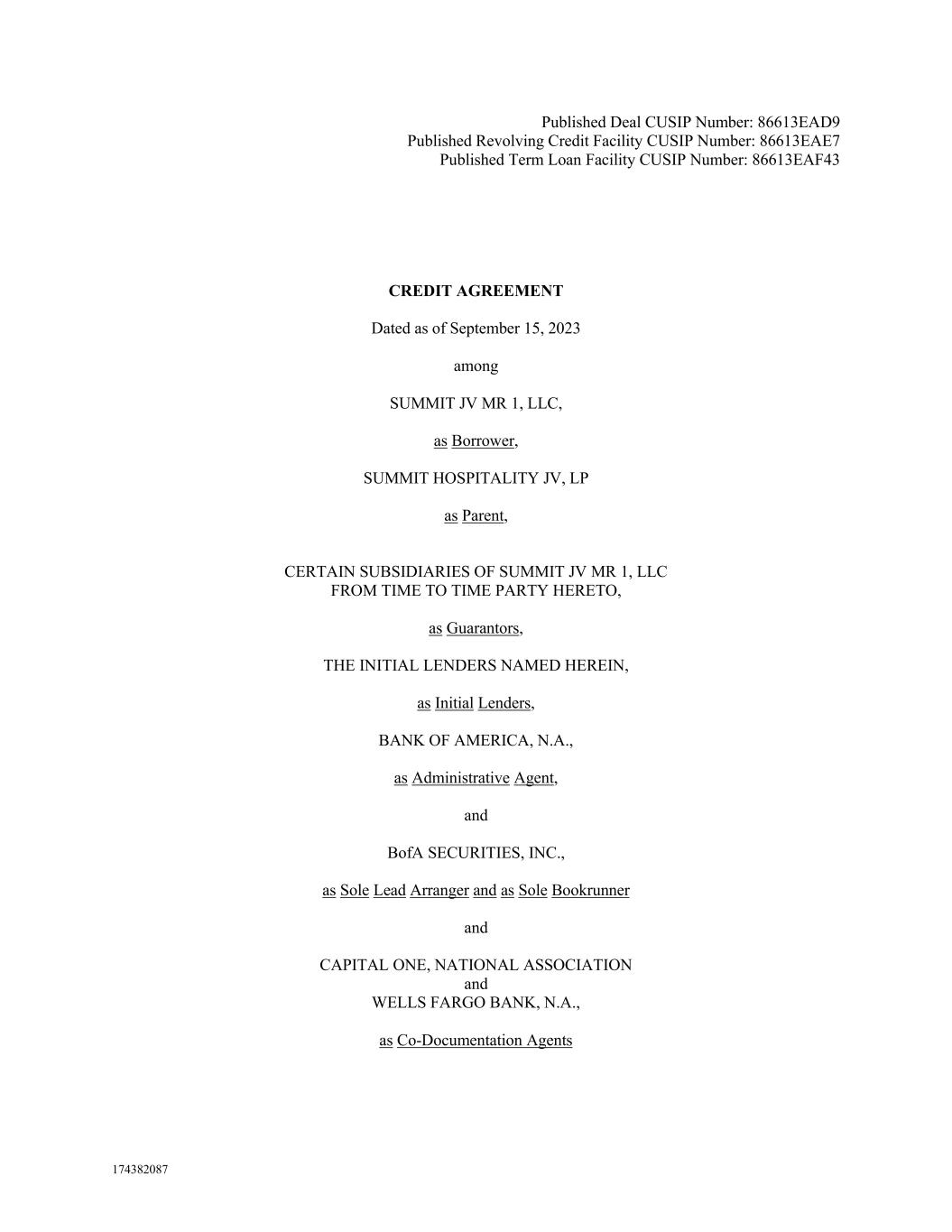174382087 Published Deal CUSIP Number: 86613EAD9 Published Revolving Credit Facility CUSIP Number: 86613EAE7 Published Term Loan Facility CUSIP Number: 86613EAF43 CREDIT AGREEMENT Dated as of September 15, 2023 among SUMMIT JV MR 1, LLC, as Borrower, SUMMIT HOSPITALITY JV, LP as Parent, CERTAIN SUBSIDIARIES OF SUMMIT JV MR 1, LLC FROM TIME TO TIME PARTY HERETO, as Guarantors, THE INITIAL LENDERS NAMED HEREIN, as Initial Lenders, BANK OF AMERICA, N.A., as Administrative Agent, and BofA SECURITIES, INC., as Sole Lead Arranger and as Sole Bookrunner and CAPITAL ONE, NATIONAL ASSOCIATION and WELLS FARGO BANK, N.A., as Co-Documentation Agents