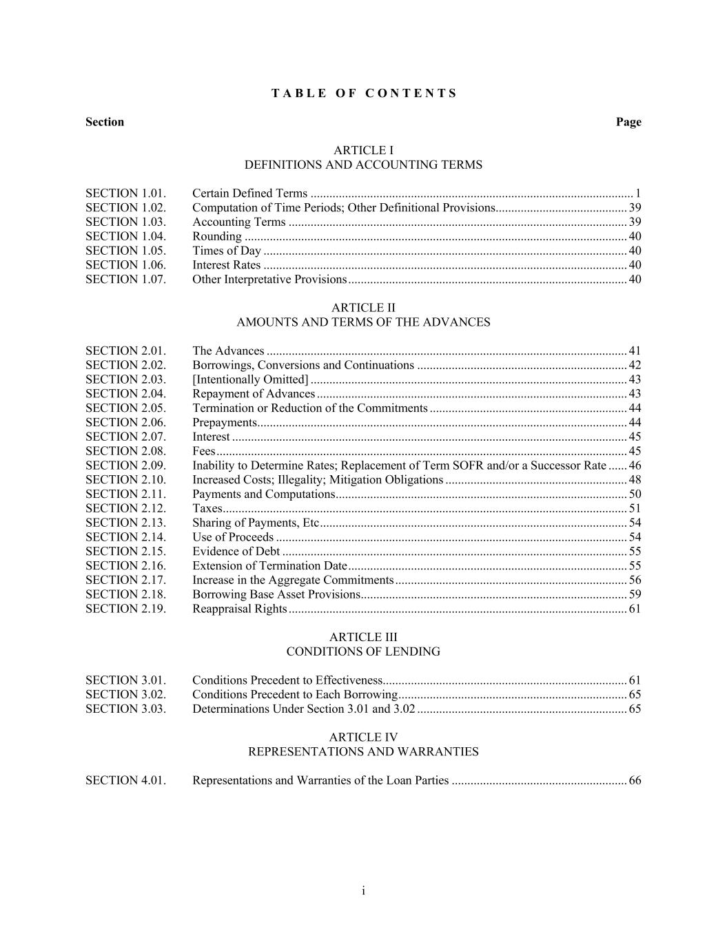 i T A B L E O F C O N T E N T S Section Page ARTICLE I DEFINITIONS AND ACCOUNTING TERMS SECTION 1.01. Certain Defined Terms ....................................................................................................... 1 SECTION 1.02. Computation of Time Periods; Other Definitional Provisions .......................................... 39 SECTION 1.03. Accounting Terms ............................................................................................................ 39 SECTION 1.04. Rounding .......................................................................................................................... 40 SECTION 1.05. Times of Day .................................................................................................................... 40 SECTION 1.06. Interest Rates .................................................................................................................... 40 SECTION 1.07. Other Interpretative Provisions ......................................................................................... 40 ARTICLE II AMOUNTS AND TERMS OF THE ADVANCES SECTION 2.01. The Advances ................................................................................................................... 41 SECTION 2.02. Borrowings, Conversions and Continuations ................................................................... 42 SECTION 2.03. [Intentionally Omitted] ..................................................................................................... 43 SECTION 2.04. Repayment of Advances ................................................................................................... 43 SECTION 2.05. Termination or Reduction of the Commitments ............................................................... 44 SECTION 2.06. Prepayments ...................................................................................................................... 44 SECTION 2.07. Interest .............................................................................................................................. 45 SECTION 2.08. Fees ................................................................................................................................... 45 SECTION 2.09. Inability to Determine Rates; Replacement of Term SOFR and/or a Successor Rate ...... 46 SECTION 2.10. Increased Costs; Illegality; Mitigation Obligations .......................................................... 48 SECTION 2.11. Payments and Computations ............................................................................................. 50 SECTION 2.12. Taxes ................................................................................................................................. 51 SECTION 2.13. Sharing of Payments, Etc .................................................................................................. 54 SECTION 2.14. Use of Proceeds ................................................................................................................ 54 SECTION 2.15. Evidence of Debt .............................................................................................................. 55 SECTION 2.16. Extension of Termination Date ......................................................................................... 55 SECTION 2.17. Increase in the Aggregate Commitments .......................................................................... 56 SECTION 2.18. Borrowing Base Asset Provisions ..................................................................................... 59 SECTION 2.19. Reappraisal Rights ............................................................................................................ 61 ARTICLE III CONDITIONS OF LENDING SECTION 3.01. Conditions Precedent to Effectiveness.............................................................................. 61 SECTION 3.02. Conditions Precedent to Each Borrowing ......................................................................... 65 SECTION 3.03. Determinations Under Section 3.01 and 3.02 ................................................................... 65 ARTICLE IV REPRESENTATIONS AND WARRANTIES SECTION 4.01. Representations and Warranties of the Loan Parties ........................................................ 66