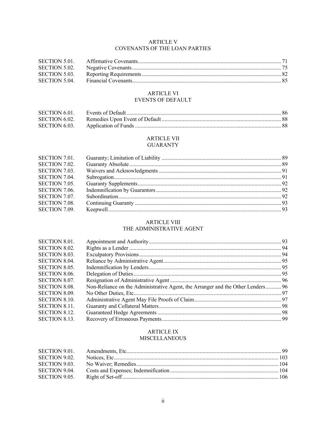 ii ARTICLE V COVENANTS OF THE LOAN PARTIES SECTION 5.01. Affirmative Covenants ...................................................................................................... 71 SECTION 5.02. Negative Covenants .......................................................................................................... 75 SECTION 5.03. Reporting Requirements ................................................................................................... 82 SECTION 5.04. Financial Covenants .......................................................................................................... 85 ARTICLE VI EVENTS OF DEFAULT SECTION 6.01. Events of Default .............................................................................................................. 86 SECTION 6.02. Remedies Upon Event of Default ..................................................................................... 88 SECTION 6.03. Application of Funds ........................................................................................................ 88 ARTICLE VII GUARANTY SECTION 7.01. Guaranty; Limitation of Liability ..................................................................................... 89 SECTION 7.02. Guaranty Absolute ............................................................................................................ 89 SECTION 7.03. Waivers and Acknowledgments ....................................................................................... 91 SECTION 7.04. Subrogation ....................................................................................................................... 91 SECTION 7.05. Guaranty Supplements ...................................................................................................... 92 SECTION 7.06. Indemnification by Guarantors ......................................................................................... 92 SECTION 7.07. Subordination .................................................................................................................... 92 SECTION 7.08. Continuing Guaranty ........................................................................................................ 93 SECTION 7.09. Keepwell ........................................................................................................................... 93 ARTICLE VIII THE ADMINISTRATIVE AGENT SECTION 8.01. Appointment and Authority .............................................................................................. 93 SECTION 8.02. Rights as a Lender ............................................................................................................ 94 SECTION 8.03. Exculpatory Provisions ..................................................................................................... 94 SECTION 8.04. Reliance by Administrative Agent .................................................................................... 95 SECTION 8.05. Indemnification by Lenders .............................................................................................. 95 SECTION 8.06. Delegation of Duties ......................................................................................................... 95 SECTION 8.07. Resignation of Administrative Agent ............................................................................... 96 SECTION 8.08. Non-Reliance on the Administrative Agent, the Arranger and the Other Lenders ........... 96 SECTION 8.09. No Other Duties, Etc ......................................................................................................... 97 SECTION 8.10. Administrative Agent May File Proofs of Claim .............................................................. 97 SECTION 8.11. Guaranty and Collateral Matters ....................................................................................... 98 SECTION 8.12. Guaranteed Hedge Agreements ........................................................................................ 98 SECTION 8.13. Recovery of Erroneous Payments ..................................................................................... 99 ARTICLE IX MISCELLANEOUS SECTION 9.01. Amendments, Etc .............................................................................................................. 99 SECTION 9.02. Notices, Etc ..................................................................................................................... 103 SECTION 9.03. No Waiver; Remedies ..................................................................................................... 104 SECTION 9.04. Costs and Expenses; Indemnification ............................................................................. 104 SECTION 9.05. Right of Set-off ............................................................................................................... 106
