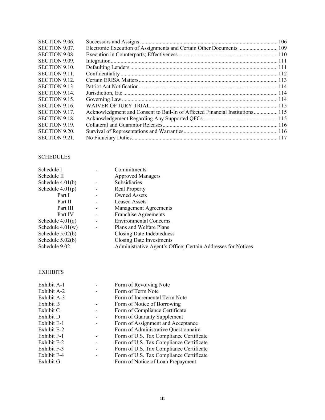 iii SECTION 9.06. Successors and Assigns .................................................................................................. 106 SECTION 9.07. Electronic Execution of Assignments and Certain Other Documents ............................ 109 SECTION 9.08. Execution in Counterparts; Effectiveness ....................................................................... 110 SECTION 9.09. Integration ....................................................................................................................... 111 SECTION 9.10. Defaulting Lenders ......................................................................................................... 111 SECTION 9.11. Confidentiality ................................................................................................................ 112 SECTION 9.12. Certain ERISA Matters ................................................................................................... 113 SECTION 9.13. Patriot Act Notification ................................................................................................... 114 SECTION 9.14. Jurisdiction, Etc .............................................................................................................. 114 SECTION 9.15. Governing Law ............................................................................................................... 114 SECTION 9.16. WAIVER OF JURY TRIAL........................................................................................... 115 SECTION 9.17. Acknowledgment and Consent to Bail-In of Affected Financial Institutions ................. 115 SECTION 9.18. Acknowledgement Regarding Any Supported QFCs ..................................................... 115 SECTION 9.19. Collateral and Guarantor Releases .................................................................................. 116 SECTION 9.20. Survival of Representations and Warranties ................................................................... 116 SECTION 9.21. No Fiduciary Duties ........................................................................................................ 117 SCHEDULES Schedule I - Commitments Schedule II Approved Managers Schedule 4.01(b) - Subsidiaries Schedule 4.01(p) - Real Property Part I - Owned Assets Part II - Leased Assets Part III - Management Agreements Part IV - Franchise Agreements Schedule 4.01(q) - Environmental Concerns Schedule 4.01(w) - Plans and Welfare Plans Schedule 5.02(b) Closing Date Indebtedness Schedule 5.02(b) Closing Date Investments Schedule 9.02 Administrative Agent’s Office; Certain Addresses for Notices EXHIBITS Exhibit A-1 - Form of Revolving Note Exhibit A-2 - Form of Term Note Exhibit A-3 Form of Incremental Term Note Exhibit B - Form of Notice of Borrowing Exhibit C - Form of Compliance Certificate Exhibit D - Form of Guaranty Supplement Exhibit E-1 - Form of Assignment and Acceptance Exhibit E-2 Form of Administrative Questionnaire Exhibit F-1 - Form of U.S. Tax Compliance Certificate Exhibit F-2 - Form of U.S. Tax Compliance Certificate Exhibit F-3 - Form of U.S. Tax Compliance Certificate Exhibit F-4 - Form of U.S. Tax Compliance Certificate Exhibit G Form of Notice of Loan Prepayment