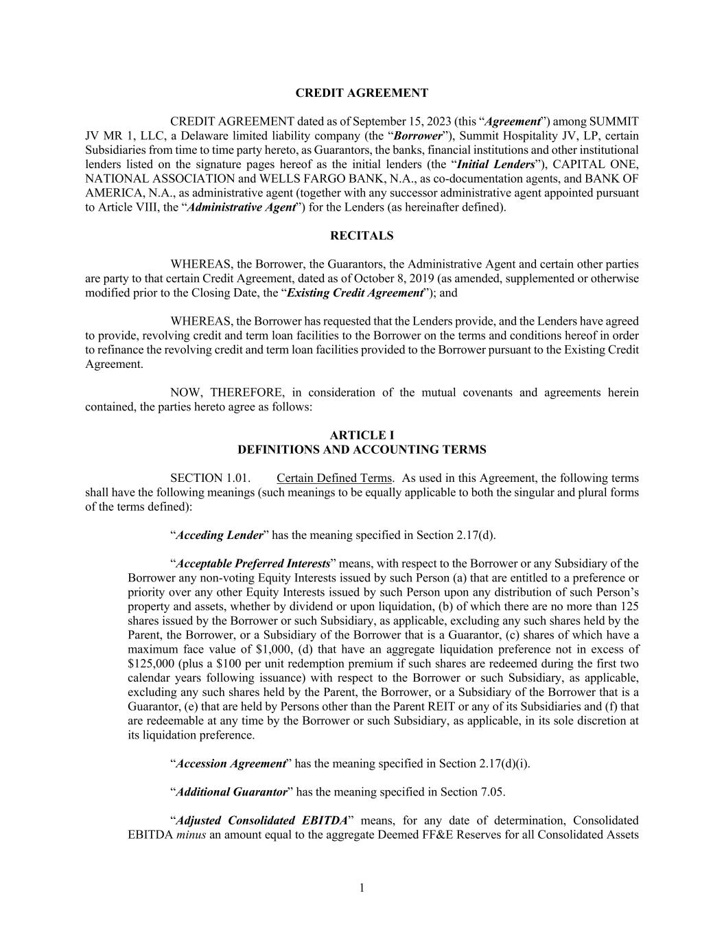 1 CREDIT AGREEMENT CREDIT AGREEMENT dated as of September 15, 2023 (this “Agreement”) among SUMMIT JV MR 1, LLC, a Delaware limited liability company (the “Borrower”), Summit Hospitality JV, LP, certain Subsidiaries from time to time party hereto, as Guarantors, the banks, financial institutions and other institutional lenders listed on the signature pages hereof as the initial lenders (the “Initial Lenders”), CAPITAL ONE, NATIONAL ASSOCIATION and WELLS FARGO BANK, N.A., as co-documentation agents, and BANK OF AMERICA, N.A., as administrative agent (together with any successor administrative agent appointed pursuant to Article VIII, the “Administrative Agent”) for the Lenders (as hereinafter defined). RECITALS WHEREAS, the Borrower, the Guarantors, the Administrative Agent and certain other parties are party to that certain Credit Agreement, dated as of October 8, 2019 (as amended, supplemented or otherwise modified prior to the Closing Date, the “Existing Credit Agreement”); and WHEREAS, the Borrower has requested that the Lenders provide, and the Lenders have agreed to provide, revolving credit and term loan facilities to the Borrower on the terms and conditions hereof in order to refinance the revolving credit and term loan facilities provided to the Borrower pursuant to the Existing Credit Agreement. NOW, THEREFORE, in consideration of the mutual covenants and agreements herein contained, the parties hereto agree as follows: ARTICLE I DEFINITIONS AND ACCOUNTING TERMS SECTION 1.01. Certain Defined Terms. As used in this Agreement, the following terms shall have the following meanings (such meanings to be equally applicable to both the singular and plural forms of the terms defined): “Acceding Lender” has the meaning specified in Section 2.17(d). “Acceptable Preferred Interests” means, with respect to the Borrower or any Subsidiary of the Borrower any non-voting Equity Interests issued by such Person (a) that are entitled to a preference or priority over any other Equity Interests issued by such Person upon any distribution of such Person’s property and assets, whether by dividend or upon liquidation, (b) of which there are no more than 125 shares issued by the Borrower or such Subsidiary, as applicable, excluding any such shares held by the Parent, the Borrower, or a Subsidiary of the Borrower that is a Guarantor, (c) shares of which have a maximum face value of $1,000, (d) that have an aggregate liquidation preference not in excess of $125,000 (plus a $100 per unit redemption premium if such shares are redeemed during the first two calendar years following issuance) with respect to the Borrower or such Subsidiary, as applicable, excluding any such shares held by the Parent, the Borrower, or a Subsidiary of the Borrower that is a Guarantor, (e) that are held by Persons other than the Parent REIT or any of its Subsidiaries and (f) that are redeemable at any time by the Borrower or such Subsidiary, as applicable, in its sole discretion at its liquidation preference. “Accession Agreement” has the meaning specified in Section 2.17(d)(i). “Additional Guarantor” has the meaning specified in Section 7.05. “Adjusted Consolidated EBITDA” means, for any date of determination, Consolidated EBITDA minus an amount equal to the aggregate Deemed FF&E Reserves for all Consolidated Assets