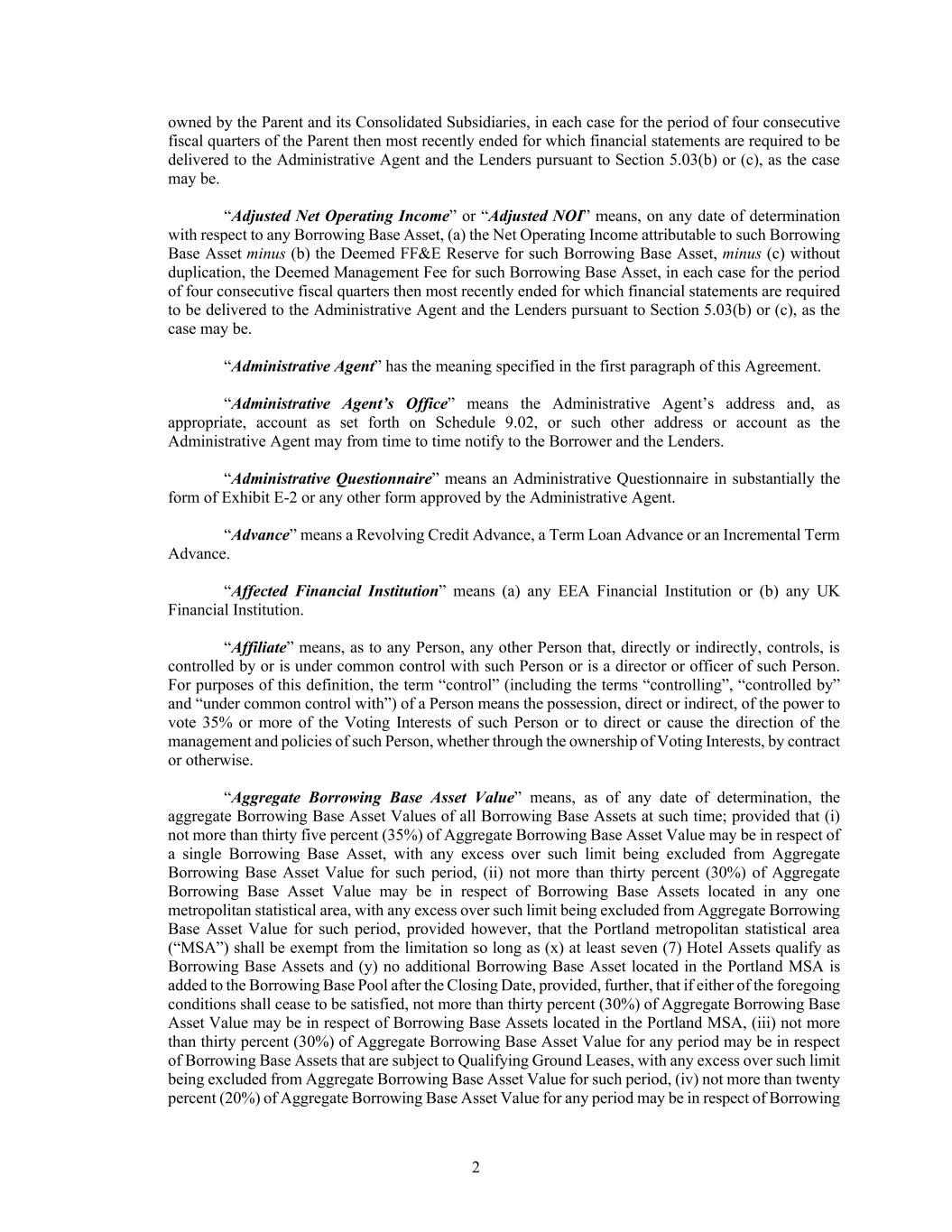 2 owned by the Parent and its Consolidated Subsidiaries, in each case for the period of four consecutive fiscal quarters of the Parent then most recently ended for which financial statements are required to be delivered to the Administrative Agent and the Lenders pursuant to Section 5.03(b) or (c), as the case may be. “Adjusted Net Operating Income” or “Adjusted NOI” means, on any date of determination with respect to any Borrowing Base Asset, (a) the Net Operating Income attributable to such Borrowing Base Asset minus (b) the Deemed FF&E Reserve for such Borrowing Base Asset, minus (c) without duplication, the Deemed Management Fee for such Borrowing Base Asset, in each case for the period of four consecutive fiscal quarters then most recently ended for which financial statements are required to be delivered to the Administrative Agent and the Lenders pursuant to Section 5.03(b) or (c), as the case may be. “Administrative Agent” has the meaning specified in the first paragraph of this Agreement. “Administrative Agent’s Office” means the Administrative Agent’s address and, as appropriate, account as set forth on Schedule 9.02, or such other address or account as the Administrative Agent may from time to time notify to the Borrower and the Lenders. “Administrative Questionnaire” means an Administrative Questionnaire in substantially the form of Exhibit E-2 or any other form approved by the Administrative Agent. “Advance” means a Revolving Credit Advance, a Term Loan Advance or an Incremental Term Advance. “Affected Financial Institution” means (a) any EEA Financial Institution or (b) any UK Financial Institution. “Affiliate” means, as to any Person, any other Person that, directly or indirectly, controls, is controlled by or is under common control with such Person or is a director or officer of such Person. For purposes of this definition, the term “control” (including the terms “controlling”, “controlled by” and “under common control with”) of a Person means the possession, direct or indirect, of the power to vote 35% or more of the Voting Interests of such Person or to direct or cause the direction of the management and policies of such Person, whether through the ownership of Voting Interests, by contract or otherwise. “Aggregate Borrowing Base Asset Value” means, as of any date of determination, the aggregate Borrowing Base Asset Values of all Borrowing Base Assets at such time; provided that (i) not more than thirty five percent (35%) of Aggregate Borrowing Base Asset Value may be in respect of a single Borrowing Base Asset, with any excess over such limit being excluded from Aggregate Borrowing Base Asset Value for such period, (ii) not more than thirty percent (30%) of Aggregate Borrowing Base Asset Value may be in respect of Borrowing Base Assets located in any one metropolitan statistical area, with any excess over such limit being excluded from Aggregate Borrowing Base Asset Value for such period, provided however, that the Portland metropolitan statistical area (“MSA”) shall be exempt from the limitation so long as (x) at least seven (7) Hotel Assets qualify as Borrowing Base Assets and (y) no additional Borrowing Base Asset located in the Portland MSA is added to the Borrowing Base Pool after the Closing Date, provided, further, that if either of the foregoing conditions shall cease to be satisfied, not more than thirty percent (30%) of Aggregate Borrowing Base Asset Value may be in respect of Borrowing Base Assets located in the Portland MSA, (iii) not more than thirty percent (30%) of Aggregate Borrowing Base Asset Value for any period may be in respect of Borrowing Base Assets that are subject to Qualifying Ground Leases, with any excess over such limit being excluded from Aggregate Borrowing Base Asset Value for such period, (iv) not more than twenty percent (20%) of Aggregate Borrowing Base Asset Value for any period may be in respect of Borrowing