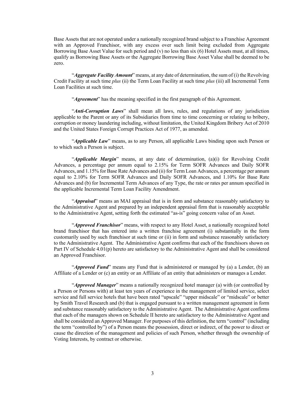 3 Base Assets that are not operated under a nationally recognized brand subject to a Franchise Agreement with an Approved Franchisor, with any excess over such limit being excluded from Aggregate Borrowing Base Asset Value for such period and (v) no less than six (6) Hotel Assets must, at all times, qualify as Borrowing Base Assets or the Aggregate Borrowing Base Asset Value shall be deemed to be zero. “Aggregate Facility Amount” means, at any date of determination, the sum of (i) the Revolving Credit Facility at such time plus (ii) the Term Loan Facility at such time plus (iii) all Incremental Term Loan Facilities at such time. “Agreement” has the meaning specified in the first paragraph of this Agreement. “Anti-Corruption Laws” shall mean all laws, rules, and regulations of any jurisdiction applicable to the Parent or any of its Subsidiaries from time to time concerning or relating to bribery, corruption or money laundering including, without limitation, the United Kingdom Bribery Act of 2010 and the United States Foreign Corrupt Practices Act of 1977, as amended. “Applicable Law” means, as to any Person, all applicable Laws binding upon such Person or to which such a Person is subject. “Applicable Margin” means, at any date of determination, (a)(i) for Revolving Credit Advances, a percentage per annum equal to 2.15% for Term SOFR Advances and Daily SOFR Advances, and 1.15% for Base Rate Advances and (ii) for Term Loan Advances, a percentage per annum equal to 2.10% for Term SOFR Advances and Daily SOFR Advances, and 1.10% for Base Rate Advances and (b) for Incremental Term Advances of any Type, the rate or rates per annum specified in the applicable Incremental Term Loan Facility Amendment. “Appraisal” means an MAI appraisal that is in form and substance reasonably satisfactory to the Administrative Agent and prepared by an independent appraisal firm that is reasonably acceptable to the Administrative Agent, setting forth the estimated “as-is” going concern value of an Asset. “Approved Franchisor” means, with respect to any Hotel Asset, a nationally recognized hotel brand franchisor that has entered into a written franchise agreement (i) substantially in the form customarily used by such franchisor at such time or (ii) in form and substance reasonably satisfactory to the Administrative Agent. The Administrative Agent confirms that each of the franchisors shown on Part IV of Schedule 4.01(p) hereto are satisfactory to the Administrative Agent and shall be considered an Approved Franchisor. “Approved Fund” means any Fund that is administered or managed by (a) a Lender, (b) an Affiliate of a Lender or (c) an entity or an Affiliate of an entity that administers or manages a Lender. “Approved Manager” means a nationally recognized hotel manager (a) with (or controlled by a Person or Persons with) at least ten years of experience in the management of limited service, select service and full service hotels that have been rated “upscale” “upper midscale” or “midscale” or better by Smith Travel Research and (b) that is engaged pursuant to a written management agreement in form and substance reasonably satisfactory to the Administrative Agent. The Administrative Agent confirms that each of the managers shown on Schedule II hereto are satisfactory to the Administrative Agent and shall be considered an Approved Manager. For purposes of this definition, the term “control” (including the term “controlled by”) of a Person means the possession, direct or indirect, of the power to direct or cause the direction of the management and policies of such Person, whether through the ownership of Voting Interests, by contract or otherwise.