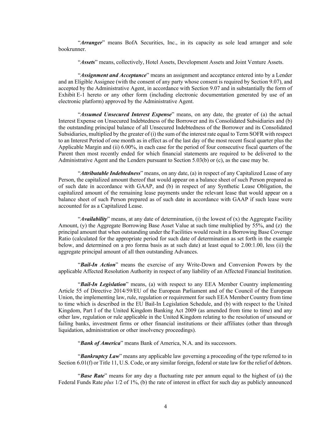 4 “Arranger” means BofA Securities, Inc., in its capacity as sole lead arranger and sole bookrunner. “Assets” means, collectively, Hotel Assets, Development Assets and Joint Venture Assets. “Assignment and Acceptance” means an assignment and acceptance entered into by a Lender and an Eligible Assignee (with the consent of any party whose consent is required by Section 9.07), and accepted by the Administrative Agent, in accordance with Section 9.07 and in substantially the form of Exhibit E-1 hereto or any other form (including electronic documentation generated by use of an electronic platform) approved by the Administrative Agent. “Assumed Unsecured Interest Expense” means, on any date, the greater of (a) the actual Interest Expense on Unsecured Indebtedness of the Borrower and its Consolidated Subsidiaries and (b) the outstanding principal balance of all Unsecured Indebtedness of the Borrower and its Consolidated Subsidiaries, multiplied by the greater of (i) the sum of the interest rate equal to Term SOFR with respect to an Interest Period of one month as in effect as of the last day of the most recent fiscal quarter plus the Applicable Margin and (ii) 6.00%, in each case for the period of four consecutive fiscal quarters of the Parent then most recently ended for which financial statements are required to be delivered to the Administrative Agent and the Lenders pursuant to Section 5.03(b) or (c), as the case may be. “Attributable Indebtedness” means, on any date, (a) in respect of any Capitalized Lease of any Person, the capitalized amount thereof that would appear on a balance sheet of such Person prepared as of such date in accordance with GAAP, and (b) in respect of any Synthetic Lease Obligation, the capitalized amount of the remaining lease payments under the relevant lease that would appear on a balance sheet of such Person prepared as of such date in accordance with GAAP if such lease were accounted for as a Capitalized Lease. “Availability” means, at any date of determination, (i) the lowest of (x) the Aggregate Facility Amount, (y) the Aggregate Borrowing Base Asset Value at such time multiplied by 55%, and (z) the principal amount that when outstanding under the Facilities would result in a Borrowing Base Coverage Ratio (calculated for the appropriate period for such date of determination as set forth in the example below, and determined on a pro forma basis as at such date) at least equal to 2.00:1.00, less (ii) the aggregate principal amount of all then outstanding Advances. “Bail-In Action” means the exercise of any Write-Down and Conversion Powers by the applicable Affected Resolution Authority in respect of any liability of an Affected Financial Institution. “Bail-In Legislation” means, (a) with respect to any EEA Member Country implementing Article 55 of Directive 2014/59/EU of the European Parliament and of the Council of the European Union, the implementing law, rule, regulation or requirement for such EEA Member Country from time to time which is described in the EU Bail-In Legislation Schedule, and (b) with respect to the United Kingdom, Part I of the United Kingdom Banking Act 2009 (as amended from time to time) and any other law, regulation or rule applicable in the United Kingdom relating to the resolution of unsound or failing banks, investment firms or other financial institutions or their affiliates (other than through liquidation, administration or other insolvency proceedings). “Bank of America” means Bank of America, N.A. and its successors. “Bankruptcy Law” means any applicable law governing a proceeding of the type referred to in Section 6.01(f) or Title 11, U.S. Code, or any similar foreign, federal or state law for the relief of debtors. “Base Rate” means for any day a fluctuating rate per annum equal to the highest of (a) the Federal Funds Rate plus 1/2 of 1%, (b) the rate of interest in effect for such day as publicly announced