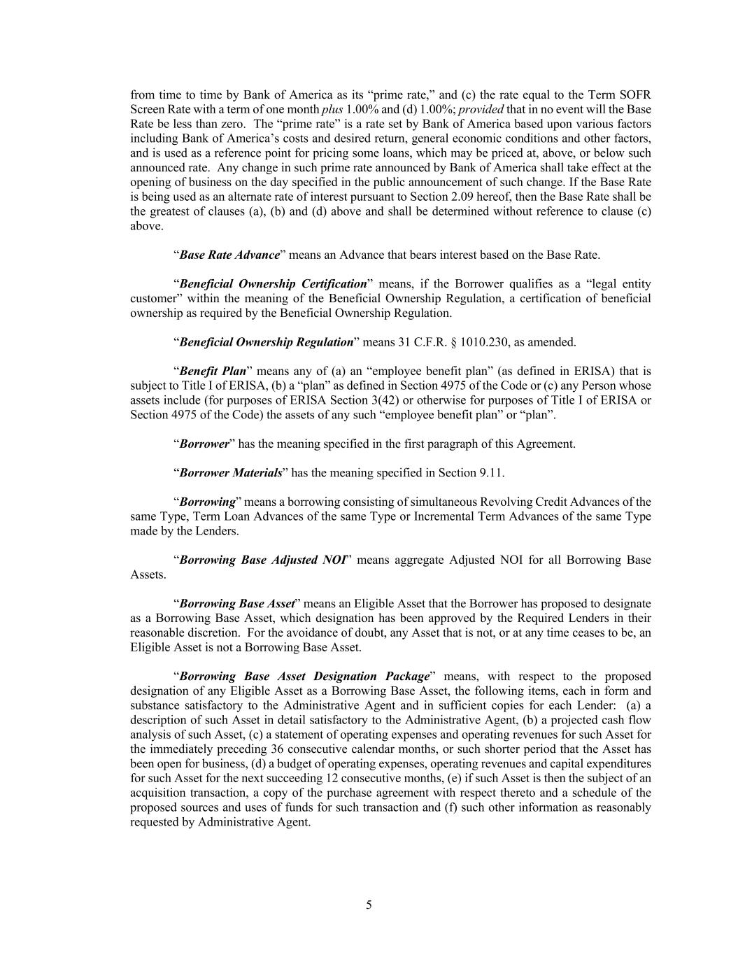 5 from time to time by Bank of America as its “prime rate,” and (c) the rate equal to the Term SOFR Screen Rate with a term of one month plus 1.00% and (d) 1.00%; provided that in no event will the Base Rate be less than zero. The “prime rate” is a rate set by Bank of America based upon various factors including Bank of America’s costs and desired return, general economic conditions and other factors, and is used as a reference point for pricing some loans, which may be priced at, above, or below such announced rate. Any change in such prime rate announced by Bank of America shall take effect at the opening of business on the day specified in the public announcement of such change. If the Base Rate is being used as an alternate rate of interest pursuant to Section 2.09 hereof, then the Base Rate shall be the greatest of clauses (a), (b) and (d) above and shall be determined without reference to clause (c) above. “Base Rate Advance” means an Advance that bears interest based on the Base Rate. “Beneficial Ownership Certification” means, if the Borrower qualifies as a “legal entity customer” within the meaning of the Beneficial Ownership Regulation, a certification of beneficial ownership as required by the Beneficial Ownership Regulation. “Beneficial Ownership Regulation” means 31 C.F.R. § 1010.230, as amended. “Benefit Plan” means any of (a) an “employee benefit plan” (as defined in ERISA) that is subject to Title I of ERISA, (b) a “plan” as defined in Section 4975 of the Code or (c) any Person whose assets include (for purposes of ERISA Section 3(42) or otherwise for purposes of Title I of ERISA or Section 4975 of the Code) the assets of any such “employee benefit plan” or “plan”. “Borrower” has the meaning specified in the first paragraph of this Agreement. “Borrower Materials” has the meaning specified in Section 9.11. “Borrowing” means a borrowing consisting of simultaneous Revolving Credit Advances of the same Type, Term Loan Advances of the same Type or Incremental Term Advances of the same Type made by the Lenders. “Borrowing Base Adjusted NOI” means aggregate Adjusted NOI for all Borrowing Base Assets. “Borrowing Base Asset” means an Eligible Asset that the Borrower has proposed to designate as a Borrowing Base Asset, which designation has been approved by the Required Lenders in their reasonable discretion. For the avoidance of doubt, any Asset that is not, or at any time ceases to be, an Eligible Asset is not a Borrowing Base Asset. “Borrowing Base Asset Designation Package” means, with respect to the proposed designation of any Eligible Asset as a Borrowing Base Asset, the following items, each in form and substance satisfactory to the Administrative Agent and in sufficient copies for each Lender: (a) a description of such Asset in detail satisfactory to the Administrative Agent, (b) a projected cash flow analysis of such Asset, (c) a statement of operating expenses and operating revenues for such Asset for the immediately preceding 36 consecutive calendar months, or such shorter period that the Asset has been open for business, (d) a budget of operating expenses, operating revenues and capital expenditures for such Asset for the next succeeding 12 consecutive months, (e) if such Asset is then the subject of an acquisition transaction, a copy of the purchase agreement with respect thereto and a schedule of the proposed sources and uses of funds for such transaction and (f) such other information as reasonably requested by Administrative Agent.