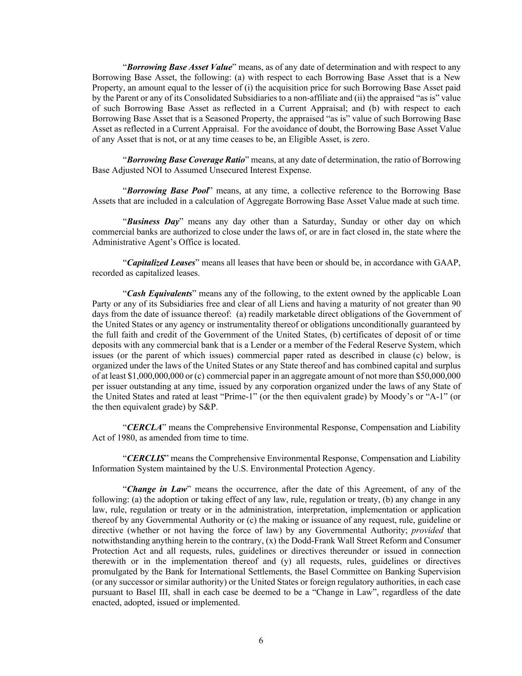 6 “Borrowing Base Asset Value” means, as of any date of determination and with respect to any Borrowing Base Asset, the following: (a) with respect to each Borrowing Base Asset that is a New Property, an amount equal to the lesser of (i) the acquisition price for such Borrowing Base Asset paid by the Parent or any of its Consolidated Subsidiaries to a non-affiliate and (ii) the appraised “as is” value of such Borrowing Base Asset as reflected in a Current Appraisal; and (b) with respect to each Borrowing Base Asset that is a Seasoned Property, the appraised “as is” value of such Borrowing Base Asset as reflected in a Current Appraisal. For the avoidance of doubt, the Borrowing Base Asset Value of any Asset that is not, or at any time ceases to be, an Eligible Asset, is zero. “Borrowing Base Coverage Ratio” means, at any date of determination, the ratio of Borrowing Base Adjusted NOI to Assumed Unsecured Interest Expense. “Borrowing Base Pool” means, at any time, a collective reference to the Borrowing Base Assets that are included in a calculation of Aggregate Borrowing Base Asset Value made at such time. “Business Day” means any day other than a Saturday, Sunday or other day on which commercial banks are authorized to close under the laws of, or are in fact closed in, the state where the Administrative Agent’s Office is located. “Capitalized Leases” means all leases that have been or should be, in accordance with GAAP, recorded as capitalized leases. “Cash Equivalents” means any of the following, to the extent owned by the applicable Loan Party or any of its Subsidiaries free and clear of all Liens and having a maturity of not greater than 90 days from the date of issuance thereof: (a) readily marketable direct obligations of the Government of the United States or any agency or instrumentality thereof or obligations unconditionally guaranteed by the full faith and credit of the Government of the United States, (b) certificates of deposit of or time deposits with any commercial bank that is a Lender or a member of the Federal Reserve System, which issues (or the parent of which issues) commercial paper rated as described in clause (c) below, is organized under the laws of the United States or any State thereof and has combined capital and surplus of at least $1,000,000,000 or (c) commercial paper in an aggregate amount of not more than $50,000,000 per issuer outstanding at any time, issued by any corporation organized under the laws of any State of the United States and rated at least “Prime-1” (or the then equivalent grade) by Moody’s or “A-1” (or the then equivalent grade) by S&P. “CERCLA” means the Comprehensive Environmental Response, Compensation and Liability Act of 1980, as amended from time to time. “CERCLIS” means the Comprehensive Environmental Response, Compensation and Liability Information System maintained by the U.S. Environmental Protection Agency. “Change in Law” means the occurrence, after the date of this Agreement, of any of the following: (a) the adoption or taking effect of any law, rule, regulation or treaty, (b) any change in any law, rule, regulation or treaty or in the administration, interpretation, implementation or application thereof by any Governmental Authority or (c) the making or issuance of any request, rule, guideline or directive (whether or not having the force of law) by any Governmental Authority; provided that notwithstanding anything herein to the contrary, (x) the Dodd-Frank Wall Street Reform and Consumer Protection Act and all requests, rules, guidelines or directives thereunder or issued in connection therewith or in the implementation thereof and (y) all requests, rules, guidelines or directives promulgated by the Bank for International Settlements, the Basel Committee on Banking Supervision (or any successor or similar authority) or the United States or foreign regulatory authorities, in each case pursuant to Basel III, shall in each case be deemed to be a “Change in Law”, regardless of the date enacted, adopted, issued or implemented.