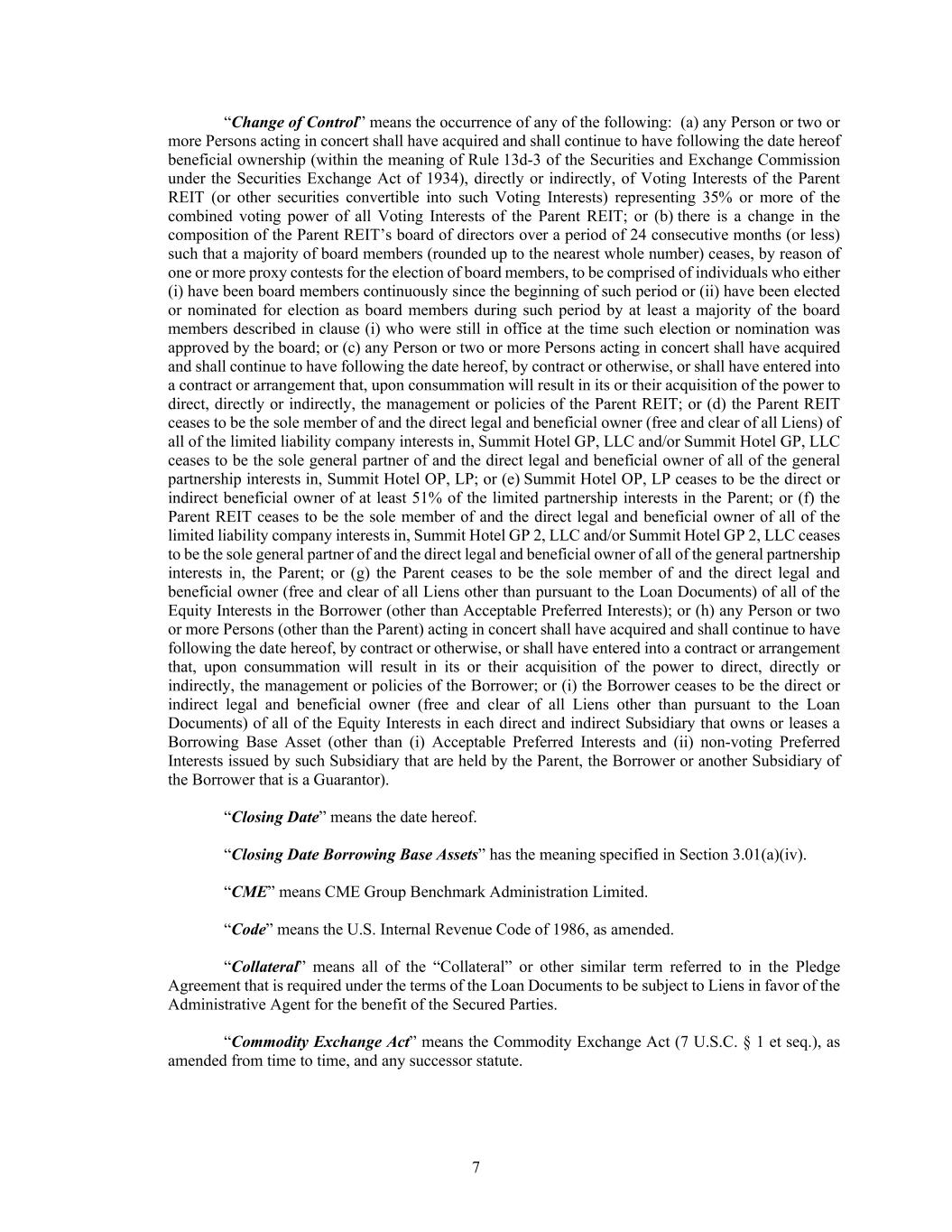 7 “Change of Control” means the occurrence of any of the following: (a) any Person or two or more Persons acting in concert shall have acquired and shall continue to have following the date hereof beneficial ownership (within the meaning of Rule 13d-3 of the Securities and Exchange Commission under the Securities Exchange Act of 1934), directly or indirectly, of Voting Interests of the Parent REIT (or other securities convertible into such Voting Interests) representing 35% or more of the combined voting power of all Voting Interests of the Parent REIT; or (b) there is a change in the composition of the Parent REIT’s board of directors over a period of 24 consecutive months (or less) such that a majority of board members (rounded up to the nearest whole number) ceases, by reason of one or more proxy contests for the election of board members, to be comprised of individuals who either (i) have been board members continuously since the beginning of such period or (ii) have been elected or nominated for election as board members during such period by at least a majority of the board members described in clause (i) who were still in office at the time such election or nomination was approved by the board; or (c) any Person or two or more Persons acting in concert shall have acquired and shall continue to have following the date hereof, by contract or otherwise, or shall have entered into a contract or arrangement that, upon consummation will result in its or their acquisition of the power to direct, directly or indirectly, the management or policies of the Parent REIT; or (d) the Parent REIT ceases to be the sole member of and the direct legal and beneficial owner (free and clear of all Liens) of all of the limited liability company interests in, Summit Hotel GP, LLC and/or Summit Hotel GP, LLC ceases to be the sole general partner of and the direct legal and beneficial owner of all of the general partnership interests in, Summit Hotel OP, LP; or (e) Summit Hotel OP, LP ceases to be the direct or indirect beneficial owner of at least 51% of the limited partnership interests in the Parent; or (f) the Parent REIT ceases to be the sole member of and the direct legal and beneficial owner of all of the limited liability company interests in, Summit Hotel GP 2, LLC and/or Summit Hotel GP 2, LLC ceases to be the sole general partner of and the direct legal and beneficial owner of all of the general partnership interests in, the Parent; or (g) the Parent ceases to be the sole member of and the direct legal and beneficial owner (free and clear of all Liens other than pursuant to the Loan Documents) of all of the Equity Interests in the Borrower (other than Acceptable Preferred Interests); or (h) any Person or two or more Persons (other than the Parent) acting in concert shall have acquired and shall continue to have following the date hereof, by contract or otherwise, or shall have entered into a contract or arrangement that, upon consummation will result in its or their acquisition of the power to direct, directly or indirectly, the management or policies of the Borrower; or (i) the Borrower ceases to be the direct or indirect legal and beneficial owner (free and clear of all Liens other than pursuant to the Loan Documents) of all of the Equity Interests in each direct and indirect Subsidiary that owns or leases a Borrowing Base Asset (other than (i) Acceptable Preferred Interests and (ii) non-voting Preferred Interests issued by such Subsidiary that are held by the Parent, the Borrower or another Subsidiary of the Borrower that is a Guarantor). “Closing Date” means the date hereof. “Closing Date Borrowing Base Assets” has the meaning specified in Section 3.01(a)(iv). “CME” means CME Group Benchmark Administration Limited. “Code” means the U.S. Internal Revenue Code of 1986, as amended. “Collateral” means all of the “Collateral” or other similar term referred to in the Pledge Agreement that is required under the terms of the Loan Documents to be subject to Liens in favor of the Administrative Agent for the benefit of the Secured Parties. “Commodity Exchange Act” means the Commodity Exchange Act (7 U.S.C. § 1 et seq.), as amended from time to time, and any successor statute.