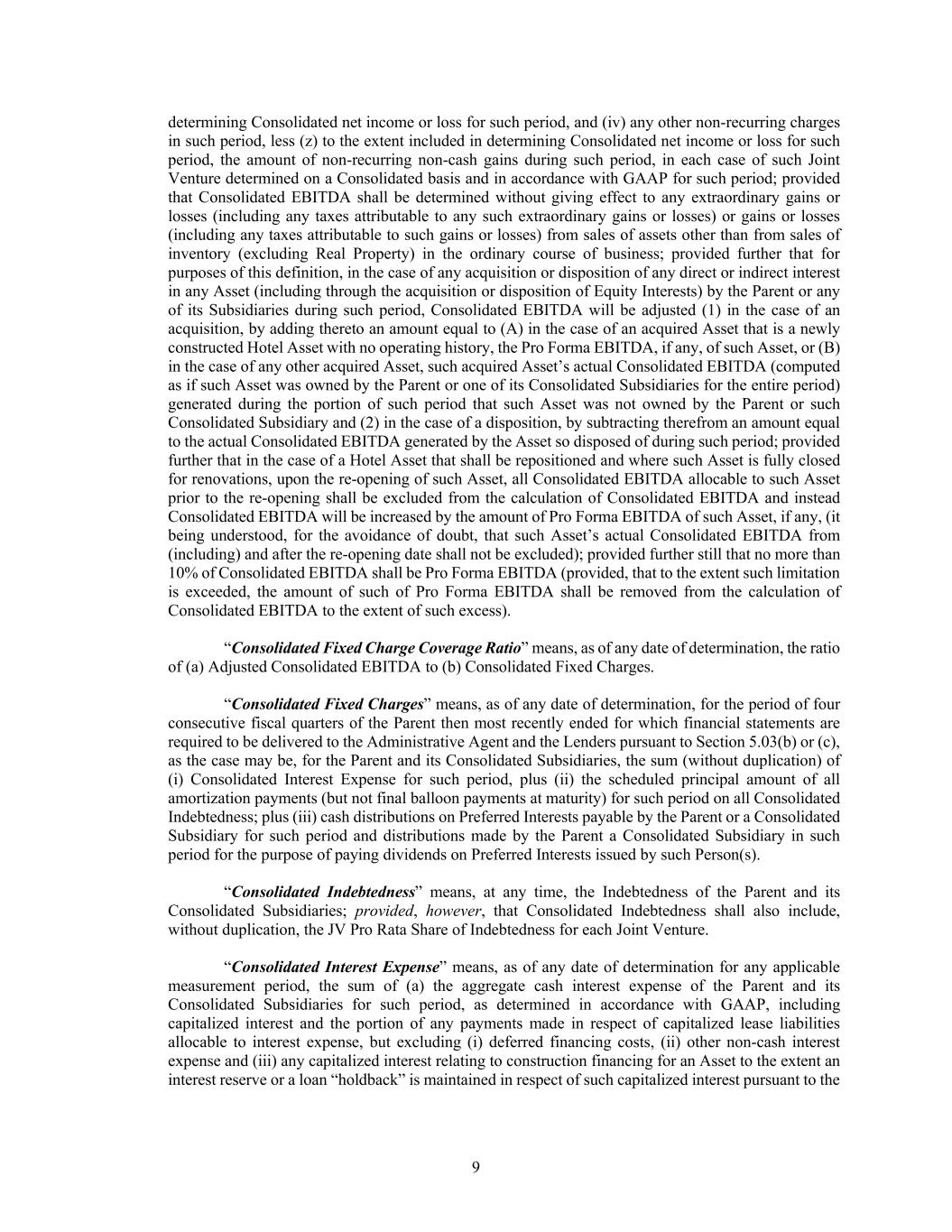 9 determining Consolidated net income or loss for such period, and (iv) any other non-recurring charges in such period, less (z) to the extent included in determining Consolidated net income or loss for such period, the amount of non-recurring non-cash gains during such period, in each case of such Joint Venture determined on a Consolidated basis and in accordance with GAAP for such period; provided that Consolidated EBITDA shall be determined without giving effect to any extraordinary gains or losses (including any taxes attributable to any such extraordinary gains or losses) or gains or losses (including any taxes attributable to such gains or losses) from sales of assets other than from sales of inventory (excluding Real Property) in the ordinary course of business; provided further that for purposes of this definition, in the case of any acquisition or disposition of any direct or indirect interest in any Asset (including through the acquisition or disposition of Equity Interests) by the Parent or any of its Subsidiaries during such period, Consolidated EBITDA will be adjusted (1) in the case of an acquisition, by adding thereto an amount equal to (A) in the case of an acquired Asset that is a newly constructed Hotel Asset with no operating history, the Pro Forma EBITDA, if any, of such Asset, or (B) in the case of any other acquired Asset, such acquired Asset’s actual Consolidated EBITDA (computed as if such Asset was owned by the Parent or one of its Consolidated Subsidiaries for the entire period) generated during the portion of such period that such Asset was not owned by the Parent or such Consolidated Subsidiary and (2) in the case of a disposition, by subtracting therefrom an amount equal to the actual Consolidated EBITDA generated by the Asset so disposed of during such period; provided further that in the case of a Hotel Asset that shall be repositioned and where such Asset is fully closed for renovations, upon the re-opening of such Asset, all Consolidated EBITDA allocable to such Asset prior to the re-opening shall be excluded from the calculation of Consolidated EBITDA and instead Consolidated EBITDA will be increased by the amount of Pro Forma EBITDA of such Asset, if any, (it being understood, for the avoidance of doubt, that such Asset’s actual Consolidated EBITDA from (including) and after the re-opening date shall not be excluded); provided further still that no more than 10% of Consolidated EBITDA shall be Pro Forma EBITDA (provided, that to the extent such limitation is exceeded, the amount of such of Pro Forma EBITDA shall be removed from the calculation of Consolidated EBITDA to the extent of such excess). “Consolidated Fixed Charge Coverage Ratio” means, as of any date of determination, the ratio of (a) Adjusted Consolidated EBITDA to (b) Consolidated Fixed Charges. “Consolidated Fixed Charges” means, as of any date of determination, for the period of four consecutive fiscal quarters of the Parent then most recently ended for which financial statements are required to be delivered to the Administrative Agent and the Lenders pursuant to Section 5.03(b) or (c), as the case may be, for the Parent and its Consolidated Subsidiaries, the sum (without duplication) of (i) Consolidated Interest Expense for such period, plus (ii) the scheduled principal amount of all amortization payments (but not final balloon payments at maturity) for such period on all Consolidated Indebtedness; plus (iii) cash distributions on Preferred Interests payable by the Parent or a Consolidated Subsidiary for such period and distributions made by the Parent a Consolidated Subsidiary in such period for the purpose of paying dividends on Preferred Interests issued by such Person(s). “Consolidated Indebtedness” means, at any time, the Indebtedness of the Parent and its Consolidated Subsidiaries; provided, however, that Consolidated Indebtedness shall also include, without duplication, the JV Pro Rata Share of Indebtedness for each Joint Venture. “Consolidated Interest Expense” means, as of any date of determination for any applicable measurement period, the sum of (a) the aggregate cash interest expense of the Parent and its Consolidated Subsidiaries for such period, as determined in accordance with GAAP, including capitalized interest and the portion of any payments made in respect of capitalized lease liabilities allocable to interest expense, but excluding (i) deferred financing costs, (ii) other non-cash interest expense and (iii) any capitalized interest relating to construction financing for an Asset to the extent an interest reserve or a loan “holdback” is maintained in respect of such capitalized interest pursuant to the