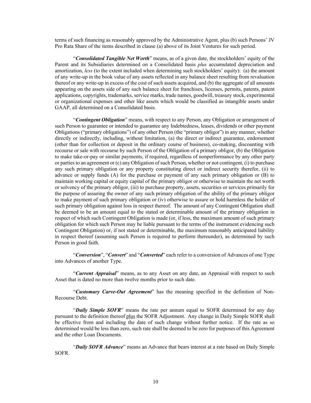 10 terms of such financing as reasonably approved by the Administrative Agent, plus (b) such Persons’ JV Pro Rata Share of the items described in clause (a) above of its Joint Ventures for such period. “Consolidated Tangible Net Worth” means, as of a given date, the stockholders’ equity of the Parent and its Subsidiaries determined on a Consolidated basis plus accumulated depreciation and amortization, less (to the extent included when determining such stockholders’ equity): (a) the amount of any write-up in the book value of any assets reflected in any balance sheet resulting from revaluation thereof or any write-up in excess of the cost of such assets acquired, and (b) the aggregate of all amounts appearing on the assets side of any such balance sheet for franchises, licenses, permits, patents, patent applications, copyrights, trademarks, service marks, trade names, goodwill, treasury stock, experimental or organizational expenses and other like assets which would be classified as intangible assets under GAAP, all determined on a Consolidated basis. “Contingent Obligation” means, with respect to any Person, any Obligation or arrangement of such Person to guarantee or intended to guarantee any Indebtedness, leases, dividends or other payment Obligations (“primary obligations”) of any other Person (the “primary obligor”) in any manner, whether directly or indirectly, including, without limitation, (a) the direct or indirect guarantee, endorsement (other than for collection or deposit in the ordinary course of business), co-making, discounting with recourse or sale with recourse by such Person of the Obligation of a primary obligor, (b) the Obligation to make take-or-pay or similar payments, if required, regardless of nonperformance by any other party or parties to an agreement or (c) any Obligation of such Person, whether or not contingent, (i) to purchase any such primary obligation or any property constituting direct or indirect security therefor, (ii) to advance or supply funds (A) for the purchase or payment of any such primary obligation or (B) to maintain working capital or equity capital of the primary obligor or otherwise to maintain the net worth or solvency of the primary obligor, (iii) to purchase property, assets, securities or services primarily for the purpose of assuring the owner of any such primary obligation of the ability of the primary obligor to make payment of such primary obligation or (iv) otherwise to assure or hold harmless the holder of such primary obligation against loss in respect thereof. The amount of any Contingent Obligation shall be deemed to be an amount equal to the stated or determinable amount of the primary obligation in respect of which such Contingent Obligation is made (or, if less, the maximum amount of such primary obligation for which such Person may be liable pursuant to the terms of the instrument evidencing such Contingent Obligation) or, if not stated or determinable, the maximum reasonably anticipated liability in respect thereof (assuming such Person is required to perform thereunder), as determined by such Person in good faith. “Conversion”, “Convert” and “Converted” each refer to a conversion of Advances of one Type into Advances of another Type. “Current Appraisal” means, as to any Asset on any date, an Appraisal with respect to such Asset that is dated no more than twelve months prior to such date. “Customary Carve-Out Agreement” has the meaning specified in the definition of Non- Recourse Debt. “Daily Simple SOFR” means the rate per annum equal to SOFR determined for any day pursuant to the definition thereof plus the SOFR Adjustment. Any change in Daily Simple SOFR shall be effective from and including the date of such change without further notice. If the rate as so determined would be less than zero, such rate shall be deemed to be zero for purposes of this Agreement and the other Loan Documents. “Daily SOFR Advance” means an Advance that bears interest at a rate based on Daily Simple SOFR.