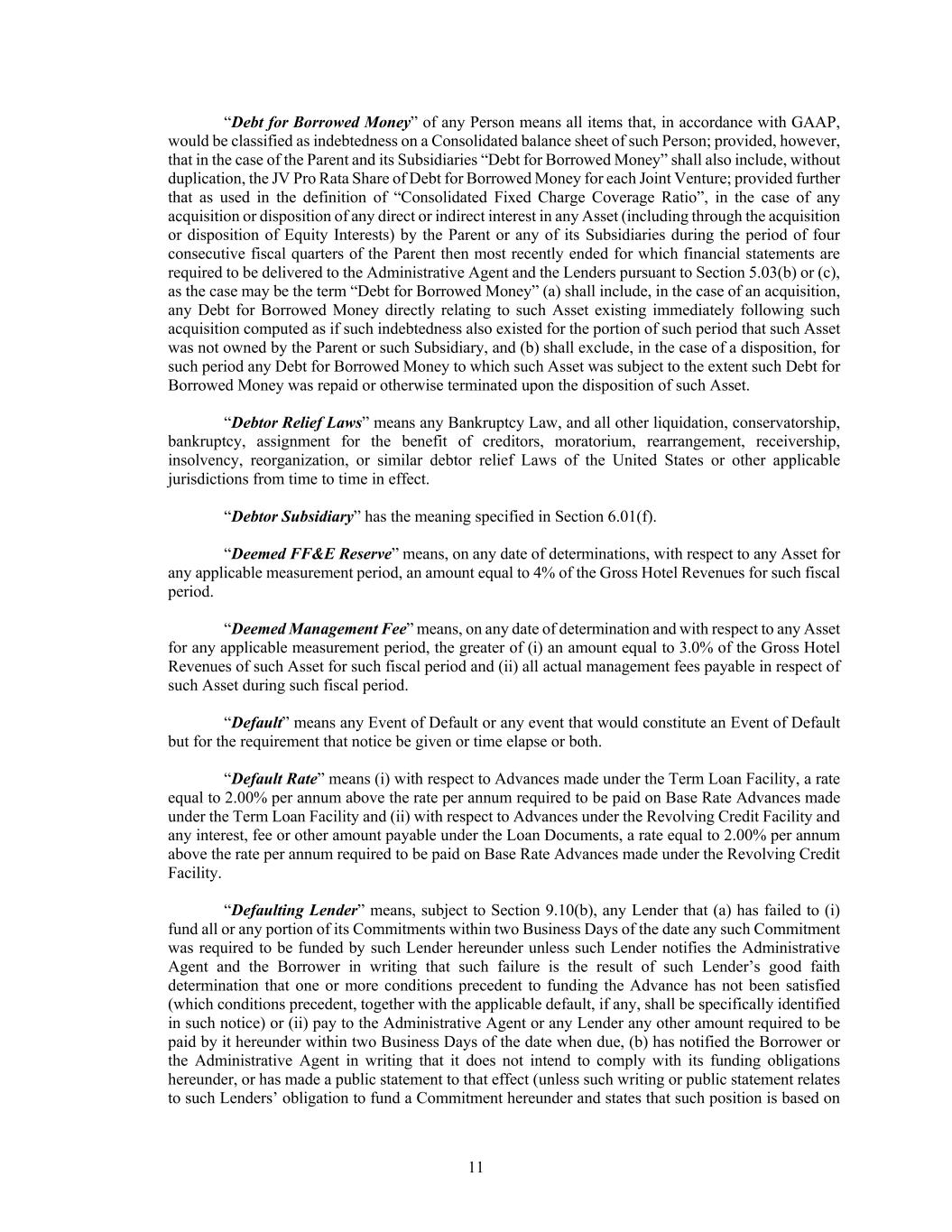 11 “Debt for Borrowed Money” of any Person means all items that, in accordance with GAAP, would be classified as indebtedness on a Consolidated balance sheet of such Person; provided, however, that in the case of the Parent and its Subsidiaries “Debt for Borrowed Money” shall also include, without duplication, the JV Pro Rata Share of Debt for Borrowed Money for each Joint Venture; provided further that as used in the definition of “Consolidated Fixed Charge Coverage Ratio”, in the case of any acquisition or disposition of any direct or indirect interest in any Asset (including through the acquisition or disposition of Equity Interests) by the Parent or any of its Subsidiaries during the period of four consecutive fiscal quarters of the Parent then most recently ended for which financial statements are required to be delivered to the Administrative Agent and the Lenders pursuant to Section 5.03(b) or (c), as the case may be the term “Debt for Borrowed Money” (a) shall include, in the case of an acquisition, any Debt for Borrowed Money directly relating to such Asset existing immediately following such acquisition computed as if such indebtedness also existed for the portion of such period that such Asset was not owned by the Parent or such Subsidiary, and (b) shall exclude, in the case of a disposition, for such period any Debt for Borrowed Money to which such Asset was subject to the extent such Debt for Borrowed Money was repaid or otherwise terminated upon the disposition of such Asset. “Debtor Relief Laws” means any Bankruptcy Law, and all other liquidation, conservatorship, bankruptcy, assignment for the benefit of creditors, moratorium, rearrangement, receivership, insolvency, reorganization, or similar debtor relief Laws of the United States or other applicable jurisdictions from time to time in effect. “Debtor Subsidiary” has the meaning specified in Section 6.01(f). “Deemed FF&E Reserve” means, on any date of determinations, with respect to any Asset for any applicable measurement period, an amount equal to 4% of the Gross Hotel Revenues for such fiscal period. “Deemed Management Fee” means, on any date of determination and with respect to any Asset for any applicable measurement period, the greater of (i) an amount equal to 3.0% of the Gross Hotel Revenues of such Asset for such fiscal period and (ii) all actual management fees payable in respect of such Asset during such fiscal period. “Default” means any Event of Default or any event that would constitute an Event of Default but for the requirement that notice be given or time elapse or both. “Default Rate” means (i) with respect to Advances made under the Term Loan Facility, a rate equal to 2.00% per annum above the rate per annum required to be paid on Base Rate Advances made under the Term Loan Facility and (ii) with respect to Advances under the Revolving Credit Facility and any interest, fee or other amount payable under the Loan Documents, a rate equal to 2.00% per annum above the rate per annum required to be paid on Base Rate Advances made under the Revolving Credit Facility. “Defaulting Lender” means, subject to Section 9.10(b), any Lender that (a) has failed to (i) fund all or any portion of its Commitments within two Business Days of the date any such Commitment was required to be funded by such Lender hereunder unless such Lender notifies the Administrative Agent and the Borrower in writing that such failure is the result of such Lender’s good faith determination that one or more conditions precedent to funding the Advance has not been satisfied (which conditions precedent, together with the applicable default, if any, shall be specifically identified in such notice) or (ii) pay to the Administrative Agent or any Lender any other amount required to be paid by it hereunder within two Business Days of the date when due, (b) has notified the Borrower or the Administrative Agent in writing that it does not intend to comply with its funding obligations hereunder, or has made a public statement to that effect (unless such writing or public statement relates to such Lenders’ obligation to fund a Commitment hereunder and states that such position is based on