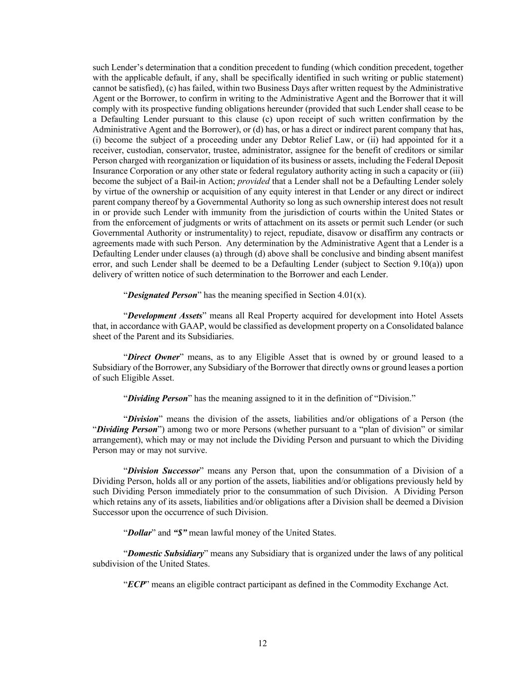 12 such Lender’s determination that a condition precedent to funding (which condition precedent, together with the applicable default, if any, shall be specifically identified in such writing or public statement) cannot be satisfied), (c) has failed, within two Business Days after written request by the Administrative Agent or the Borrower, to confirm in writing to the Administrative Agent and the Borrower that it will comply with its prospective funding obligations hereunder (provided that such Lender shall cease to be a Defaulting Lender pursuant to this clause (c) upon receipt of such written confirmation by the Administrative Agent and the Borrower), or (d) has, or has a direct or indirect parent company that has, (i) become the subject of a proceeding under any Debtor Relief Law, or (ii) had appointed for it a receiver, custodian, conservator, trustee, administrator, assignee for the benefit of creditors or similar Person charged with reorganization or liquidation of its business or assets, including the Federal Deposit Insurance Corporation or any other state or federal regulatory authority acting in such a capacity or (iii) become the subject of a Bail-in Action; provided that a Lender shall not be a Defaulting Lender solely by virtue of the ownership or acquisition of any equity interest in that Lender or any direct or indirect parent company thereof by a Governmental Authority so long as such ownership interest does not result in or provide such Lender with immunity from the jurisdiction of courts within the United States or from the enforcement of judgments or writs of attachment on its assets or permit such Lender (or such Governmental Authority or instrumentality) to reject, repudiate, disavow or disaffirm any contracts or agreements made with such Person. Any determination by the Administrative Agent that a Lender is a Defaulting Lender under clauses (a) through (d) above shall be conclusive and binding absent manifest error, and such Lender shall be deemed to be a Defaulting Lender (subject to Section 9.10(a)) upon delivery of written notice of such determination to the Borrower and each Lender. “Designated Person” has the meaning specified in Section 4.01(x). “Development Assets” means all Real Property acquired for development into Hotel Assets that, in accordance with GAAP, would be classified as development property on a Consolidated balance sheet of the Parent and its Subsidiaries. “Direct Owner” means, as to any Eligible Asset that is owned by or ground leased to a Subsidiary of the Borrower, any Subsidiary of the Borrower that directly owns or ground leases a portion of such Eligible Asset. “Dividing Person” has the meaning assigned to it in the definition of “Division.” “Division” means the division of the assets, liabilities and/or obligations of a Person (the “Dividing Person”) among two or more Persons (whether pursuant to a “plan of division” or similar arrangement), which may or may not include the Dividing Person and pursuant to which the Dividing Person may or may not survive. “Division Successor” means any Person that, upon the consummation of a Division of a Dividing Person, holds all or any portion of the assets, liabilities and/or obligations previously held by such Dividing Person immediately prior to the consummation of such Division. A Dividing Person which retains any of its assets, liabilities and/or obligations after a Division shall be deemed a Division Successor upon the occurrence of such Division. “Dollar” and “$” mean lawful money of the United States. “Domestic Subsidiary” means any Subsidiary that is organized under the laws of any political subdivision of the United States. “ECP” means an eligible contract participant as defined in the Commodity Exchange Act.