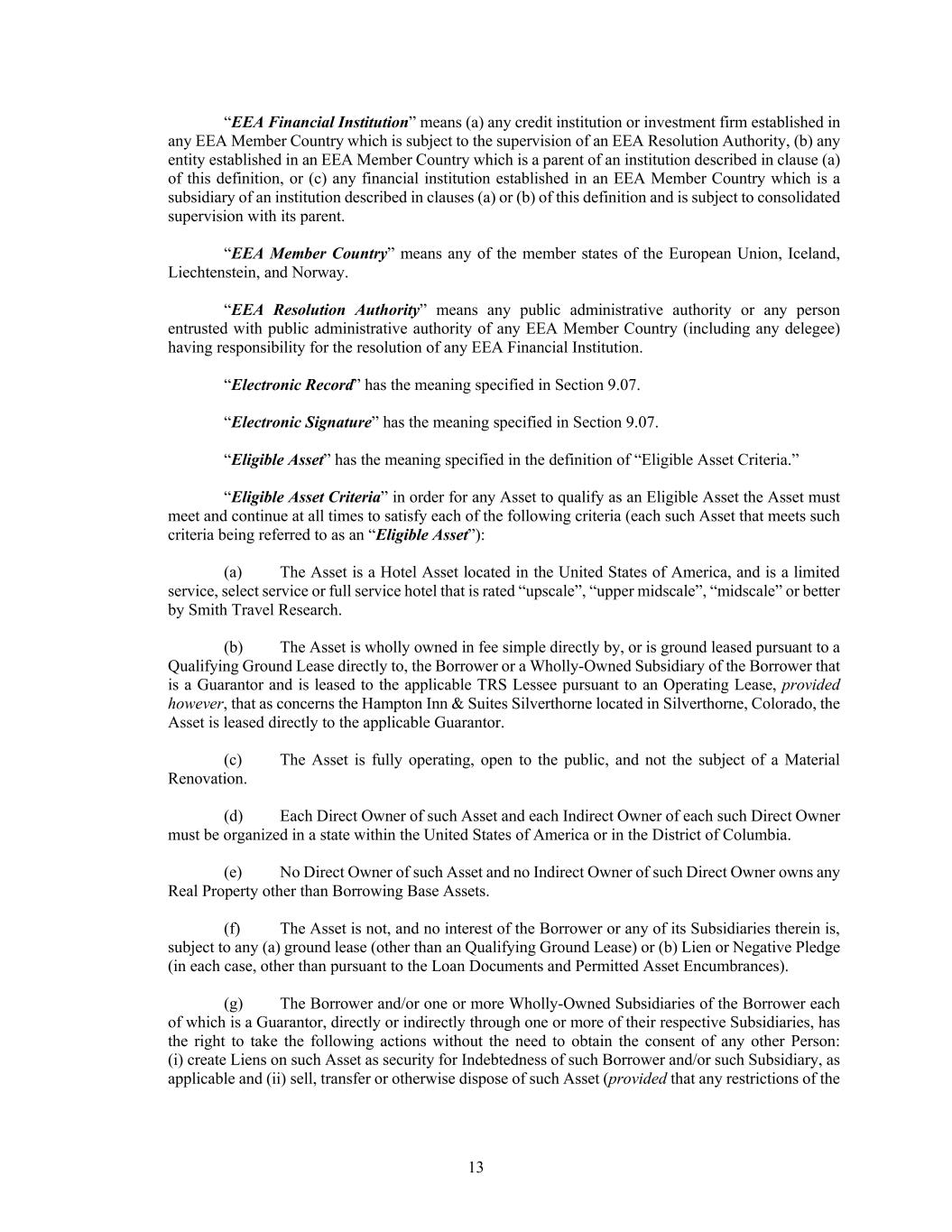 13 “EEA Financial Institution” means (a) any credit institution or investment firm established in any EEA Member Country which is subject to the supervision of an EEA Resolution Authority, (b) any entity established in an EEA Member Country which is a parent of an institution described in clause (a) of this definition, or (c) any financial institution established in an EEA Member Country which is a subsidiary of an institution described in clauses (a) or (b) of this definition and is subject to consolidated supervision with its parent. “EEA Member Country” means any of the member states of the European Union, Iceland, Liechtenstein, and Norway. “EEA Resolution Authority” means any public administrative authority or any person entrusted with public administrative authority of any EEA Member Country (including any delegee) having responsibility for the resolution of any EEA Financial Institution. “Electronic Record” has the meaning specified in Section 9.07. “Electronic Signature” has the meaning specified in Section 9.07. “Eligible Asset” has the meaning specified in the definition of “Eligible Asset Criteria.” “Eligible Asset Criteria” in order for any Asset to qualify as an Eligible Asset the Asset must meet and continue at all times to satisfy each of the following criteria (each such Asset that meets such criteria being referred to as an “Eligible Asset”): (a) The Asset is a Hotel Asset located in the United States of America, and is a limited service, select service or full service hotel that is rated “upscale”, “upper midscale”, “midscale” or better by Smith Travel Research. (b) The Asset is wholly owned in fee simple directly by, or is ground leased pursuant to a Qualifying Ground Lease directly to, the Borrower or a Wholly-Owned Subsidiary of the Borrower that is a Guarantor and is leased to the applicable TRS Lessee pursuant to an Operating Lease, provided however, that as concerns the Hampton Inn & Suites Silverthorne located in Silverthorne, Colorado, the Asset is leased directly to the applicable Guarantor. (c) The Asset is fully operating, open to the public, and not the subject of a Material Renovation. (d) Each Direct Owner of such Asset and each Indirect Owner of each such Direct Owner must be organized in a state within the United States of America or in the District of Columbia. (e) No Direct Owner of such Asset and no Indirect Owner of such Direct Owner owns any Real Property other than Borrowing Base Assets. (f) The Asset is not, and no interest of the Borrower or any of its Subsidiaries therein is, subject to any (a) ground lease (other than an Qualifying Ground Lease) or (b) Lien or Negative Pledge (in each case, other than pursuant to the Loan Documents and Permitted Asset Encumbrances). (g) The Borrower and/or one or more Wholly-Owned Subsidiaries of the Borrower each of which is a Guarantor, directly or indirectly through one or more of their respective Subsidiaries, has the right to take the following actions without the need to obtain the consent of any other Person: (i) create Liens on such Asset as security for Indebtedness of such Borrower and/or such Subsidiary, as applicable and (ii) sell, transfer or otherwise dispose of such Asset (provided that any restrictions of the