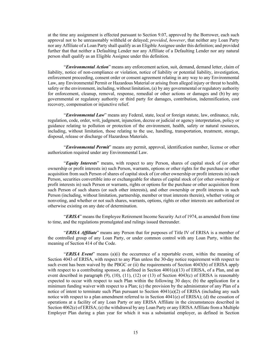 15 at the time any assignment is effected pursuant to Section 9.07, approved by the Borrower, each such approval not to be unreasonably withheld or delayed; provided, however, that neither any Loan Party nor any Affiliate of a Loan Party shall qualify as an Eligible Assignee under this definition; and provided further that that neither a Defaulting Lender nor any Affiliate of a Defaulting Lender nor any natural person shall qualify as an Eligible Assignee under this definition. “Environmental Action” means any enforcement action, suit, demand, demand letter, claim of liability, notice of non-compliance or violation, notice of liability or potential liability, investigation, enforcement proceeding, consent order or consent agreement relating in any way to any Environmental Law, any Environmental Permit or Hazardous Material or arising from alleged injury or threat to health, safety or the environment, including, without limitation, (a) by any governmental or regulatory authority for enforcement, cleanup, removal, response, remedial or other actions or damages and (b) by any governmental or regulatory authority or third party for damages, contribution, indemnification, cost recovery, compensation or injunctive relief. “Environmental Law” means any Federal, state, local or foreign statute, law, ordinance, rule, regulation, code, order, writ, judgment, injunction, decree or judicial or agency interpretation, policy or guidance relating to pollution or protection of the environment, health, safety or natural resources, including, without limitation, those relating to the use, handling, transportation, treatment, storage, disposal, release or discharge of Hazardous Materials. “Environmental Permit” means any permit, approval, identification number, license or other authorization required under any Environmental Law. “Equity Interests” means, with respect to any Person, shares of capital stock of (or other ownership or profit interests in) such Person, warrants, options or other rights for the purchase or other acquisition from such Person of shares of capital stock of (or other ownership or profit interests in) such Person, securities convertible into or exchangeable for shares of capital stock of (or other ownership or profit interests in) such Person or warrants, rights or options for the purchase or other acquisition from such Person of such shares (or such other interests), and other ownership or profit interests in such Person (including, without limitation, partnership, member or trust interests therein), whether voting or nonvoting, and whether or not such shares, warrants, options, rights or other interests are authorized or otherwise existing on any date of determination. “ERISA” means the Employee Retirement Income Security Act of 1974, as amended from time to time, and the regulations promulgated and rulings issued thereunder. “ERISA Affiliate” means any Person that for purposes of Title IV of ERISA is a member of the controlled group of any Loan Party, or under common control with any Loan Party, within the meaning of Section 414 of the Code. “ERISA Event” means (a)(i) the occurrence of a reportable event, within the meaning of Section 4043 of ERISA, with respect to any Plan unless the 30-day notice requirement with respect to such event has been waived by the PBGC or (ii) the requirements of Section 4043(b) of ERISA apply with respect to a contributing sponsor, as defined in Section 4001(a)(13) of ERISA, of a Plan, and an event described in paragraph (9), (10), (11), (12) or (13) of Section 4043(c) of ERISA is reasonably expected to occur with respect to such Plan within the following 30 days; (b) the application for a minimum funding waiver with respect to a Plan; (c) the provision by the administrator of any Plan of a notice of intent to terminate such Plan pursuant to Section 4041(a)(2) of ERISA (including any such notice with respect to a plan amendment referred to in Section 4041(e) of ERISA); (d) the cessation of operations at a facility of any Loan Party or any ERISA Affiliate in the circumstances described in Section 4062(e) of ERISA; (e) the withdrawal by any Loan Party or any ERISA Affiliate from a Multiple Employer Plan during a plan year for which it was a substantial employer, as defined in Section