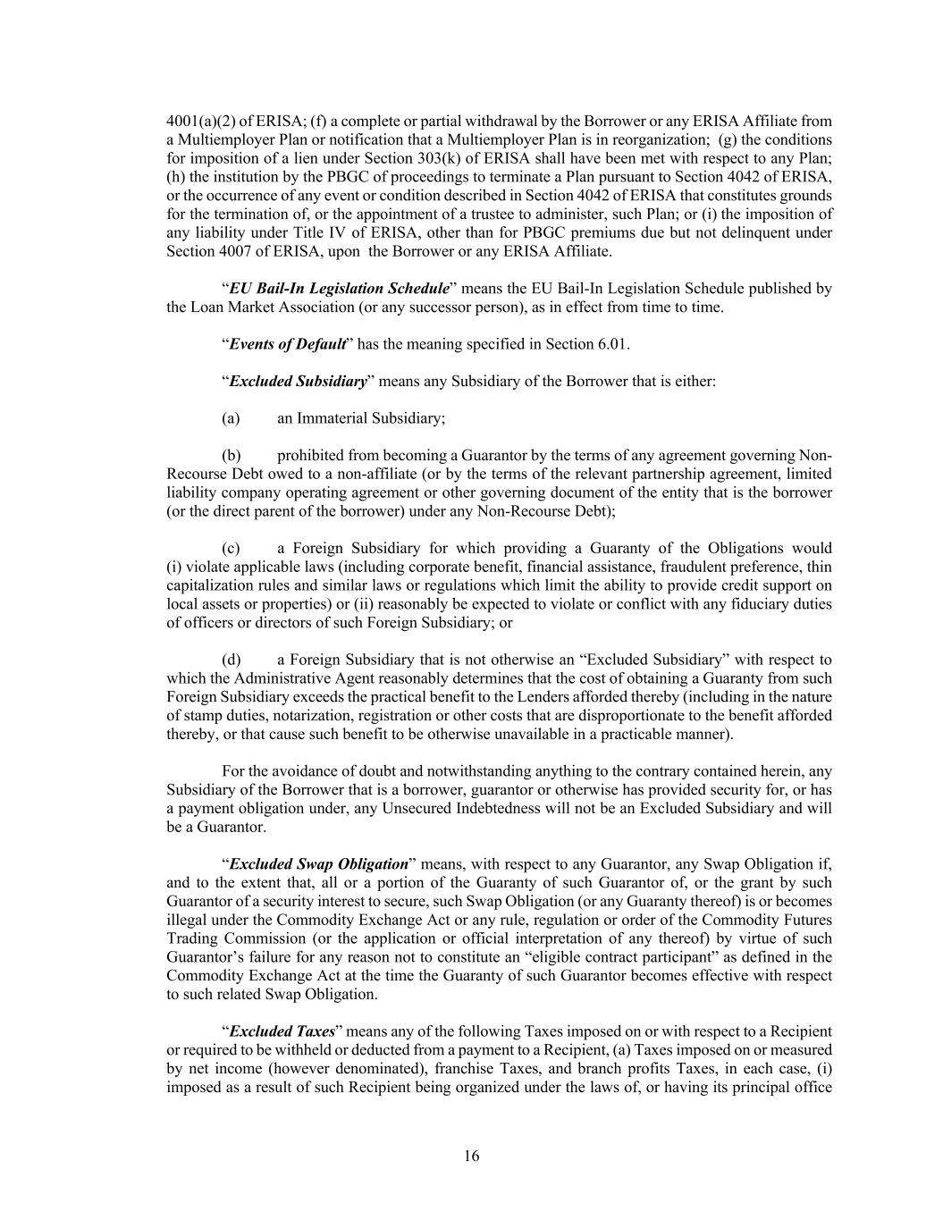 16 4001(a)(2) of ERISA; (f) a complete or partial withdrawal by the Borrower or any ERISA Affiliate from a Multiemployer Plan or notification that a Multiemployer Plan is in reorganization; (g) the conditions for imposition of a lien under Section 303(k) of ERISA shall have been met with respect to any Plan; (h) the institution by the PBGC of proceedings to terminate a Plan pursuant to Section 4042 of ERISA, or the occurrence of any event or condition described in Section 4042 of ERISA that constitutes grounds for the termination of, or the appointment of a trustee to administer, such Plan; or (i) the imposition of any liability under Title IV of ERISA, other than for PBGC premiums due but not delinquent under Section 4007 of ERISA, upon the Borrower or any ERISA Affiliate. “EU Bail-In Legislation Schedule” means the EU Bail-In Legislation Schedule published by the Loan Market Association (or any successor person), as in effect from time to time. “Events of Default” has the meaning specified in Section 6.01. “Excluded Subsidiary” means any Subsidiary of the Borrower that is either: (a) an Immaterial Subsidiary; (b) prohibited from becoming a Guarantor by the terms of any agreement governing Non- Recourse Debt owed to a non-affiliate (or by the terms of the relevant partnership agreement, limited liability company operating agreement or other governing document of the entity that is the borrower (or the direct parent of the borrower) under any Non-Recourse Debt); (c) a Foreign Subsidiary for which providing a Guaranty of the Obligations would (i) violate applicable laws (including corporate benefit, financial assistance, fraudulent preference, thin capitalization rules and similar laws or regulations which limit the ability to provide credit support on local assets or properties) or (ii) reasonably be expected to violate or conflict with any fiduciary duties of officers or directors of such Foreign Subsidiary; or (d) a Foreign Subsidiary that is not otherwise an “Excluded Subsidiary” with respect to which the Administrative Agent reasonably determines that the cost of obtaining a Guaranty from such Foreign Subsidiary exceeds the practical benefit to the Lenders afforded thereby (including in the nature of stamp duties, notarization, registration or other costs that are disproportionate to the benefit afforded thereby, or that cause such benefit to be otherwise unavailable in a practicable manner). For the avoidance of doubt and notwithstanding anything to the contrary contained herein, any Subsidiary of the Borrower that is a borrower, guarantor or otherwise has provided security for, or has a payment obligation under, any Unsecured Indebtedness will not be an Excluded Subsidiary and will be a Guarantor. “Excluded Swap Obligation” means, with respect to any Guarantor, any Swap Obligation if, and to the extent that, all or a portion of the Guaranty of such Guarantor of, or the grant by such Guarantor of a security interest to secure, such Swap Obligation (or any Guaranty thereof) is or becomes illegal under the Commodity Exchange Act or any rule, regulation or order of the Commodity Futures Trading Commission (or the application or official interpretation of any thereof) by virtue of such Guarantor’s failure for any reason not to constitute an “eligible contract participant” as defined in the Commodity Exchange Act at the time the Guaranty of such Guarantor becomes effective with respect to such related Swap Obligation. “Excluded Taxes” means any of the following Taxes imposed on or with respect to a Recipient or required to be withheld or deducted from a payment to a Recipient, (a) Taxes imposed on or measured by net income (however denominated), franchise Taxes, and branch profits Taxes, in each case, (i) imposed as a result of such Recipient being organized under the laws of, or having its principal office