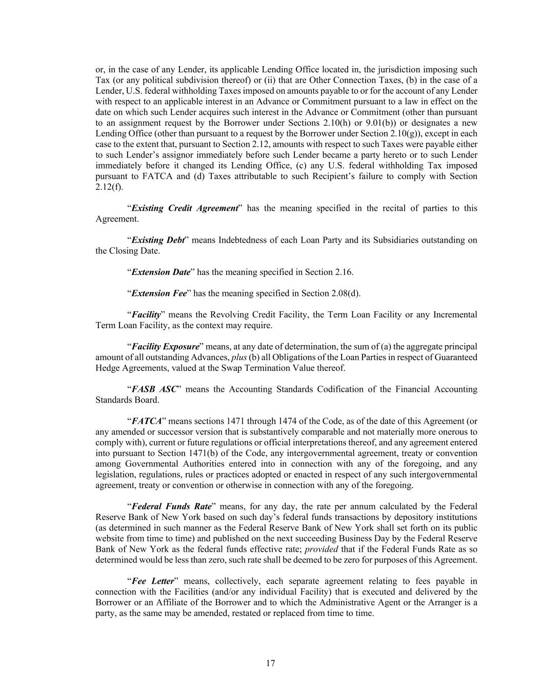 17 or, in the case of any Lender, its applicable Lending Office located in, the jurisdiction imposing such Tax (or any political subdivision thereof) or (ii) that are Other Connection Taxes, (b) in the case of a Lender, U.S. federal withholding Taxes imposed on amounts payable to or for the account of any Lender with respect to an applicable interest in an Advance or Commitment pursuant to a law in effect on the date on which such Lender acquires such interest in the Advance or Commitment (other than pursuant to an assignment request by the Borrower under Sections 2.10(h) or 9.01(b)) or designates a new Lending Office (other than pursuant to a request by the Borrower under Section 2.10(g)), except in each case to the extent that, pursuant to Section 2.12, amounts with respect to such Taxes were payable either to such Lender’s assignor immediately before such Lender became a party hereto or to such Lender immediately before it changed its Lending Office, (c) any U.S. federal withholding Tax imposed pursuant to FATCA and (d) Taxes attributable to such Recipient’s failure to comply with Section 2.12(f). “Existing Credit Agreement” has the meaning specified in the recital of parties to this Agreement. “Existing Debt” means Indebtedness of each Loan Party and its Subsidiaries outstanding on the Closing Date. “Extension Date” has the meaning specified in Section 2.16. “Extension Fee” has the meaning specified in Section 2.08(d). “Facility” means the Revolving Credit Facility, the Term Loan Facility or any Incremental Term Loan Facility, as the context may require. “Facility Exposure” means, at any date of determination, the sum of (a) the aggregate principal amount of all outstanding Advances, plus (b) all Obligations of the Loan Parties in respect of Guaranteed Hedge Agreements, valued at the Swap Termination Value thereof. “FASB ASC” means the Accounting Standards Codification of the Financial Accounting Standards Board. “FATCA” means sections 1471 through 1474 of the Code, as of the date of this Agreement (or any amended or successor version that is substantively comparable and not materially more onerous to comply with), current or future regulations or official interpretations thereof, and any agreement entered into pursuant to Section 1471(b) of the Code, any intergovernmental agreement, treaty or convention among Governmental Authorities entered into in connection with any of the foregoing, and any legislation, regulations, rules or practices adopted or enacted in respect of any such intergovernmental agreement, treaty or convention or otherwise in connection with any of the foregoing. “Federal Funds Rate” means, for any day, the rate per annum calculated by the Federal Reserve Bank of New York based on such day’s federal funds transactions by depository institutions (as determined in such manner as the Federal Reserve Bank of New York shall set forth on its public website from time to time) and published on the next succeeding Business Day by the Federal Reserve Bank of New York as the federal funds effective rate; provided that if the Federal Funds Rate as so determined would be less than zero, such rate shall be deemed to be zero for purposes of this Agreement. “Fee Letter” means, collectively, each separate agreement relating to fees payable in connection with the Facilities (and/or any individual Facility) that is executed and delivered by the Borrower or an Affiliate of the Borrower and to which the Administrative Agent or the Arranger is a party, as the same may be amended, restated or replaced from time to time.