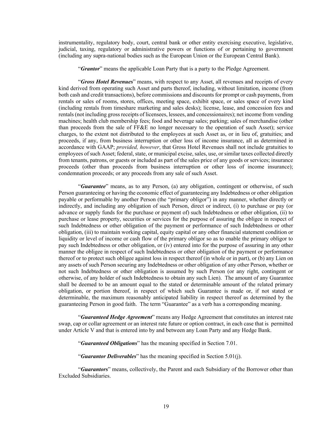 19 instrumentality, regulatory body, court, central bank or other entity exercising executive, legislative, judicial, taxing, regulatory or administrative powers or functions of or pertaining to government (including any supra-national bodies such as the European Union or the European Central Bank). “Grantor” means the applicable Loan Party that is a party to the Pledge Agreement. “Gross Hotel Revenues” means, with respect to any Asset, all revenues and receipts of every kind derived from operating such Asset and parts thereof, including, without limitation, income (from both cash and credit transactions), before commissions and discounts for prompt or cash payments, from rentals or sales of rooms, stores, offices, meeting space, exhibit space, or sales space of every kind (including rentals from timeshare marketing and sales desks); license, lease, and concession fees and rentals (not including gross receipts of licensees, lessees, and concessionaires); net income from vending machines; health club membership fees; food and beverage sales; parking; sales of merchandise (other than proceeds from the sale of FF&E no longer necessary to the operation of such Asset); service charges, to the extent not distributed to the employees at such Asset as, or in lieu of, gratuities; and proceeds, if any, from business interruption or other loss of income insurance, all as determined in accordance with GAAP; provided, however, that Gross Hotel Revenues shall not include gratuities to employees of such Asset; federal, state, or municipal excise, sales, use, or similar taxes collected directly from tenants, patrons, or guests or included as part of the sales price of any goods or services; insurance proceeds (other than proceeds from business interruption or other loss of income insurance); condemnation proceeds; or any proceeds from any sale of such Asset. “Guarantee” means, as to any Person, (a) any obligation, contingent or otherwise, of such Person guaranteeing or having the economic effect of guaranteeing any Indebtedness or other obligation payable or performable by another Person (the “primary obligor”) in any manner, whether directly or indirectly, and including any obligation of such Person, direct or indirect, (i) to purchase or pay (or advance or supply funds for the purchase or payment of) such Indebtedness or other obligation, (ii) to purchase or lease property, securities or services for the purpose of assuring the obligee in respect of such Indebtedness or other obligation of the payment or performance of such Indebtedness or other obligation, (iii) to maintain working capital, equity capital or any other financial statement condition or liquidity or level of income or cash flow of the primary obligor so as to enable the primary obligor to pay such Indebtedness or other obligation, or (iv) entered into for the purpose of assuring in any other manner the obligee in respect of such Indebtedness or other obligation of the payment or performance thereof or to protect such obligee against loss in respect thereof (in whole or in part), or (b) any Lien on any assets of such Person securing any Indebtedness or other obligation of any other Person, whether or not such Indebtedness or other obligation is assumed by such Person (or any right, contingent or otherwise, of any holder of such Indebtedness to obtain any such Lien). The amount of any Guarantee shall be deemed to be an amount equal to the stated or determinable amount of the related primary obligation, or portion thereof, in respect of which such Guarantee is made or, if not stated or determinable, the maximum reasonably anticipated liability in respect thereof as determined by the guaranteeing Person in good faith. The term “Guarantee” as a verb has a corresponding meaning. “Guaranteed Hedge Agreement” means any Hedge Agreement that constitutes an interest rate swap, cap or collar agreement or an interest rate future or option contract, in each case that is permitted under Article V and that is entered into by and between any Loan Party and any Hedge Bank. “Guaranteed Obligations” has the meaning specified in Section 7.01. “Guarantor Deliverables” has the meaning specified in Section 5.01(j). “Guarantors” means, collectively, the Parent and each Subsidiary of the Borrower other than Excluded Subsidiaries.