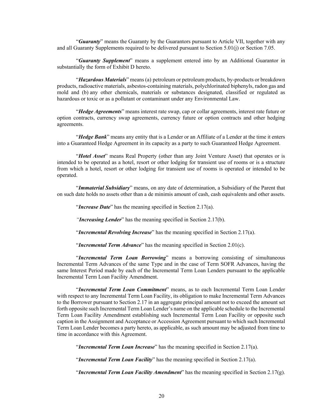 20 “Guaranty” means the Guaranty by the Guarantors pursuant to Article VII, together with any and all Guaranty Supplements required to be delivered pursuant to Section 5.01(j) or Section 7.05. “Guaranty Supplement” means a supplement entered into by an Additional Guarantor in substantially the form of Exhibit D hereto. “Hazardous Materials” means (a) petroleum or petroleum products, by-products or breakdown products, radioactive materials, asbestos-containing materials, polychlorinated biphenyls, radon gas and mold and (b) any other chemicals, materials or substances designated, classified or regulated as hazardous or toxic or as a pollutant or contaminant under any Environmental Law. “Hedge Agreements” means interest rate swap, cap or collar agreements, interest rate future or option contracts, currency swap agreements, currency future or option contracts and other hedging agreements. “Hedge Bank” means any entity that is a Lender or an Affiliate of a Lender at the time it enters into a Guaranteed Hedge Agreement in its capacity as a party to such Guaranteed Hedge Agreement. “Hotel Asset” means Real Property (other than any Joint Venture Asset) that operates or is intended to be operated as a hotel, resort or other lodging for transient use of rooms or is a structure from which a hotel, resort or other lodging for transient use of rooms is operated or intended to be operated. “Immaterial Subsidiary” means, on any date of determination, a Subsidiary of the Parent that on such date holds no assets other than a de minimis amount of cash, cash equivalents and other assets. “Increase Date” has the meaning specified in Section 2.17(a). “Increasing Lender” has the meaning specified in Section 2.17(b). “Incremental Revolving Increase” has the meaning specified in Section 2.17(a). “Incremental Term Advance” has the meaning specified in Section 2.01(c). “Incremental Term Loan Borrowing” means a borrowing consisting of simultaneous Incremental Term Advances of the same Type and in the case of Term SOFR Advances, having the same Interest Period made by each of the Incremental Term Loan Lenders pursuant to the applicable Incremental Term Loan Facility Amendment. “Incremental Term Loan Commitment” means, as to each Incremental Term Loan Lender with respect to any Incremental Term Loan Facility, its obligation to make Incremental Term Advances to the Borrower pursuant to Section 2.17 in an aggregate principal amount not to exceed the amount set forth opposite such Incremental Term Loan Lender’s name on the applicable schedule to the Incremental Term Loan Facility Amendment establishing such Incremental Term Loan Facility or opposite such caption in the Assignment and Acceptance or Accession Agreement pursuant to which such Incremental Term Loan Lender becomes a party hereto, as applicable, as such amount may be adjusted from time to time in accordance with this Agreement. “Incremental Term Loan Increase” has the meaning specified in Section 2.17(a). “Incremental Term Loan Facility” has the meaning specified in Section 2.17(a). “Incremental Term Loan Facility Amendment” has the meaning specified in Section 2.17(g).