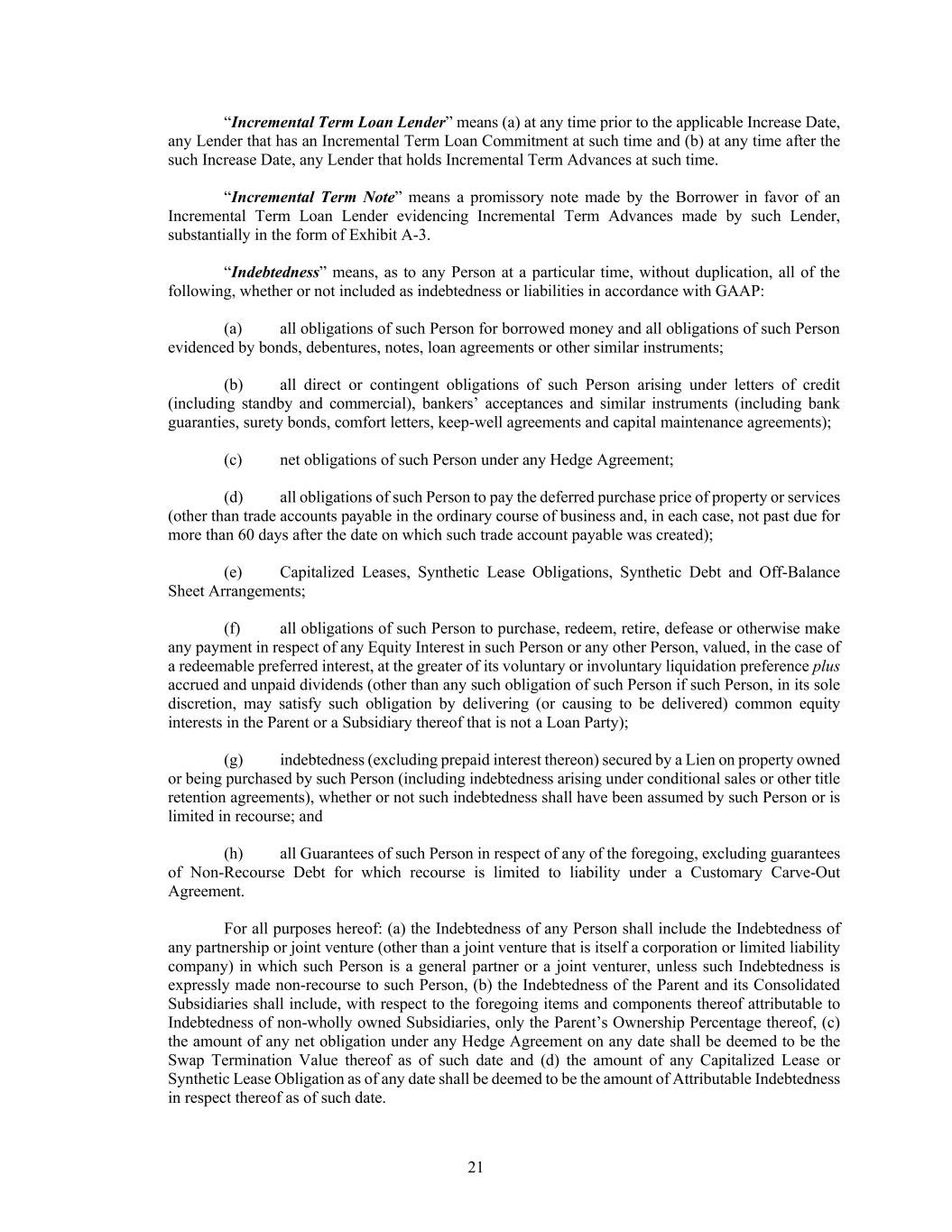 21 “Incremental Term Loan Lender” means (a) at any time prior to the applicable Increase Date, any Lender that has an Incremental Term Loan Commitment at such time and (b) at any time after the such Increase Date, any Lender that holds Incremental Term Advances at such time. “Incremental Term Note” means a promissory note made by the Borrower in favor of an Incremental Term Loan Lender evidencing Incremental Term Advances made by such Lender, substantially in the form of Exhibit A-3. “Indebtedness” means, as to any Person at a particular time, without duplication, all of the following, whether or not included as indebtedness or liabilities in accordance with GAAP: (a) all obligations of such Person for borrowed money and all obligations of such Person evidenced by bonds, debentures, notes, loan agreements or other similar instruments; (b) all direct or contingent obligations of such Person arising under letters of credit (including standby and commercial), bankers’ acceptances and similar instruments (including bank guaranties, surety bonds, comfort letters, keep-well agreements and capital maintenance agreements); (c) net obligations of such Person under any Hedge Agreement; (d) all obligations of such Person to pay the deferred purchase price of property or services (other than trade accounts payable in the ordinary course of business and, in each case, not past due for more than 60 days after the date on which such trade account payable was created); (e) Capitalized Leases, Synthetic Lease Obligations, Synthetic Debt and Off-Balance Sheet Arrangements; (f) all obligations of such Person to purchase, redeem, retire, defease or otherwise make any payment in respect of any Equity Interest in such Person or any other Person, valued, in the case of a redeemable preferred interest, at the greater of its voluntary or involuntary liquidation preference plus accrued and unpaid dividends (other than any such obligation of such Person if such Person, in its sole discretion, may satisfy such obligation by delivering (or causing to be delivered) common equity interests in the Parent or a Subsidiary thereof that is not a Loan Party); (g) indebtedness (excluding prepaid interest thereon) secured by a Lien on property owned or being purchased by such Person (including indebtedness arising under conditional sales or other title retention agreements), whether or not such indebtedness shall have been assumed by such Person or is limited in recourse; and (h) all Guarantees of such Person in respect of any of the foregoing, excluding guarantees of Non-Recourse Debt for which recourse is limited to liability under a Customary Carve-Out Agreement. For all purposes hereof: (a) the Indebtedness of any Person shall include the Indebtedness of any partnership or joint venture (other than a joint venture that is itself a corporation or limited liability company) in which such Person is a general partner or a joint venturer, unless such Indebtedness is expressly made non-recourse to such Person, (b) the Indebtedness of the Parent and its Consolidated Subsidiaries shall include, with respect to the foregoing items and components thereof attributable to Indebtedness of non-wholly owned Subsidiaries, only the Parent’s Ownership Percentage thereof, (c) the amount of any net obligation under any Hedge Agreement on any date shall be deemed to be the Swap Termination Value thereof as of such date and (d) the amount of any Capitalized Lease or Synthetic Lease Obligation as of any date shall be deemed to be the amount of Attributable Indebtedness in respect thereof as of such date.