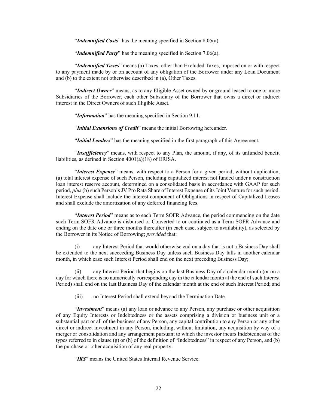 22 “Indemnified Costs” has the meaning specified in Section 8.05(a). “Indemnified Party” has the meaning specified in Section 7.06(a). “Indemnified Taxes” means (a) Taxes, other than Excluded Taxes, imposed on or with respect to any payment made by or on account of any obligation of the Borrower under any Loan Document and (b) to the extent not otherwise described in (a), Other Taxes. “Indirect Owner” means, as to any Eligible Asset owned by or ground leased to one or more Subsidiaries of the Borrower, each other Subsidiary of the Borrower that owns a direct or indirect interest in the Direct Owners of such Eligible Asset. “Information” has the meaning specified in Section 9.11. “Initial Extensions of Credit” means the initial Borrowing hereunder. “Initial Lenders” has the meaning specified in the first paragraph of this Agreement. “Insufficiency” means, with respect to any Plan, the amount, if any, of its unfunded benefit liabilities, as defined in Section 4001(a)(18) of ERISA. “Interest Expense” means, with respect to a Person for a given period, without duplication, (a) total interest expense of such Person, including capitalized interest not funded under a construction loan interest reserve account, determined on a consolidated basis in accordance with GAAP for such period, plus (b) such Person’s JV Pro Rata Share of Interest Expense of its Joint Venture for such period. Interest Expense shall include the interest component of Obligations in respect of Capitalized Leases and shall exclude the amortization of any deferred financing fees. “Interest Period” means as to each Term SOFR Advance, the period commencing on the date such Term SOFR Advance is disbursed or Converted to or continued as a Term SOFR Advance and ending on the date one or three months thereafter (in each case, subject to availability), as selected by the Borrower in its Notice of Borrowing; provided that: (i) any Interest Period that would otherwise end on a day that is not a Business Day shall be extended to the next succeeding Business Day unless such Business Day falls in another calendar month, in which case such Interest Period shall end on the next preceding Business Day; (ii) any Interest Period that begins on the last Business Day of a calendar month (or on a day for which there is no numerically corresponding day in the calendar month at the end of such Interest Period) shall end on the last Business Day of the calendar month at the end of such Interest Period; and (iii) no Interest Period shall extend beyond the Termination Date. “Investment” means (a) any loan or advance to any Person, any purchase or other acquisition of any Equity Interests or Indebtedness or the assets comprising a division or business unit or a substantial part or all of the business of any Person, any capital contribution to any Person or any other direct or indirect investment in any Person, including, without limitation, any acquisition by way of a merger or consolidation and any arrangement pursuant to which the investor incurs Indebtedness of the types referred to in clause (g) or (h) of the definition of “Indebtedness” in respect of any Person, and (b) the purchase or other acquisition of any real property. “IRS” means the United States Internal Revenue Service.