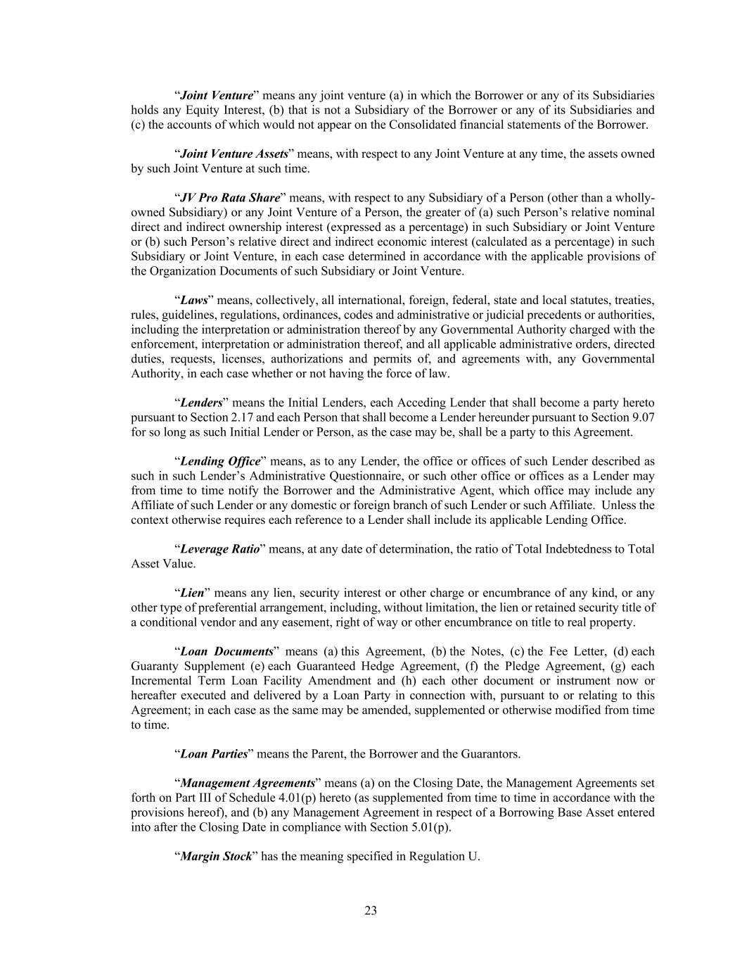 23 “Joint Venture” means any joint venture (a) in which the Borrower or any of its Subsidiaries holds any Equity Interest, (b) that is not a Subsidiary of the Borrower or any of its Subsidiaries and (c) the accounts of which would not appear on the Consolidated financial statements of the Borrower. “Joint Venture Assets” means, with respect to any Joint Venture at any time, the assets owned by such Joint Venture at such time. “JV Pro Rata Share” means, with respect to any Subsidiary of a Person (other than a wholly- owned Subsidiary) or any Joint Venture of a Person, the greater of (a) such Person’s relative nominal direct and indirect ownership interest (expressed as a percentage) in such Subsidiary or Joint Venture or (b) such Person’s relative direct and indirect economic interest (calculated as a percentage) in such Subsidiary or Joint Venture, in each case determined in accordance with the applicable provisions of the Organization Documents of such Subsidiary or Joint Venture. “Laws” means, collectively, all international, foreign, federal, state and local statutes, treaties, rules, guidelines, regulations, ordinances, codes and administrative or judicial precedents or authorities, including the interpretation or administration thereof by any Governmental Authority charged with the enforcement, interpretation or administration thereof, and all applicable administrative orders, directed duties, requests, licenses, authorizations and permits of, and agreements with, any Governmental Authority, in each case whether or not having the force of law. “Lenders” means the Initial Lenders, each Acceding Lender that shall become a party hereto pursuant to Section 2.17 and each Person that shall become a Lender hereunder pursuant to Section 9.07 for so long as such Initial Lender or Person, as the case may be, shall be a party to this Agreement. “Lending Office” means, as to any Lender, the office or offices of such Lender described as such in such Lender’s Administrative Questionnaire, or such other office or offices as a Lender may from time to time notify the Borrower and the Administrative Agent, which office may include any Affiliate of such Lender or any domestic or foreign branch of such Lender or such Affiliate. Unless the context otherwise requires each reference to a Lender shall include its applicable Lending Office. “Leverage Ratio” means, at any date of determination, the ratio of Total Indebtedness to Total Asset Value. “Lien” means any lien, security interest or other charge or encumbrance of any kind, or any other type of preferential arrangement, including, without limitation, the lien or retained security title of a conditional vendor and any easement, right of way or other encumbrance on title to real property. “Loan Documents” means (a) this Agreement, (b) the Notes, (c) the Fee Letter, (d) each Guaranty Supplement (e) each Guaranteed Hedge Agreement, (f) the Pledge Agreement, (g) each Incremental Term Loan Facility Amendment and (h) each other document or instrument now or hereafter executed and delivered by a Loan Party in connection with, pursuant to or relating to this Agreement; in each case as the same may be amended, supplemented or otherwise modified from time to time. “Loan Parties” means the Parent, the Borrower and the Guarantors. “Management Agreements” means (a) on the Closing Date, the Management Agreements set forth on Part III of Schedule 4.01(p) hereto (as supplemented from time to time in accordance with the provisions hereof), and (b) any Management Agreement in respect of a Borrowing Base Asset entered into after the Closing Date in compliance with Section 5.01(p). “Margin Stock” has the meaning specified in Regulation U.