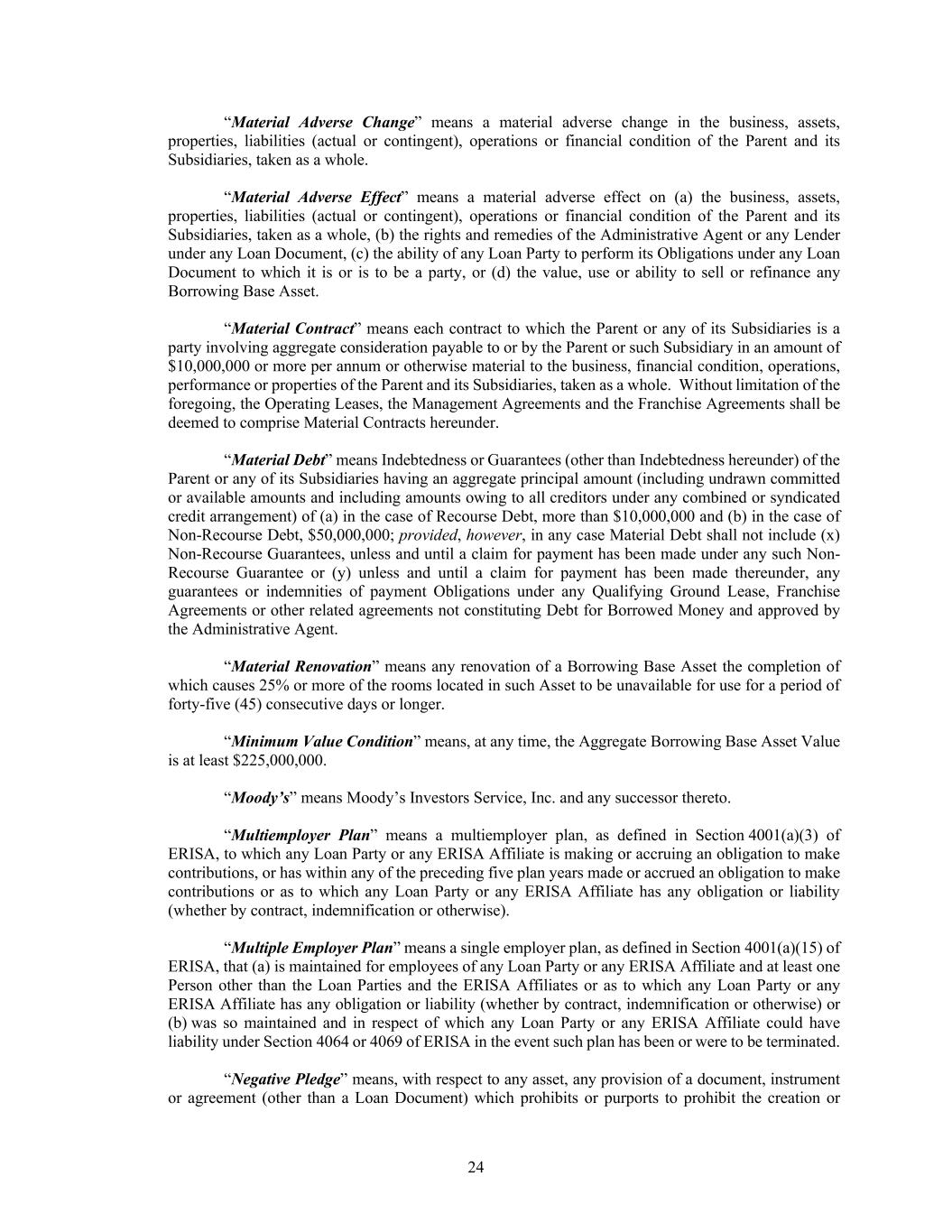 24 “Material Adverse Change” means a material adverse change in the business, assets, properties, liabilities (actual or contingent), operations or financial condition of the Parent and its Subsidiaries, taken as a whole. “Material Adverse Effect” means a material adverse effect on (a) the business, assets, properties, liabilities (actual or contingent), operations or financial condition of the Parent and its Subsidiaries, taken as a whole, (b) the rights and remedies of the Administrative Agent or any Lender under any Loan Document, (c) the ability of any Loan Party to perform its Obligations under any Loan Document to which it is or is to be a party, or (d) the value, use or ability to sell or refinance any Borrowing Base Asset. “Material Contract” means each contract to which the Parent or any of its Subsidiaries is a party involving aggregate consideration payable to or by the Parent or such Subsidiary in an amount of $10,000,000 or more per annum or otherwise material to the business, financial condition, operations, performance or properties of the Parent and its Subsidiaries, taken as a whole. Without limitation of the foregoing, the Operating Leases, the Management Agreements and the Franchise Agreements shall be deemed to comprise Material Contracts hereunder. “Material Debt” means Indebtedness or Guarantees (other than Indebtedness hereunder) of the Parent or any of its Subsidiaries having an aggregate principal amount (including undrawn committed or available amounts and including amounts owing to all creditors under any combined or syndicated credit arrangement) of (a) in the case of Recourse Debt, more than $10,000,000 and (b) in the case of Non-Recourse Debt, $50,000,000; provided, however, in any case Material Debt shall not include (x) Non-Recourse Guarantees, unless and until a claim for payment has been made under any such Non- Recourse Guarantee or (y) unless and until a claim for payment has been made thereunder, any guarantees or indemnities of payment Obligations under any Qualifying Ground Lease, Franchise Agreements or other related agreements not constituting Debt for Borrowed Money and approved by the Administrative Agent. “Material Renovation” means any renovation of a Borrowing Base Asset the completion of which causes 25% or more of the rooms located in such Asset to be unavailable for use for a period of forty-five (45) consecutive days or longer. “Minimum Value Condition” means, at any time, the Aggregate Borrowing Base Asset Value is at least $225,000,000. “Moody’s” means Moody’s Investors Service, Inc. and any successor thereto. “Multiemployer Plan” means a multiemployer plan, as defined in Section 4001(a)(3) of ERISA, to which any Loan Party or any ERISA Affiliate is making or accruing an obligation to make contributions, or has within any of the preceding five plan years made or accrued an obligation to make contributions or as to which any Loan Party or any ERISA Affiliate has any obligation or liability (whether by contract, indemnification or otherwise). “Multiple Employer Plan” means a single employer plan, as defined in Section 4001(a)(15) of ERISA, that (a) is maintained for employees of any Loan Party or any ERISA Affiliate and at least one Person other than the Loan Parties and the ERISA Affiliates or as to which any Loan Party or any ERISA Affiliate has any obligation or liability (whether by contract, indemnification or otherwise) or (b) was so maintained and in respect of which any Loan Party or any ERISA Affiliate could have liability under Section 4064 or 4069 of ERISA in the event such plan has been or were to be terminated. “Negative Pledge” means, with respect to any asset, any provision of a document, instrument or agreement (other than a Loan Document) which prohibits or purports to prohibit the creation or