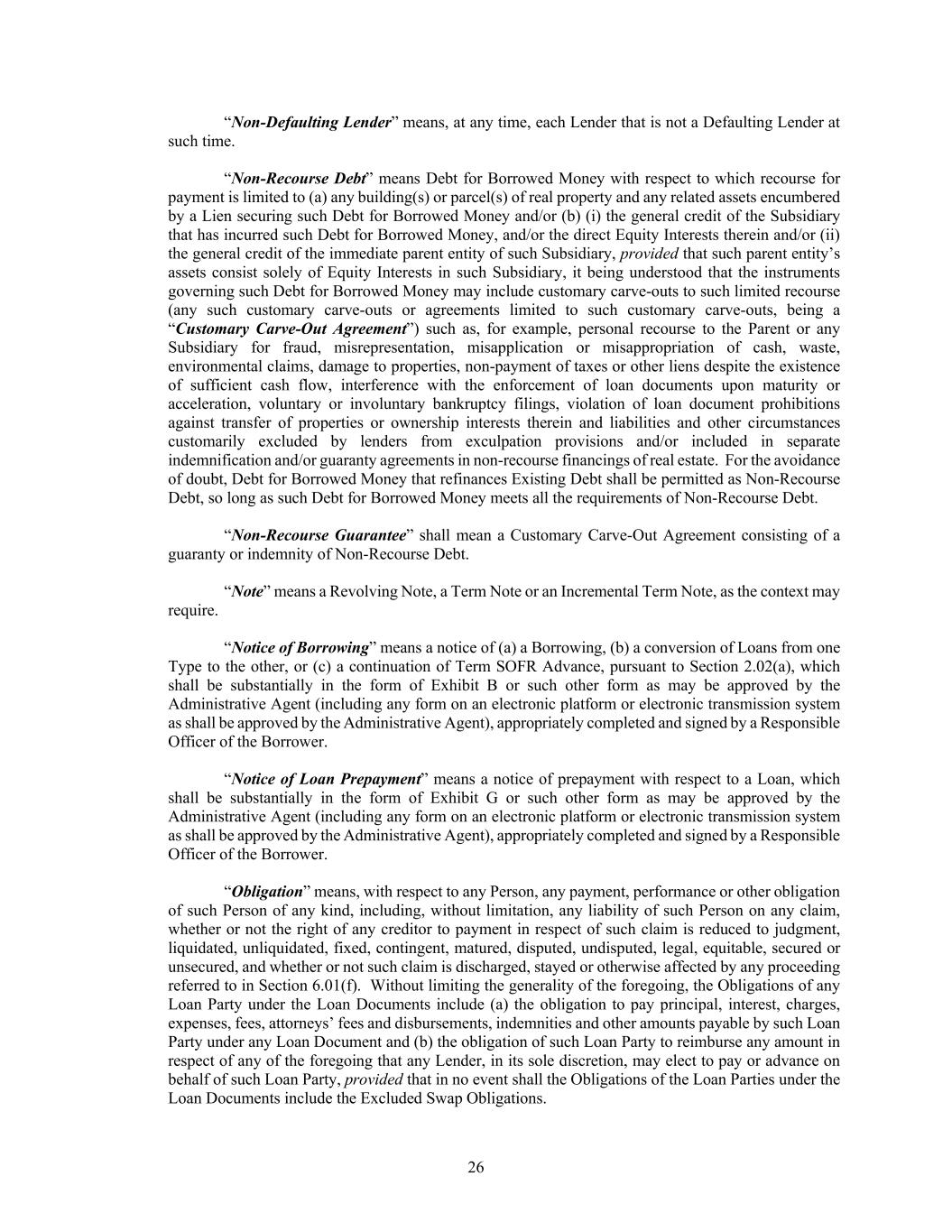26 “Non-Defaulting Lender” means, at any time, each Lender that is not a Defaulting Lender at such time. “Non-Recourse Debt” means Debt for Borrowed Money with respect to which recourse for payment is limited to (a) any building(s) or parcel(s) of real property and any related assets encumbered by a Lien securing such Debt for Borrowed Money and/or (b) (i) the general credit of the Subsidiary that has incurred such Debt for Borrowed Money, and/or the direct Equity Interests therein and/or (ii) the general credit of the immediate parent entity of such Subsidiary, provided that such parent entity’s assets consist solely of Equity Interests in such Subsidiary, it being understood that the instruments governing such Debt for Borrowed Money may include customary carve-outs to such limited recourse (any such customary carve-outs or agreements limited to such customary carve-outs, being a “Customary Carve-Out Agreement”) such as, for example, personal recourse to the Parent or any Subsidiary for fraud, misrepresentation, misapplication or misappropriation of cash, waste, environmental claims, damage to properties, non-payment of taxes or other liens despite the existence of sufficient cash flow, interference with the enforcement of loan documents upon maturity or acceleration, voluntary or involuntary bankruptcy filings, violation of loan document prohibitions against transfer of properties or ownership interests therein and liabilities and other circumstances customarily excluded by lenders from exculpation provisions and/or included in separate indemnification and/or guaranty agreements in non-recourse financings of real estate. For the avoidance of doubt, Debt for Borrowed Money that refinances Existing Debt shall be permitted as Non-Recourse Debt, so long as such Debt for Borrowed Money meets all the requirements of Non-Recourse Debt. “Non-Recourse Guarantee” shall mean a Customary Carve-Out Agreement consisting of a guaranty or indemnity of Non-Recourse Debt. “Note” means a Revolving Note, a Term Note or an Incremental Term Note, as the context may require. “Notice of Borrowing” means a notice of (a) a Borrowing, (b) a conversion of Loans from one Type to the other, or (c) a continuation of Term SOFR Advance, pursuant to Section 2.02(a), which shall be substantially in the form of Exhibit B or such other form as may be approved by the Administrative Agent (including any form on an electronic platform or electronic transmission system as shall be approved by the Administrative Agent), appropriately completed and signed by a Responsible Officer of the Borrower. “Notice of Loan Prepayment” means a notice of prepayment with respect to a Loan, which shall be substantially in the form of Exhibit G or such other form as may be approved by the Administrative Agent (including any form on an electronic platform or electronic transmission system as shall be approved by the Administrative Agent), appropriately completed and signed by a Responsible Officer of the Borrower. “Obligation” means, with respect to any Person, any payment, performance or other obligation of such Person of any kind, including, without limitation, any liability of such Person on any claim, whether or not the right of any creditor to payment in respect of such claim is reduced to judgment, liquidated, unliquidated, fixed, contingent, matured, disputed, undisputed, legal, equitable, secured or unsecured, and whether or not such claim is discharged, stayed or otherwise affected by any proceeding referred to in Section 6.01(f). Without limiting the generality of the foregoing, the Obligations of any Loan Party under the Loan Documents include (a) the obligation to pay principal, interest, charges, expenses, fees, attorneys’ fees and disbursements, indemnities and other amounts payable by such Loan Party under any Loan Document and (b) the obligation of such Loan Party to reimburse any amount in respect of any of the foregoing that any Lender, in its sole discretion, may elect to pay or advance on behalf of such Loan Party, provided that in no event shall the Obligations of the Loan Parties under the Loan Documents include the Excluded Swap Obligations.