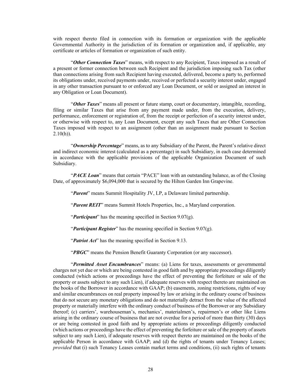 28 with respect thereto filed in connection with its formation or organization with the applicable Governmental Authority in the jurisdiction of its formation or organization and, if applicable, any certificate or articles of formation or organization of such entity. “Other Connection Taxes” means, with respect to any Recipient, Taxes imposed as a result of a present or former connection between such Recipient and the jurisdiction imposing such Tax (other than connections arising from such Recipient having executed, delivered, become a party to, performed its obligations under, received payments under, received or perfected a security interest under, engaged in any other transaction pursuant to or enforced any Loan Document, or sold or assigned an interest in any Obligation or Loan Document). “Other Taxes” means all present or future stamp, court or documentary, intangible, recording, filing or similar Taxes that arise from any payment made under, from the execution, delivery, performance, enforcement or registration of, from the receipt or perfection of a security interest under, or otherwise with respect to, any Loan Document, except any such Taxes that are Other Connection Taxes imposed with respect to an assignment (other than an assignment made pursuant to Section 2.10(h)). “Ownership Percentage” means, as to any Subsidiary of the Parent, the Parent’s relative direct and indirect economic interest (calculated as a percentage) in such Subsidiary, in each case determined in accordance with the applicable provisions of the applicable Organization Document of such Subsidiary. “PACE Loan” means that certain “PACE” loan with an outstanding balance, as of the Closing Date, of approximately $6,094,000 that is secured by the Hilton Garden Inn Grapevine. “Parent” means Summit Hospitality JV, LP, a Delaware limited partnership. “Parent REIT” means Summit Hotels Properties, Inc., a Maryland corporation. “Participant” has the meaning specified in Section 9.07(g). “Participant Register” has the meaning specified in Section 9.07(g). “Patriot Act” has the meaning specified in Section 9.13. “PBGC” means the Pension Benefit Guaranty Corporation (or any successor). “Permitted Asset Encumbrances” means: (a) Liens for taxes, assessments or governmental charges not yet due or which are being contested in good faith and by appropriate proceedings diligently conducted (which actions or proceedings have the effect of preventing the forfeiture or sale of the property or assets subject to any such Lien), if adequate reserves with respect thereto are maintained on the books of the Borrower in accordance with GAAP; (b) easements, zoning restrictions, rights of way and similar encumbrances on real property imposed by law or arising in the ordinary course of business that do not secure any monetary obligations and do not materially detract from the value of the affected property or materially interfere with the ordinary conduct of business of the Borrower or any Subsidiary thereof; (c) carriers’, warehouseman’s, mechanics’, materialmen’s, repairmen’s or other like Liens arising in the ordinary course of business that are not overdue for a period of more than thirty (30) days or are being contested in good faith and by appropriate actions or proceedings diligently conducted (which actions or proceedings have the effect of preventing the forfeiture or sale of the property of assets subject to any such Lien), if adequate reserves with respect thereto are maintained on the books of the applicable Person in accordance with GAAP; and (d) the rights of tenants under Tenancy Leases; provided that (i) such Tenancy Leases contain market terms and conditions, (ii) such rights of tenants