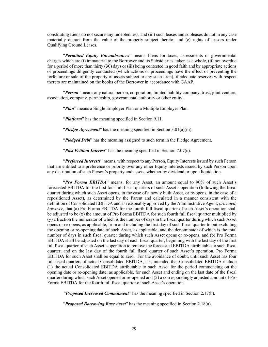 29 constituting Liens do not secure any Indebtedness, and (iii) such leases and subleases do not in any case materially detract from the value of the property subject thereto; and (e) rights of lessors under Qualifying Ground Leases. “Permitted Equity Encumbrances” means Liens for taxes, assessments or governmental charges which are (i) immaterial to the Borrower and its Subsidiaries, taken as a whole, (ii) not overdue for a period of more than thirty (30) days or (iii) being contested in good faith and by appropriate actions or proceedings diligently conducted (which actions or proceedings have the effect of preventing the forfeiture or sale of the property of assets subject to any such Lien), if adequate reserves with respect thereto are maintained on the books of the Borrower in accordance with GAAP. “Person” means any natural person, corporation, limited liability company, trust, joint venture, association, company, partnership, governmental authority or other entity. “Plan” means a Single Employer Plan or a Multiple Employer Plan. “Platform” has the meaning specified in Section 9.11. “Pledge Agreement” has the meaning specified in Section 3.01(a)(iii). “Pledged Debt” has the meaning assigned to such term in the Pledge Agreement. “Post Petition Interest” has the meaning specified in Section 7.07(c). “Preferred Interests” means, with respect to any Person, Equity Interests issued by such Person that are entitled to a preference or priority over any other Equity Interests issued by such Person upon any distribution of such Person’s property and assets, whether by dividend or upon liquidation. “Pro Forma EBITDA” means, for any Asset, an amount equal to 90% of such Asset’s forecasted EBITDA for the first four full fiscal quarters of such Asset’s operation (following the fiscal quarter during which such Asset opens, in the case of a newly built Asset, or re-opens, in the case of a repositioned Asset), as determined by the Parent and calculated in a manner consistent with the definition of Consolidated EBITDA and as reasonably approved by the Administrative Agent; provided, however, that (a) Pro Forma EBITDA for the fourth full fiscal quarter of such Asset’s operation shall be adjusted to be (x) the amount of Pro Forma EBITDA for such fourth full fiscal quarter multiplied by (y) a fraction the numerator of which is the number of days in the fiscal quarter during which such Asset opens or re-opens, as applicable, from and including the first day of such fiscal quarter to but excluding the opening or re-opening date of such Asset, as applicable, and the denominator of which is the total number of days in such fiscal quarter during which such Asset opens or re-opens, and (b) Pro Forma EBITDA shall be adjusted on the last day of each fiscal quarter, beginning with the last day of the first full fiscal quarter of such Asset’s operation to remove the forecasted EBITDA attributable to such fiscal quarter; and on the last day of the fourth full fiscal quarter of such Asset’s operation, Pro Forma EBITDA for such Asset shall be equal to zero. For the avoidance of doubt, until such Asset has four full fiscal quarters of actual Consolidated EBITDA, it is intended that Consolidated EBITDA include (1) the actual Consolidated EBITDA attributable to such Asset for the period commencing on the opening date or re-opening date, as applicable, for such Asset and ending on the last date of the fiscal quarter during which such Asset opened or re-opened and (2) a correspondingly adjusted amount of Pro Forma EBITDA for the fourth full fiscal quarter of such Asset’s operation. “Proposed Increased Commitment” has the meaning specified in Section 2.17(b). “Proposed Borrowing Base Asset” has the meaning specified in Section 2.18(a).