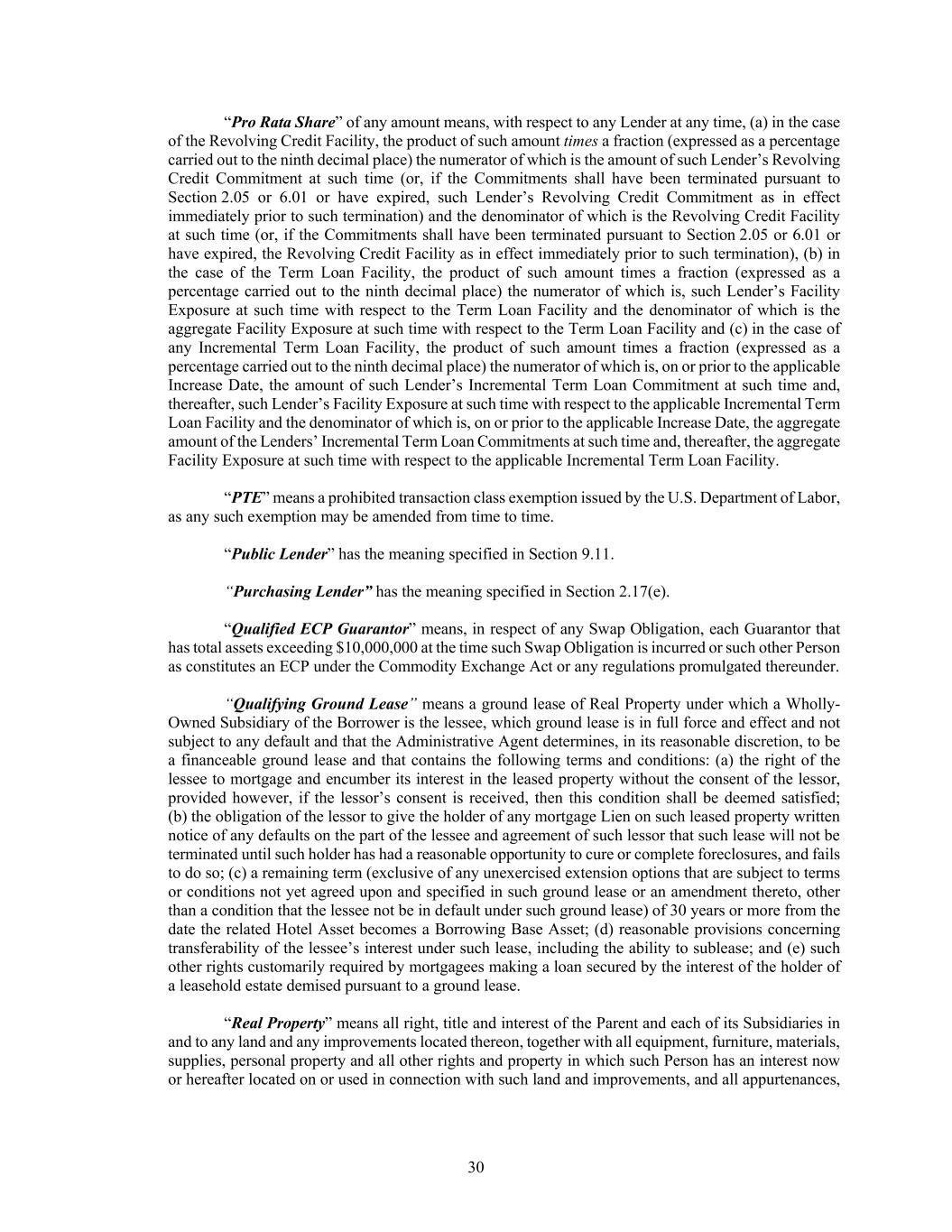 30 “Pro Rata Share” of any amount means, with respect to any Lender at any time, (a) in the case of the Revolving Credit Facility, the product of such amount times a fraction (expressed as a percentage carried out to the ninth decimal place) the numerator of which is the amount of such Lender’s Revolving Credit Commitment at such time (or, if the Commitments shall have been terminated pursuant to Section 2.05 or 6.01 or have expired, such Lender’s Revolving Credit Commitment as in effect immediately prior to such termination) and the denominator of which is the Revolving Credit Facility at such time (or, if the Commitments shall have been terminated pursuant to Section 2.05 or 6.01 or have expired, the Revolving Credit Facility as in effect immediately prior to such termination), (b) in the case of the Term Loan Facility, the product of such amount times a fraction (expressed as a percentage carried out to the ninth decimal place) the numerator of which is, such Lender’s Facility Exposure at such time with respect to the Term Loan Facility and the denominator of which is the aggregate Facility Exposure at such time with respect to the Term Loan Facility and (c) in the case of any Incremental Term Loan Facility, the product of such amount times a fraction (expressed as a percentage carried out to the ninth decimal place) the numerator of which is, on or prior to the applicable Increase Date, the amount of such Lender’s Incremental Term Loan Commitment at such time and, thereafter, such Lender’s Facility Exposure at such time with respect to the applicable Incremental Term Loan Facility and the denominator of which is, on or prior to the applicable Increase Date, the aggregate amount of the Lenders’ Incremental Term Loan Commitments at such time and, thereafter, the aggregate Facility Exposure at such time with respect to the applicable Incremental Term Loan Facility. “PTE” means a prohibited transaction class exemption issued by the U.S. Department of Labor, as any such exemption may be amended from time to time. “Public Lender” has the meaning specified in Section 9.11. “Purchasing Lender” has the meaning specified in Section 2.17(e). “Qualified ECP Guarantor” means, in respect of any Swap Obligation, each Guarantor that has total assets exceeding $10,000,000 at the time such Swap Obligation is incurred or such other Person as constitutes an ECP under the Commodity Exchange Act or any regulations promulgated thereunder. “Qualifying Ground Lease” means a ground lease of Real Property under which a Wholly- Owned Subsidiary of the Borrower is the lessee, which ground lease is in full force and effect and not subject to any default and that the Administrative Agent determines, in its reasonable discretion, to be a financeable ground lease and that contains the following terms and conditions: (a) the right of the lessee to mortgage and encumber its interest in the leased property without the consent of the lessor, provided however, if the lessor’s consent is received, then this condition shall be deemed satisfied; (b) the obligation of the lessor to give the holder of any mortgage Lien on such leased property written notice of any defaults on the part of the lessee and agreement of such lessor that such lease will not be terminated until such holder has had a reasonable opportunity to cure or complete foreclosures, and fails to do so; (c) a remaining term (exclusive of any unexercised extension options that are subject to terms or conditions not yet agreed upon and specified in such ground lease or an amendment thereto, other than a condition that the lessee not be in default under such ground lease) of 30 years or more from the date the related Hotel Asset becomes a Borrowing Base Asset; (d) reasonable provisions concerning transferability of the lessee’s interest under such lease, including the ability to sublease; and (e) such other rights customarily required by mortgagees making a loan secured by the interest of the holder of a leasehold estate demised pursuant to a ground lease. “Real Property” means all right, title and interest of the Parent and each of its Subsidiaries in and to any land and any improvements located thereon, together with all equipment, furniture, materials, supplies, personal property and all other rights and property in which such Person has an interest now or hereafter located on or used in connection with such land and improvements, and all appurtenances,