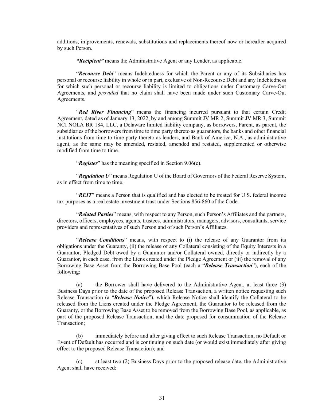 31 additions, improvements, renewals, substitutions and replacements thereof now or hereafter acquired by such Person. “Recipient” means the Administrative Agent or any Lender, as applicable. “Recourse Debt” means Indebtedness for which the Parent or any of its Subsidiaries has personal or recourse liability in whole or in part, exclusive of Non-Recourse Debt and any Indebtedness for which such personal or recourse liability is limited to obligations under Customary Carve-Out Agreements, and provided that no claim shall have been made under such Customary Carve-Out Agreements. “Red River Financing” means the financing incurred pursuant to that certain Credit Agreement, dated as of January 13, 2022, by and among Summit JV MR 2, Summit JV MR 3, Summit NCI NOLA BR 184, LLC, a Delaware limited liability company, as borrowers, Parent, as parent, the subsidiaries of the borrowers from time to time party thereto as guarantors, the banks and other financial institutions from time to time party thereto as lenders, and Bank of America, N.A., as administrative agent, as the same may be amended, restated, amended and restated, supplemented or otherwise modified from time to time. “Register” has the meaning specified in Section 9.06(c). “Regulation U” means Regulation U of the Board of Governors of the Federal Reserve System, as in effect from time to time. “REIT” means a Person that is qualified and has elected to be treated for U.S. federal income tax purposes as a real estate investment trust under Sections 856-860 of the Code. “Related Parties” means, with respect to any Person, such Person’s Affiliates and the partners, directors, officers, employees, agents, trustees, administrators, managers, advisors, consultants, service providers and representatives of such Person and of such Person’s Affiliates. “Release Conditions” means, with respect to (i) the release of any Guarantor from its obligations under the Guaranty, (ii) the release of any Collateral consisting of the Equity Interests in a Guarantor, Pledged Debt owed by a Guarantor and/or Collateral owned, directly or indirectly by a Guarantor, in each case, from the Liens created under the Pledge Agreement or (iii) the removal of any Borrowing Base Asset from the Borrowing Base Pool (each a “Release Transaction”), each of the following: (a) the Borrower shall have delivered to the Administrative Agent, at least three (3) Business Days prior to the date of the proposed Release Transaction, a written notice requesting such Release Transaction (a “Release Notice”), which Release Notice shall identify the Collateral to be released from the Liens created under the Pledge Agreement, the Guarantor to be released from the Guaranty, or the Borrowing Base Asset to be removed from the Borrowing Base Pool, as applicable, as part of the proposed Release Transaction, and the date proposed for consummation of the Release Transaction; (b) immediately before and after giving effect to such Release Transaction, no Default or Event of Default has occurred and is continuing on such date (or would exist immediately after giving effect to the proposed Release Transaction); and (c) at least two (2) Business Days prior to the proposed release date, the Administrative Agent shall have received: