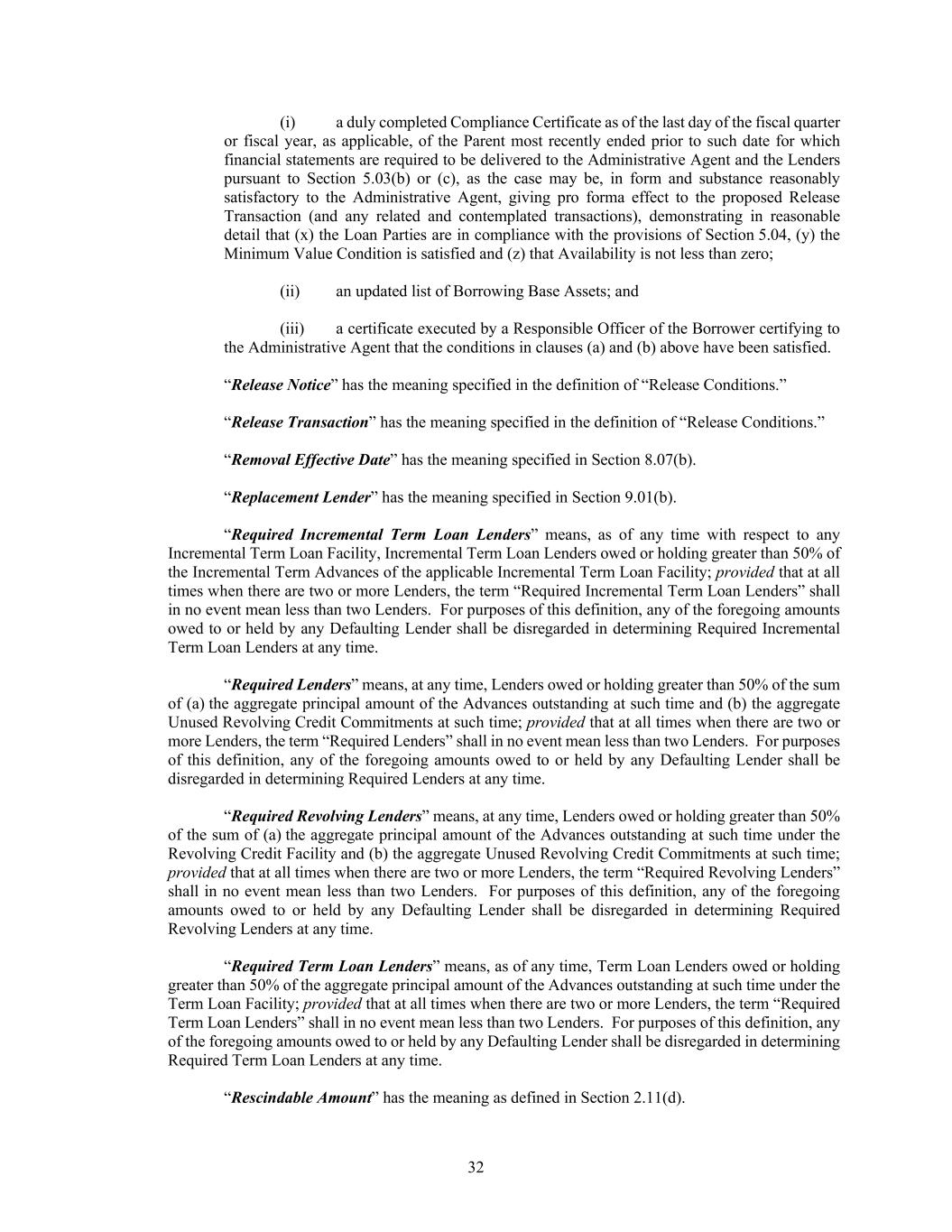 32 (i) a duly completed Compliance Certificate as of the last day of the fiscal quarter or fiscal year, as applicable, of the Parent most recently ended prior to such date for which financial statements are required to be delivered to the Administrative Agent and the Lenders pursuant to Section 5.03(b) or (c), as the case may be, in form and substance reasonably satisfactory to the Administrative Agent, giving pro forma effect to the proposed Release Transaction (and any related and contemplated transactions), demonstrating in reasonable detail that (x) the Loan Parties are in compliance with the provisions of Section 5.04, (y) the Minimum Value Condition is satisfied and (z) that Availability is not less than zero; (ii) an updated list of Borrowing Base Assets; and (iii) a certificate executed by a Responsible Officer of the Borrower certifying to the Administrative Agent that the conditions in clauses (a) and (b) above have been satisfied. “Release Notice” has the meaning specified in the definition of “Release Conditions.” “Release Transaction” has the meaning specified in the definition of “Release Conditions.” “Removal Effective Date” has the meaning specified in Section 8.07(b). “Replacement Lender” has the meaning specified in Section 9.01(b). “Required Incremental Term Loan Lenders” means, as of any time with respect to any Incremental Term Loan Facility, Incremental Term Loan Lenders owed or holding greater than 50% of the Incremental Term Advances of the applicable Incremental Term Loan Facility; provided that at all times when there are two or more Lenders, the term “Required Incremental Term Loan Lenders” shall in no event mean less than two Lenders. For purposes of this definition, any of the foregoing amounts owed to or held by any Defaulting Lender shall be disregarded in determining Required Incremental Term Loan Lenders at any time. “Required Lenders” means, at any time, Lenders owed or holding greater than 50% of the sum of (a) the aggregate principal amount of the Advances outstanding at such time and (b) the aggregate Unused Revolving Credit Commitments at such time; provided that at all times when there are two or more Lenders, the term “Required Lenders” shall in no event mean less than two Lenders. For purposes of this definition, any of the foregoing amounts owed to or held by any Defaulting Lender shall be disregarded in determining Required Lenders at any time. “Required Revolving Lenders” means, at any time, Lenders owed or holding greater than 50% of the sum of (a) the aggregate principal amount of the Advances outstanding at such time under the Revolving Credit Facility and (b) the aggregate Unused Revolving Credit Commitments at such time; provided that at all times when there are two or more Lenders, the term “Required Revolving Lenders” shall in no event mean less than two Lenders. For purposes of this definition, any of the foregoing amounts owed to or held by any Defaulting Lender shall be disregarded in determining Required Revolving Lenders at any time. “Required Term Loan Lenders” means, as of any time, Term Loan Lenders owed or holding greater than 50% of the aggregate principal amount of the Advances outstanding at such time under the Term Loan Facility; provided that at all times when there are two or more Lenders, the term “Required Term Loan Lenders” shall in no event mean less than two Lenders. For purposes of this definition, any of the foregoing amounts owed to or held by any Defaulting Lender shall be disregarded in determining Required Term Loan Lenders at any time. “Rescindable Amount” has the meaning as defined in Section 2.11(d).