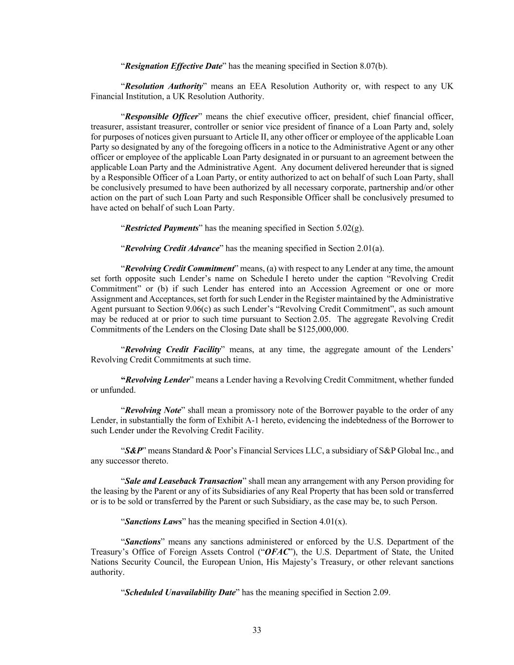33 “Resignation Effective Date” has the meaning specified in Section 8.07(b). “Resolution Authority” means an EEA Resolution Authority or, with respect to any UK Financial Institution, a UK Resolution Authority. “Responsible Officer” means the chief executive officer, president, chief financial officer, treasurer, assistant treasurer, controller or senior vice president of finance of a Loan Party and, solely for purposes of notices given pursuant to Article II, any other officer or employee of the applicable Loan Party so designated by any of the foregoing officers in a notice to the Administrative Agent or any other officer or employee of the applicable Loan Party designated in or pursuant to an agreement between the applicable Loan Party and the Administrative Agent. Any document delivered hereunder that is signed by a Responsible Officer of a Loan Party, or entity authorized to act on behalf of such Loan Party, shall be conclusively presumed to have been authorized by all necessary corporate, partnership and/or other action on the part of such Loan Party and such Responsible Officer shall be conclusively presumed to have acted on behalf of such Loan Party. “Restricted Payments” has the meaning specified in Section 5.02(g). “Revolving Credit Advance” has the meaning specified in Section 2.01(a). “Revolving Credit Commitment” means, (a) with respect to any Lender at any time, the amount set forth opposite such Lender’s name on Schedule I hereto under the caption “Revolving Credit Commitment” or (b) if such Lender has entered into an Accession Agreement or one or more Assignment and Acceptances, set forth for such Lender in the Register maintained by the Administrative Agent pursuant to Section 9.06(c) as such Lender’s “Revolving Credit Commitment”, as such amount may be reduced at or prior to such time pursuant to Section 2.05. The aggregate Revolving Credit Commitments of the Lenders on the Closing Date shall be $125,000,000. “Revolving Credit Facility” means, at any time, the aggregate amount of the Lenders’ Revolving Credit Commitments at such time. “Revolving Lender” means a Lender having a Revolving Credit Commitment, whether funded or unfunded. “Revolving Note” shall mean a promissory note of the Borrower payable to the order of any Lender, in substantially the form of Exhibit A-1 hereto, evidencing the indebtedness of the Borrower to such Lender under the Revolving Credit Facility. “S&P” means Standard & Poor’s Financial Services LLC, a subsidiary of S&P Global Inc., and any successor thereto. “Sale and Leaseback Transaction” shall mean any arrangement with any Person providing for the leasing by the Parent or any of its Subsidiaries of any Real Property that has been sold or transferred or is to be sold or transferred by the Parent or such Subsidiary, as the case may be, to such Person. “Sanctions Laws” has the meaning specified in Section 4.01(x). “Sanctions” means any sanctions administered or enforced by the U.S. Department of the Treasury’s Office of Foreign Assets Control (“OFAC”), the U.S. Department of State, the United Nations Security Council, the European Union, His Majesty’s Treasury, or other relevant sanctions authority. “Scheduled Unavailability Date” has the meaning specified in Section 2.09.
