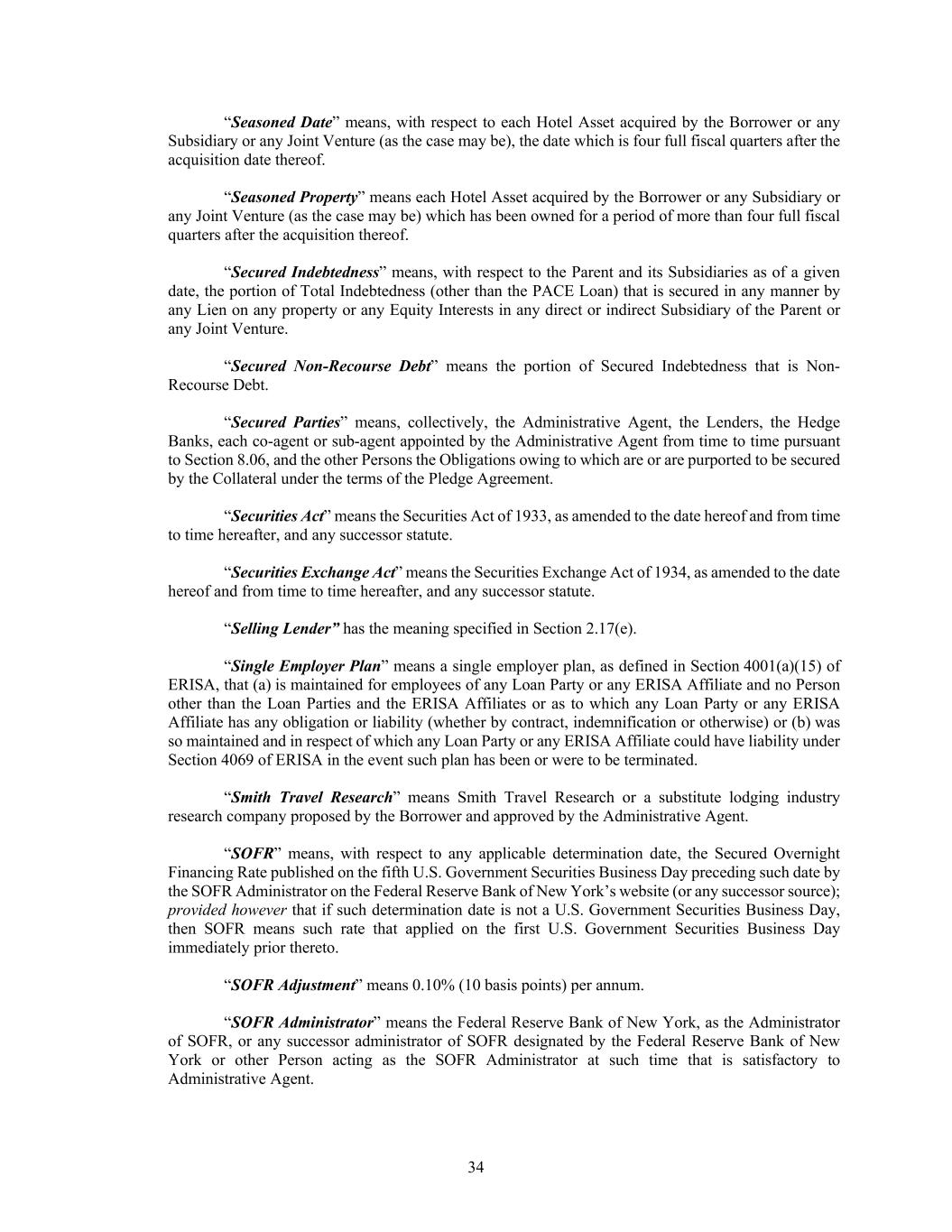 34 “Seasoned Date” means, with respect to each Hotel Asset acquired by the Borrower or any Subsidiary or any Joint Venture (as the case may be), the date which is four full fiscal quarters after the acquisition date thereof. “Seasoned Property” means each Hotel Asset acquired by the Borrower or any Subsidiary or any Joint Venture (as the case may be) which has been owned for a period of more than four full fiscal quarters after the acquisition thereof. “Secured Indebtedness” means, with respect to the Parent and its Subsidiaries as of a given date, the portion of Total Indebtedness (other than the PACE Loan) that is secured in any manner by any Lien on any property or any Equity Interests in any direct or indirect Subsidiary of the Parent or any Joint Venture. “Secured Non-Recourse Debt” means the portion of Secured Indebtedness that is Non- Recourse Debt. “Secured Parties” means, collectively, the Administrative Agent, the Lenders, the Hedge Banks, each co-agent or sub-agent appointed by the Administrative Agent from time to time pursuant to Section 8.06, and the other Persons the Obligations owing to which are or are purported to be secured by the Collateral under the terms of the Pledge Agreement. “Securities Act” means the Securities Act of 1933, as amended to the date hereof and from time to time hereafter, and any successor statute. “Securities Exchange Act” means the Securities Exchange Act of 1934, as amended to the date hereof and from time to time hereafter, and any successor statute. “Selling Lender” has the meaning specified in Section 2.17(e). “Single Employer Plan” means a single employer plan, as defined in Section 4001(a)(15) of ERISA, that (a) is maintained for employees of any Loan Party or any ERISA Affiliate and no Person other than the Loan Parties and the ERISA Affiliates or as to which any Loan Party or any ERISA Affiliate has any obligation or liability (whether by contract, indemnification or otherwise) or (b) was so maintained and in respect of which any Loan Party or any ERISA Affiliate could have liability under Section 4069 of ERISA in the event such plan has been or were to be terminated. “Smith Travel Research” means Smith Travel Research or a substitute lodging industry research company proposed by the Borrower and approved by the Administrative Agent. “SOFR” means, with respect to any applicable determination date, the Secured Overnight Financing Rate published on the fifth U.S. Government Securities Business Day preceding such date by the SOFR Administrator on the Federal Reserve Bank of New York’s website (or any successor source); provided however that if such determination date is not a U.S. Government Securities Business Day, then SOFR means such rate that applied on the first U.S. Government Securities Business Day immediately prior thereto. “SOFR Adjustment” means 0.10% (10 basis points) per annum. “SOFR Administrator” means the Federal Reserve Bank of New York, as the Administrator of SOFR, or any successor administrator of SOFR designated by the Federal Reserve Bank of New York or other Person acting as the SOFR Administrator at such time that is satisfactory to Administrative Agent.