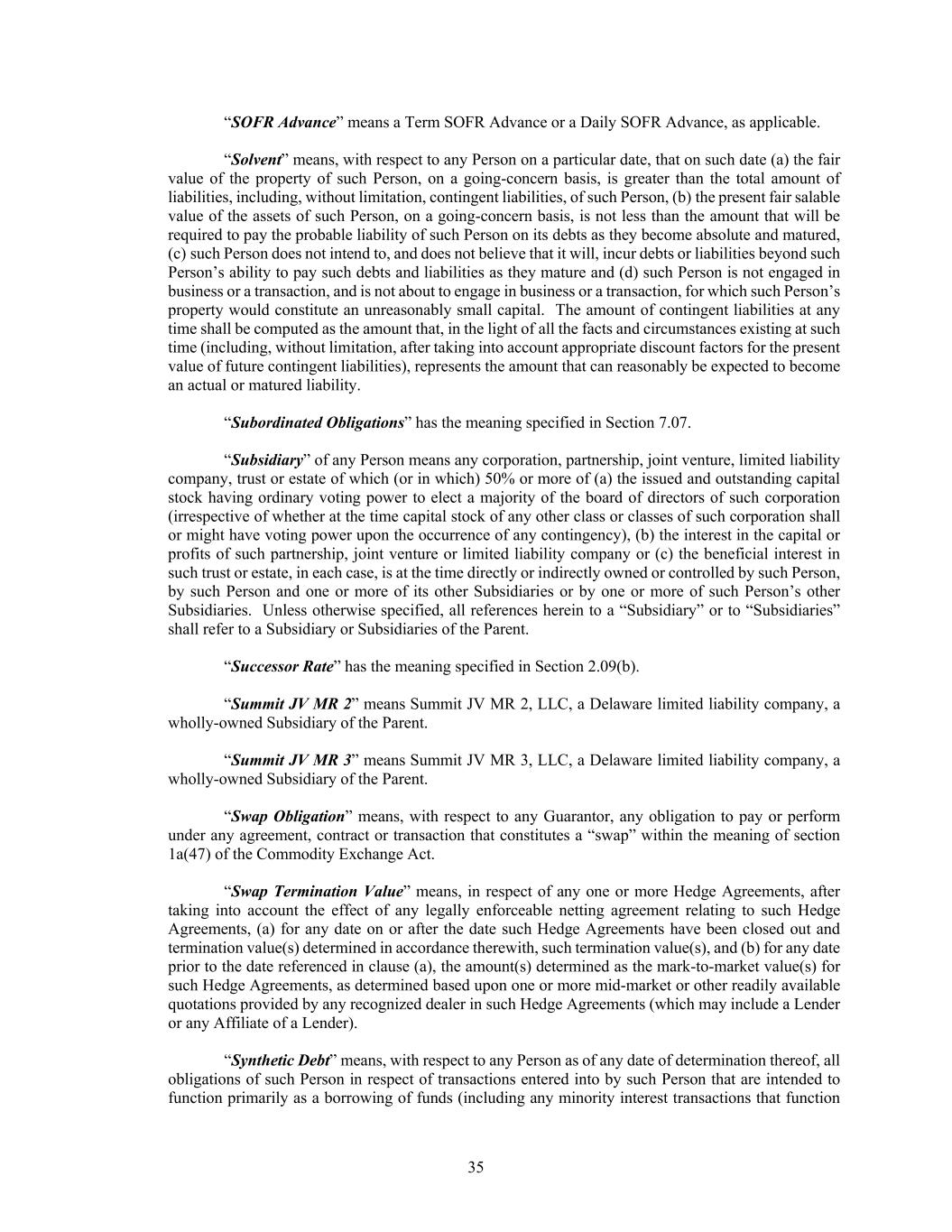 35 “SOFR Advance” means a Term SOFR Advance or a Daily SOFR Advance, as applicable. “Solvent” means, with respect to any Person on a particular date, that on such date (a) the fair value of the property of such Person, on a going-concern basis, is greater than the total amount of liabilities, including, without limitation, contingent liabilities, of such Person, (b) the present fair salable value of the assets of such Person, on a going-concern basis, is not less than the amount that will be required to pay the probable liability of such Person on its debts as they become absolute and matured, (c) such Person does not intend to, and does not believe that it will, incur debts or liabilities beyond such Person’s ability to pay such debts and liabilities as they mature and (d) such Person is not engaged in business or a transaction, and is not about to engage in business or a transaction, for which such Person’s property would constitute an unreasonably small capital. The amount of contingent liabilities at any time shall be computed as the amount that, in the light of all the facts and circumstances existing at such time (including, without limitation, after taking into account appropriate discount factors for the present value of future contingent liabilities), represents the amount that can reasonably be expected to become an actual or matured liability. “Subordinated Obligations” has the meaning specified in Section 7.07. “Subsidiary” of any Person means any corporation, partnership, joint venture, limited liability company, trust or estate of which (or in which) 50% or more of (a) the issued and outstanding capital stock having ordinary voting power to elect a majority of the board of directors of such corporation (irrespective of whether at the time capital stock of any other class or classes of such corporation shall or might have voting power upon the occurrence of any contingency), (b) the interest in the capital or profits of such partnership, joint venture or limited liability company or (c) the beneficial interest in such trust or estate, in each case, is at the time directly or indirectly owned or controlled by such Person, by such Person and one or more of its other Subsidiaries or by one or more of such Person’s other Subsidiaries. Unless otherwise specified, all references herein to a “Subsidiary” or to “Subsidiaries” shall refer to a Subsidiary or Subsidiaries of the Parent. “Successor Rate” has the meaning specified in Section 2.09(b). “Summit JV MR 2” means Summit JV MR 2, LLC, a Delaware limited liability company, a wholly-owned Subsidiary of the Parent. “Summit JV MR 3” means Summit JV MR 3, LLC, a Delaware limited liability company, a wholly-owned Subsidiary of the Parent. “Swap Obligation” means, with respect to any Guarantor, any obligation to pay or perform under any agreement, contract or transaction that constitutes a “swap” within the meaning of section 1a(47) of the Commodity Exchange Act. “Swap Termination Value” means, in respect of any one or more Hedge Agreements, after taking into account the effect of any legally enforceable netting agreement relating to such Hedge Agreements, (a) for any date on or after the date such Hedge Agreements have been closed out and termination value(s) determined in accordance therewith, such termination value(s), and (b) for any date prior to the date referenced in clause (a), the amount(s) determined as the mark-to-market value(s) for such Hedge Agreements, as determined based upon one or more mid-market or other readily available quotations provided by any recognized dealer in such Hedge Agreements (which may include a Lender or any Affiliate of a Lender). “Synthetic Debt” means, with respect to any Person as of any date of determination thereof, all obligations of such Person in respect of transactions entered into by such Person that are intended to function primarily as a borrowing of funds (including any minority interest transactions that function