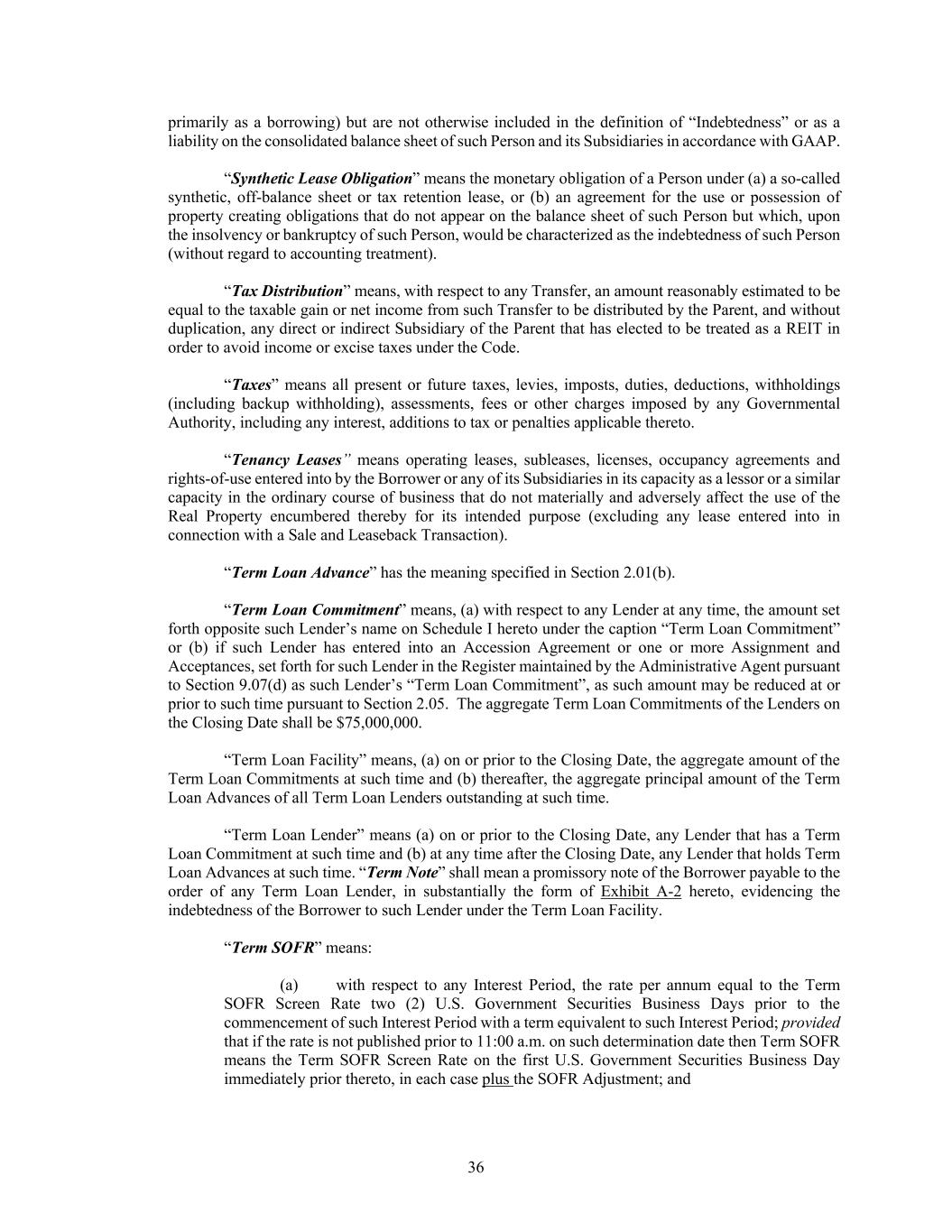 36 primarily as a borrowing) but are not otherwise included in the definition of “Indebtedness” or as a liability on the consolidated balance sheet of such Person and its Subsidiaries in accordance with GAAP. “Synthetic Lease Obligation” means the monetary obligation of a Person under (a) a so-called synthetic, off-balance sheet or tax retention lease, or (b) an agreement for the use or possession of property creating obligations that do not appear on the balance sheet of such Person but which, upon the insolvency or bankruptcy of such Person, would be characterized as the indebtedness of such Person (without regard to accounting treatment). “Tax Distribution” means, with respect to any Transfer, an amount reasonably estimated to be equal to the taxable gain or net income from such Transfer to be distributed by the Parent, and without duplication, any direct or indirect Subsidiary of the Parent that has elected to be treated as a REIT in order to avoid income or excise taxes under the Code. “Taxes” means all present or future taxes, levies, imposts, duties, deductions, withholdings (including backup withholding), assessments, fees or other charges imposed by any Governmental Authority, including any interest, additions to tax or penalties applicable thereto. “Tenancy Leases” means operating leases, subleases, licenses, occupancy agreements and rights-of-use entered into by the Borrower or any of its Subsidiaries in its capacity as a lessor or a similar capacity in the ordinary course of business that do not materially and adversely affect the use of the Real Property encumbered thereby for its intended purpose (excluding any lease entered into in connection with a Sale and Leaseback Transaction). “Term Loan Advance” has the meaning specified in Section 2.01(b). “Term Loan Commitment” means, (a) with respect to any Lender at any time, the amount set forth opposite such Lender’s name on Schedule I hereto under the caption “Term Loan Commitment” or (b) if such Lender has entered into an Accession Agreement or one or more Assignment and Acceptances, set forth for such Lender in the Register maintained by the Administrative Agent pursuant to Section 9.07(d) as such Lender’s “Term Loan Commitment”, as such amount may be reduced at or prior to such time pursuant to Section 2.05. The aggregate Term Loan Commitments of the Lenders on the Closing Date shall be $75,000,000. “Term Loan Facility” means, (a) on or prior to the Closing Date, the aggregate amount of the Term Loan Commitments at such time and (b) thereafter, the aggregate principal amount of the Term Loan Advances of all Term Loan Lenders outstanding at such time. “Term Loan Lender” means (a) on or prior to the Closing Date, any Lender that has a Term Loan Commitment at such time and (b) at any time after the Closing Date, any Lender that holds Term Loan Advances at such time. “Term Note” shall mean a promissory note of the Borrower payable to the order of any Term Loan Lender, in substantially the form of Exhibit A-2 hereto, evidencing the indebtedness of the Borrower to such Lender under the Term Loan Facility. “Term SOFR” means: (a) with respect to any Interest Period, the rate per annum equal to the Term SOFR Screen Rate two (2) U.S. Government Securities Business Days prior to the commencement of such Interest Period with a term equivalent to such Interest Period; provided that if the rate is not published prior to 11:00 a.m. on such determination date then Term SOFR means the Term SOFR Screen Rate on the first U.S. Government Securities Business Day immediately prior thereto, in each case plus the SOFR Adjustment; and